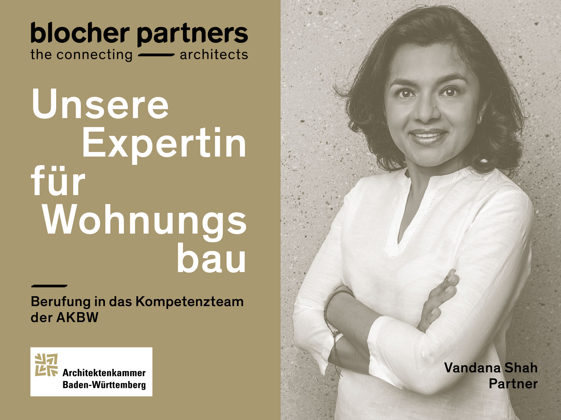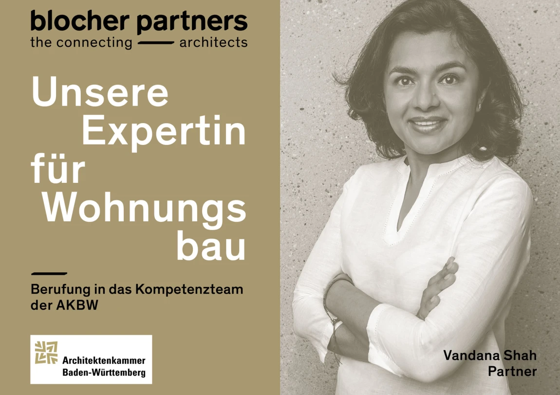 The state board of the Baden-Württemberg Chamber of Architects has appointed our partner Vandana Shah to the AKBW's Housing Competence Team, which has 32 members and is dedicated to the main topic of "Housing, Neighborhoods, Services of General Interest" and the tasks set by the state board: the development of a position paper on the immediate program for housing subsidies and affordable housing, as well as housing in the neighborhood, which is to move more strongly into the public consciousness with a view to the local elections in 2024.