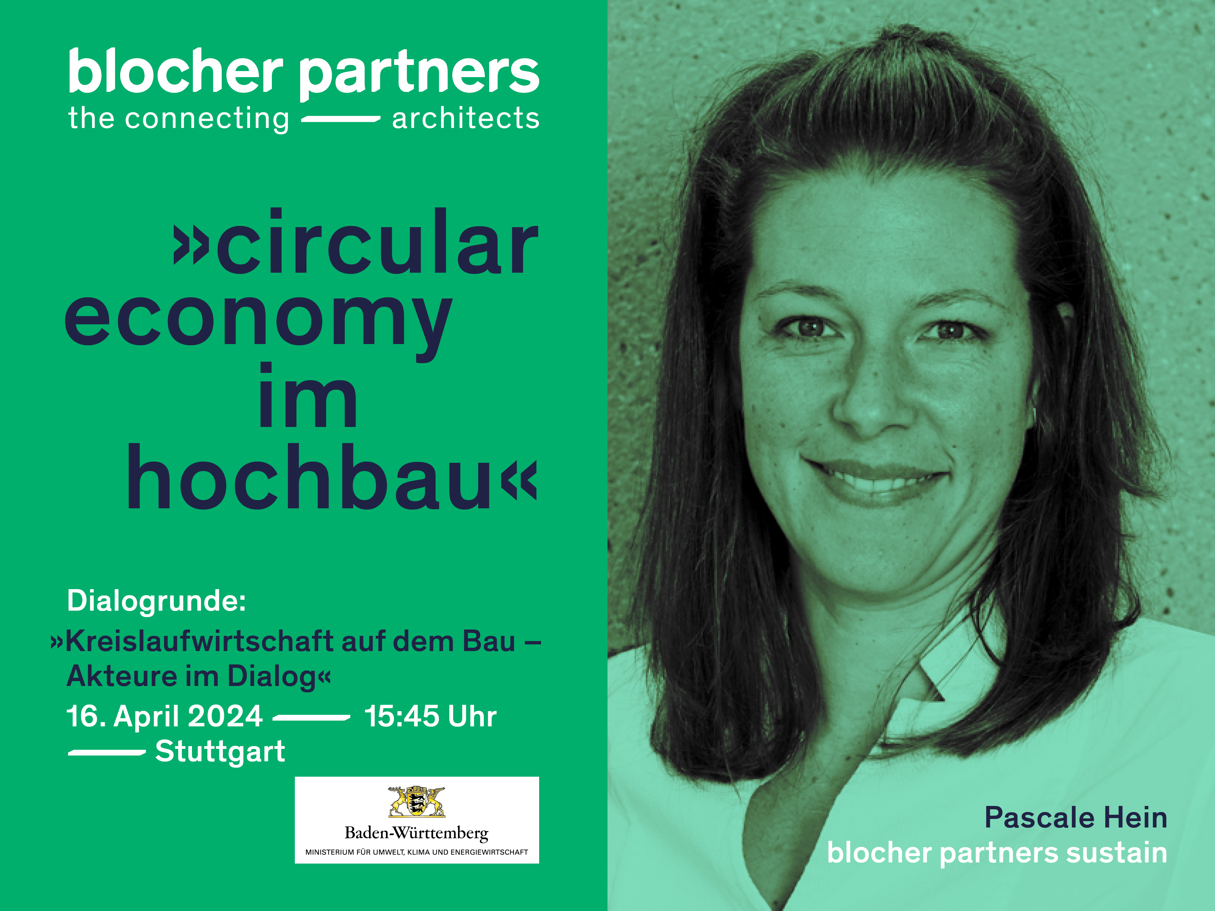 On behalf of the Baden-Württemberg Ministry of the Environment, the Institute for Energy and Environmental Research Heidelberg (ifeu) and the Baden-Württemberg Chamber of Architects are hosting the symposium »Circular Economy in Building Construction – Building and Designing Together in a Circular Way« in Stuttgart on 16 April. As part of the afternoon dialogue round, Pascale Hein, Managing Director of blocher partners sustain, will reflect with other planners, clients and players from the construction industry on how the many good approaches and solutions can be transferred more quickly and comprehensively into construction practice.
