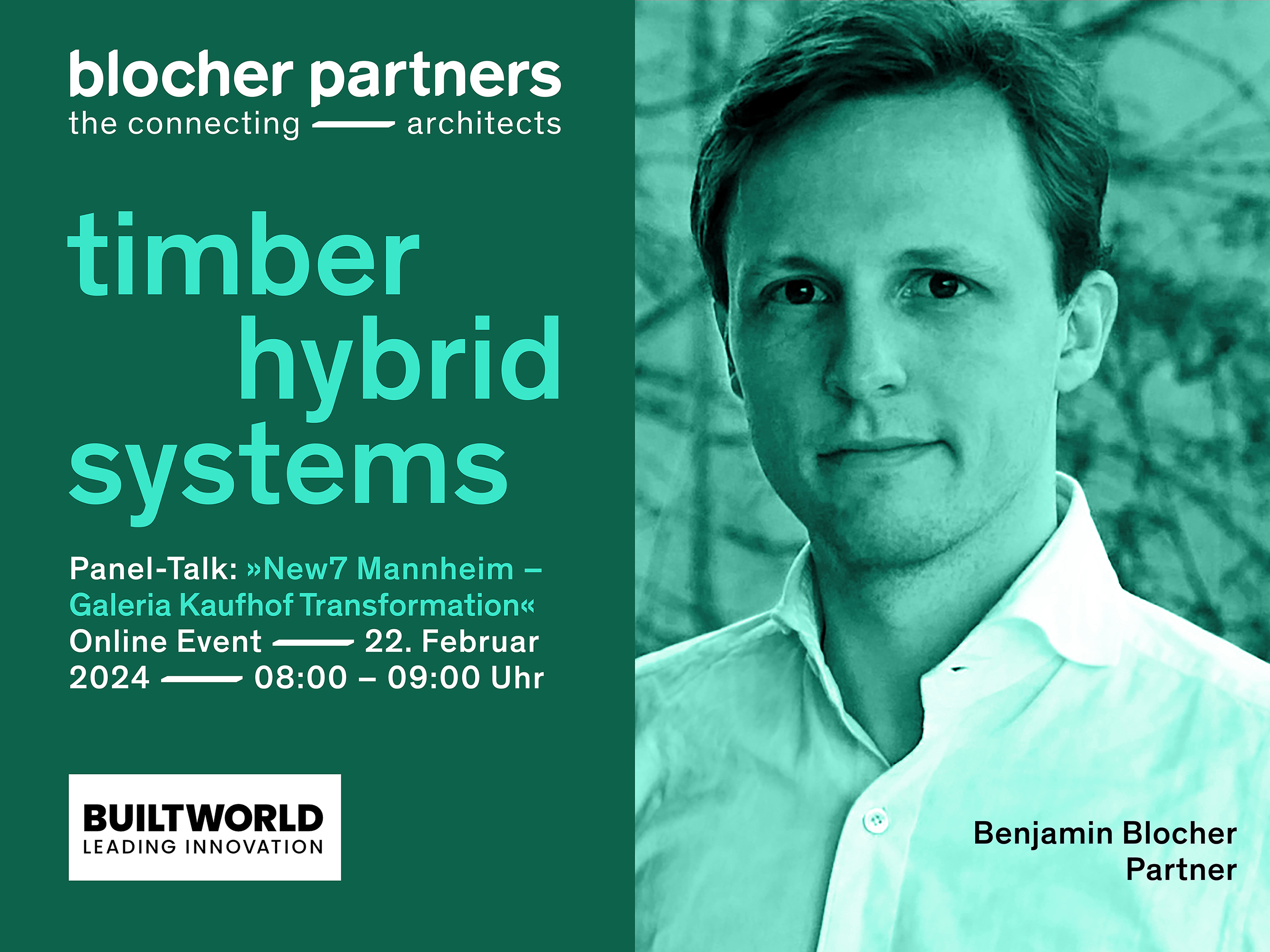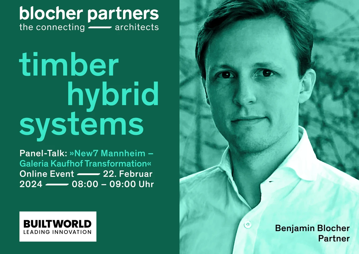 The online event organised by the BUILTWORLD event platform is dedicated to the topic of inner-city transformation and new urbanity in Mannheim. The project New7, the former Galeria Kaufhof building, which blocher partners is transforming into a sustainable mixed-use project together with Diringer & Scheidel as project developer, client and general contractor, serves as an example of the adaptation of urban spaces to the changing needs of the population.