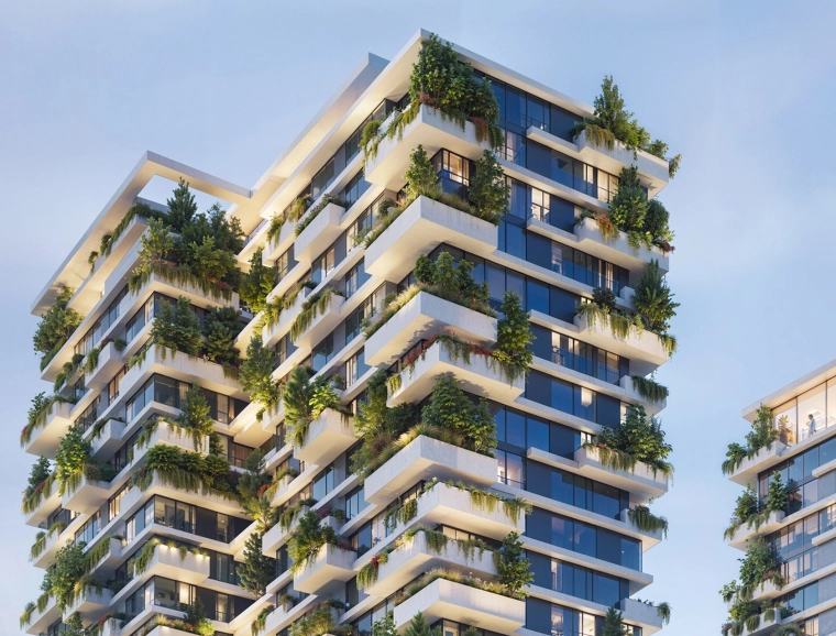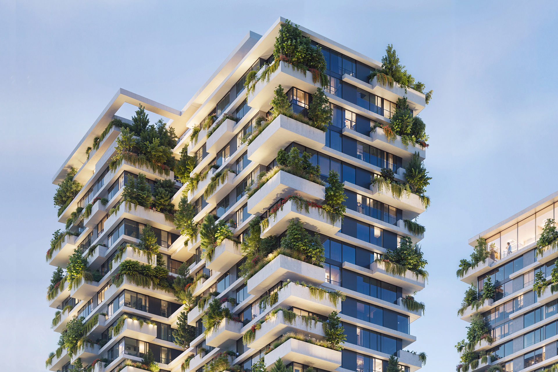 The dynamically designed façade of the residential floors gives the building an iconic character. The façade bands, with their protruding balconies, appear to be artfully woven around the building. This design creates ever-changing views from different angles, giving the building a vibrant appearance. This animated structure is supported by the integrated green concept.