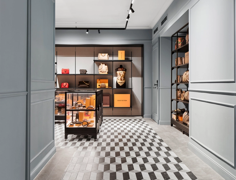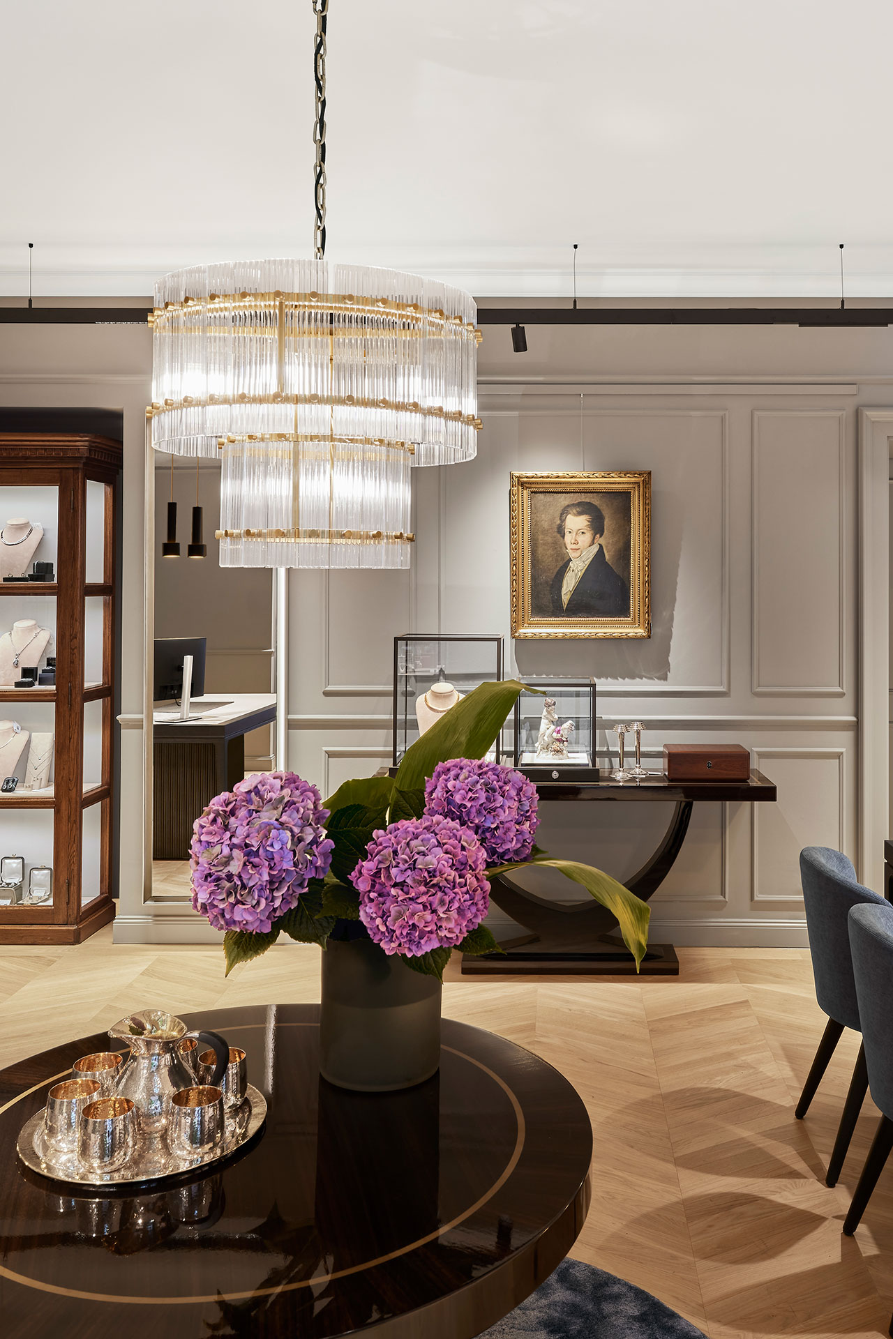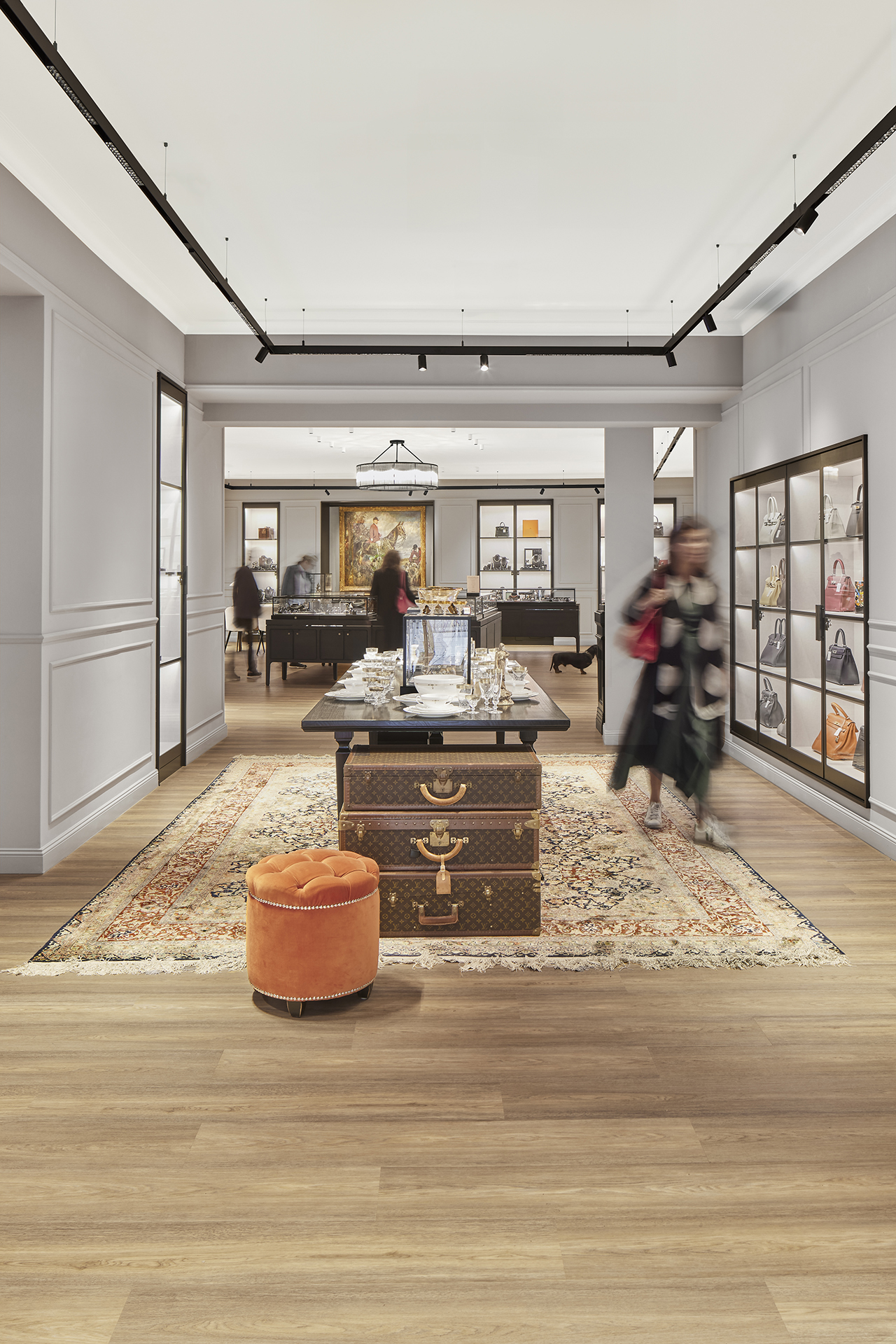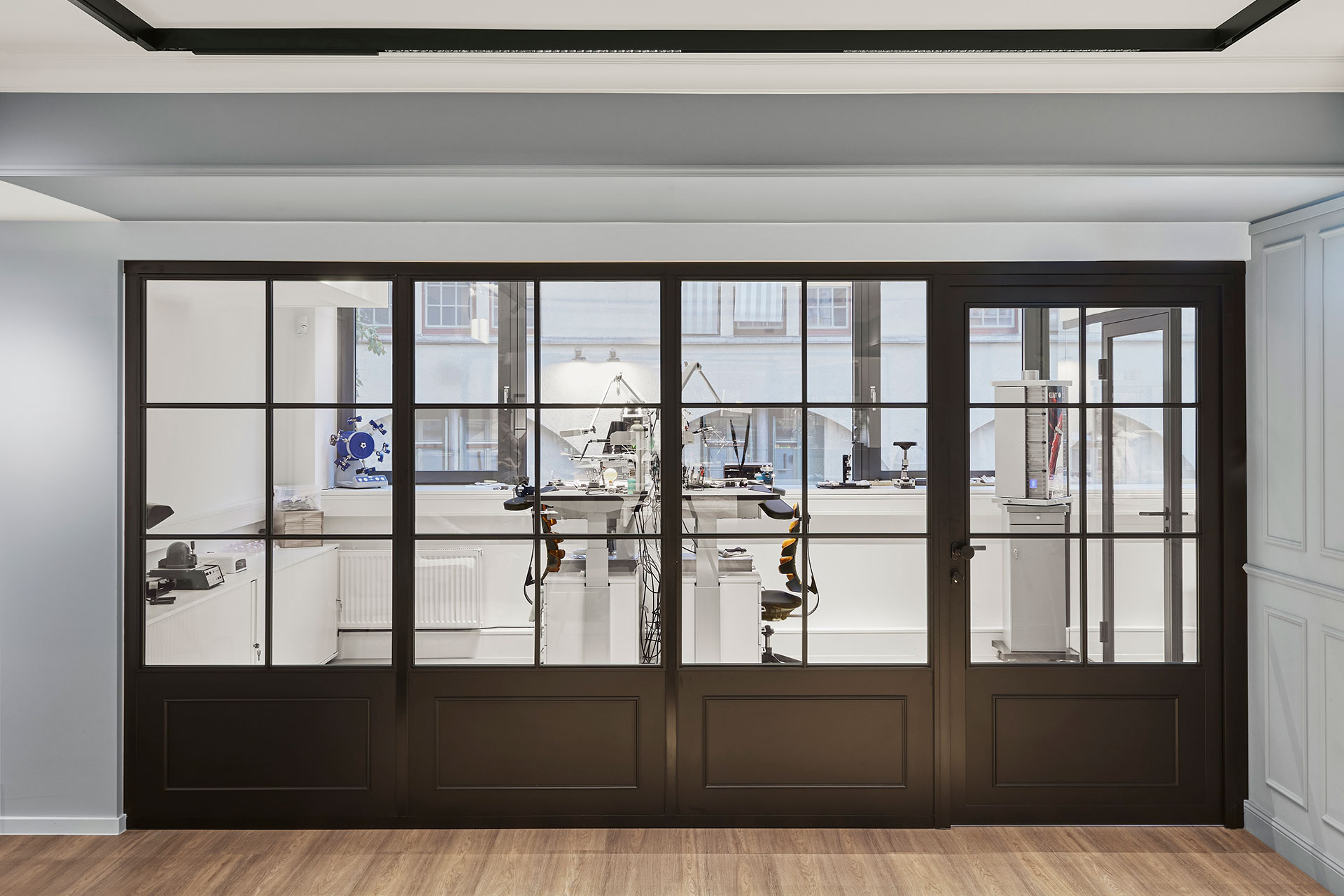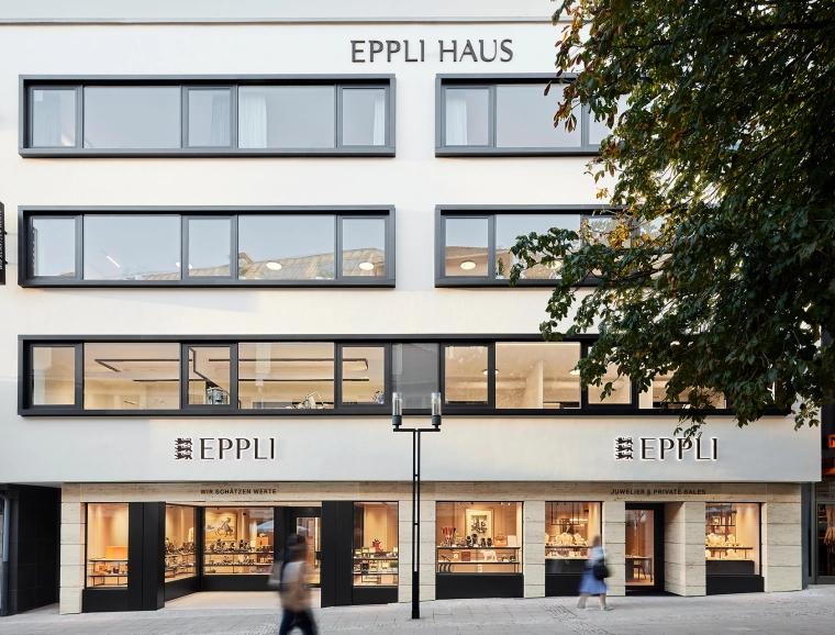 The interiors combine classic Eppli elements with modern accents. Authentic materials such as stucco, carpets, and antique furniture meet elegant surfaces and contemporary details. Accent colors such as blue in the fashion area and warm gray tones characterize the design. Craft workshops for watchmakers and goldsmiths are visibly integrated, celebrating the company's craftsmanship.