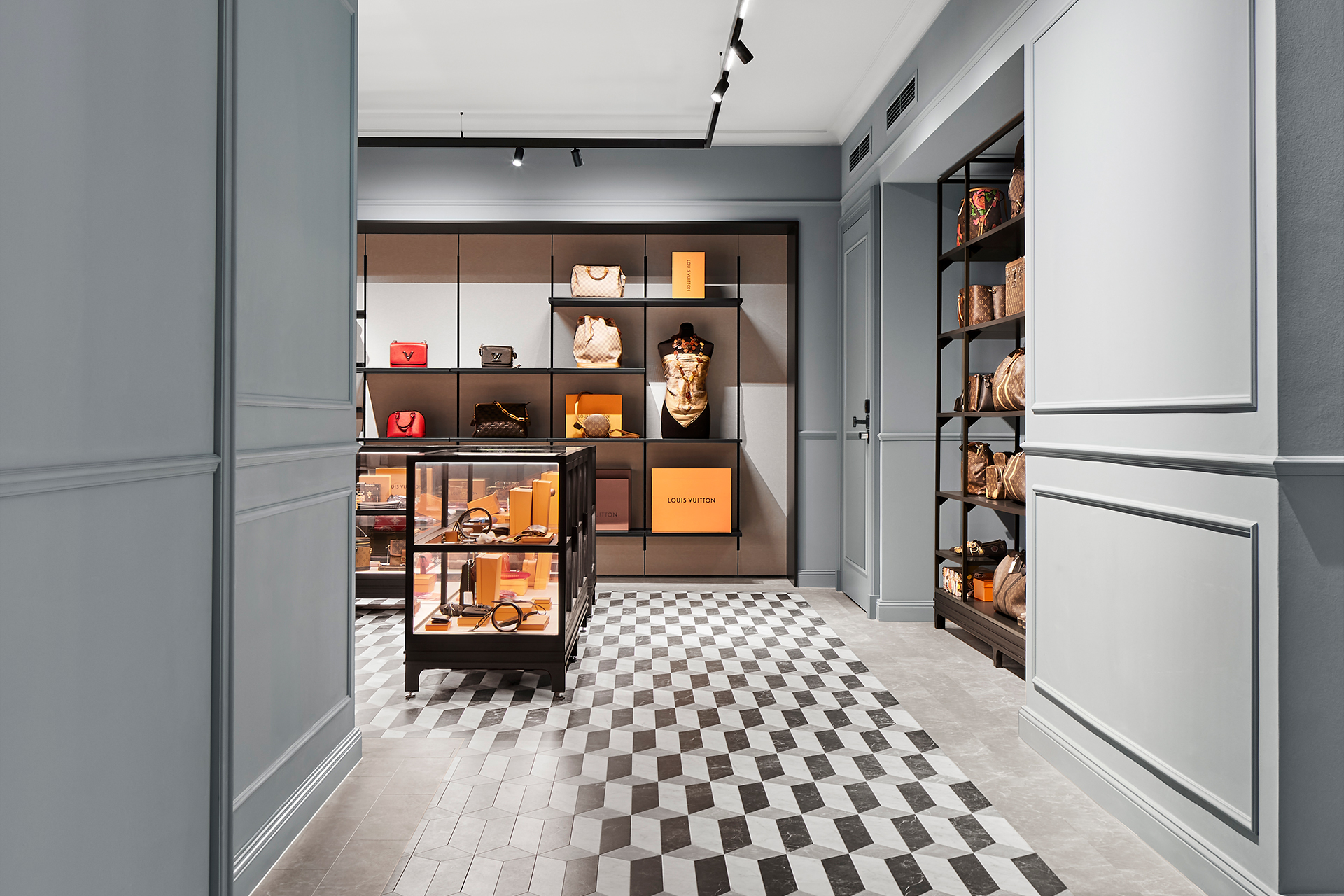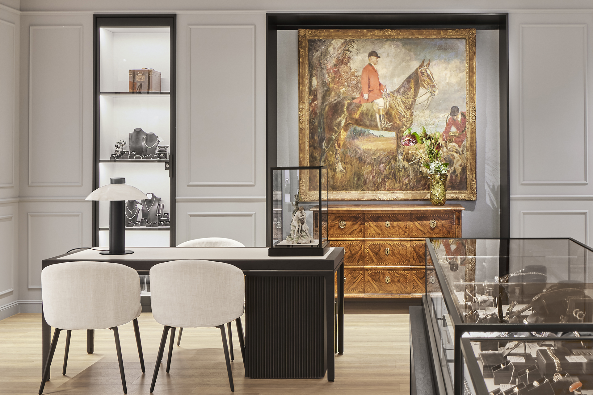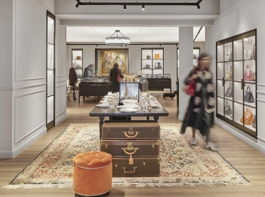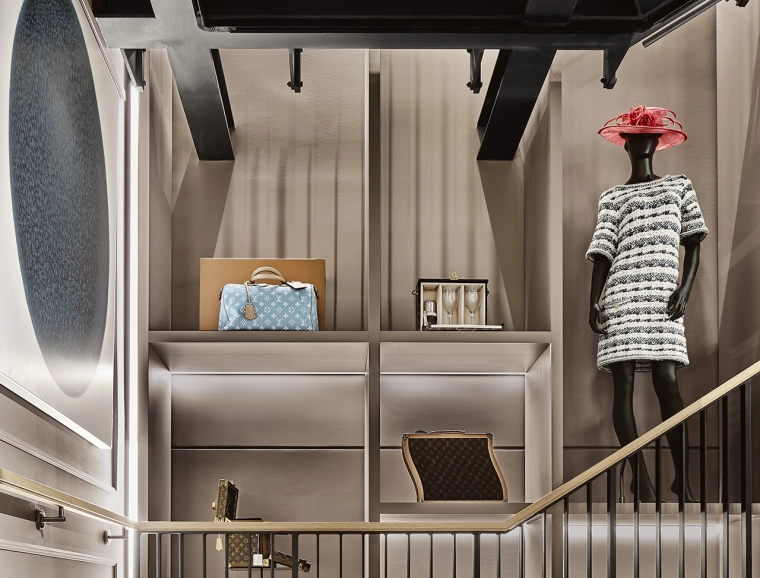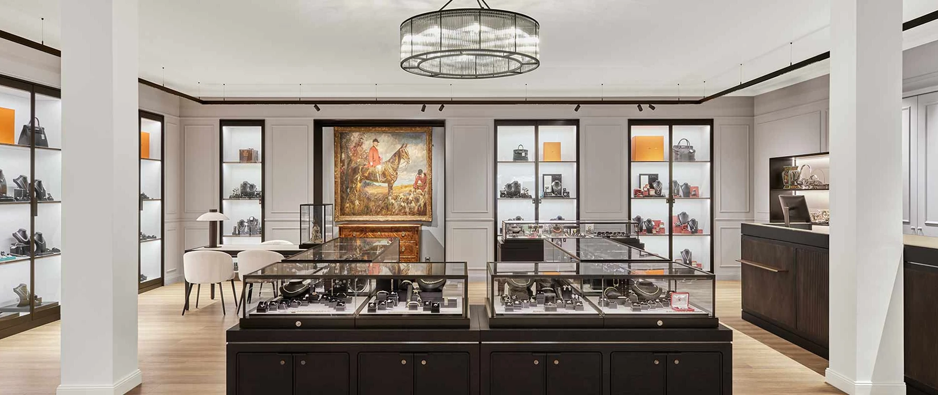 The interiors combine classic Eppli elements with modern accents. Authentic materials such as stucco, carpets, and antique furniture meet elegant surfaces and contemporary details. Accent colors such as blue in the fashion area and warm gray tones characterize the design. Craft workshops for watchmakers and goldsmiths are visibly integrated, celebrating the company's craftsmanship.