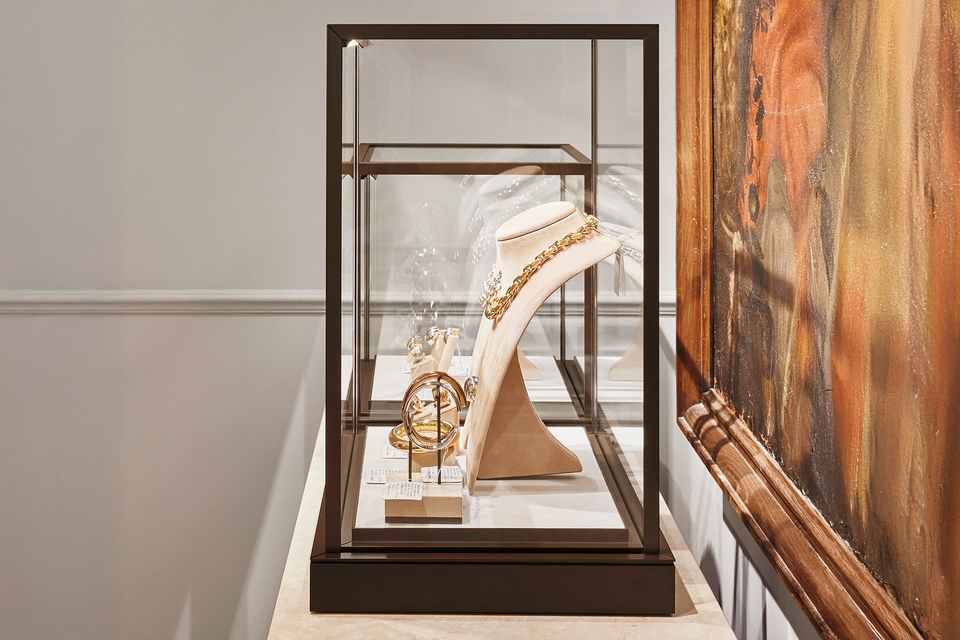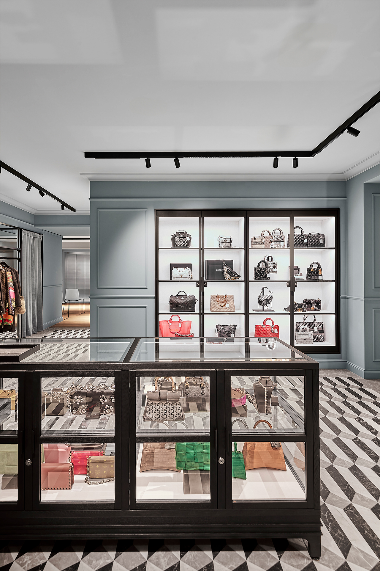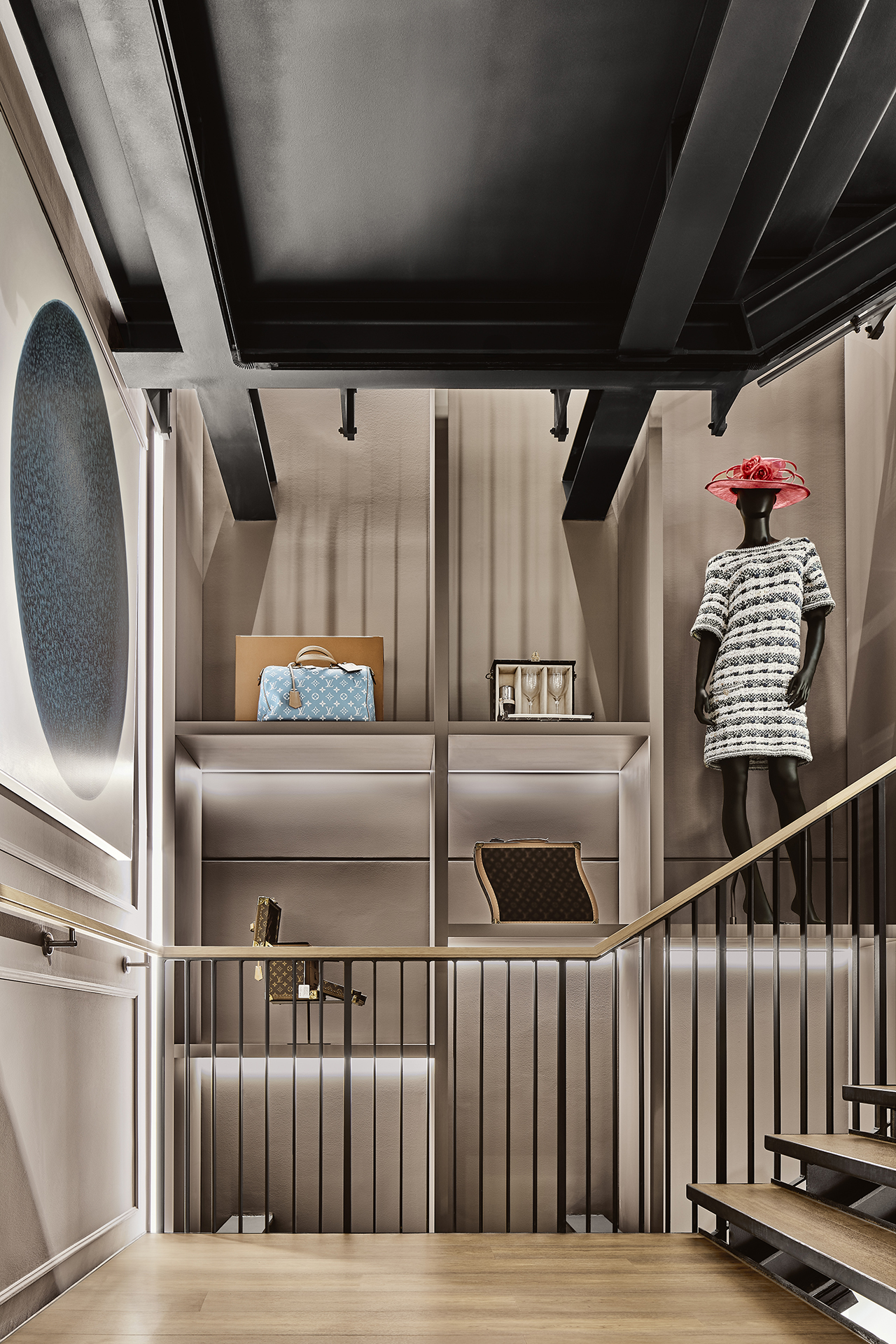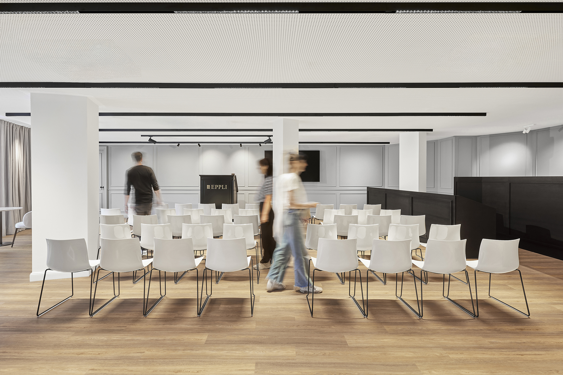 The interiors combine classic Eppli elements with modern accents. Authentic materials such as stucco, carpets, and antique furniture meet elegant surfaces and contemporary details. Accent colors such as blue in the fashion area and warm gray tones characterize the design. Craft workshops for watchmakers and goldsmiths are visibly integrated, celebrating the company's craftsmanship.