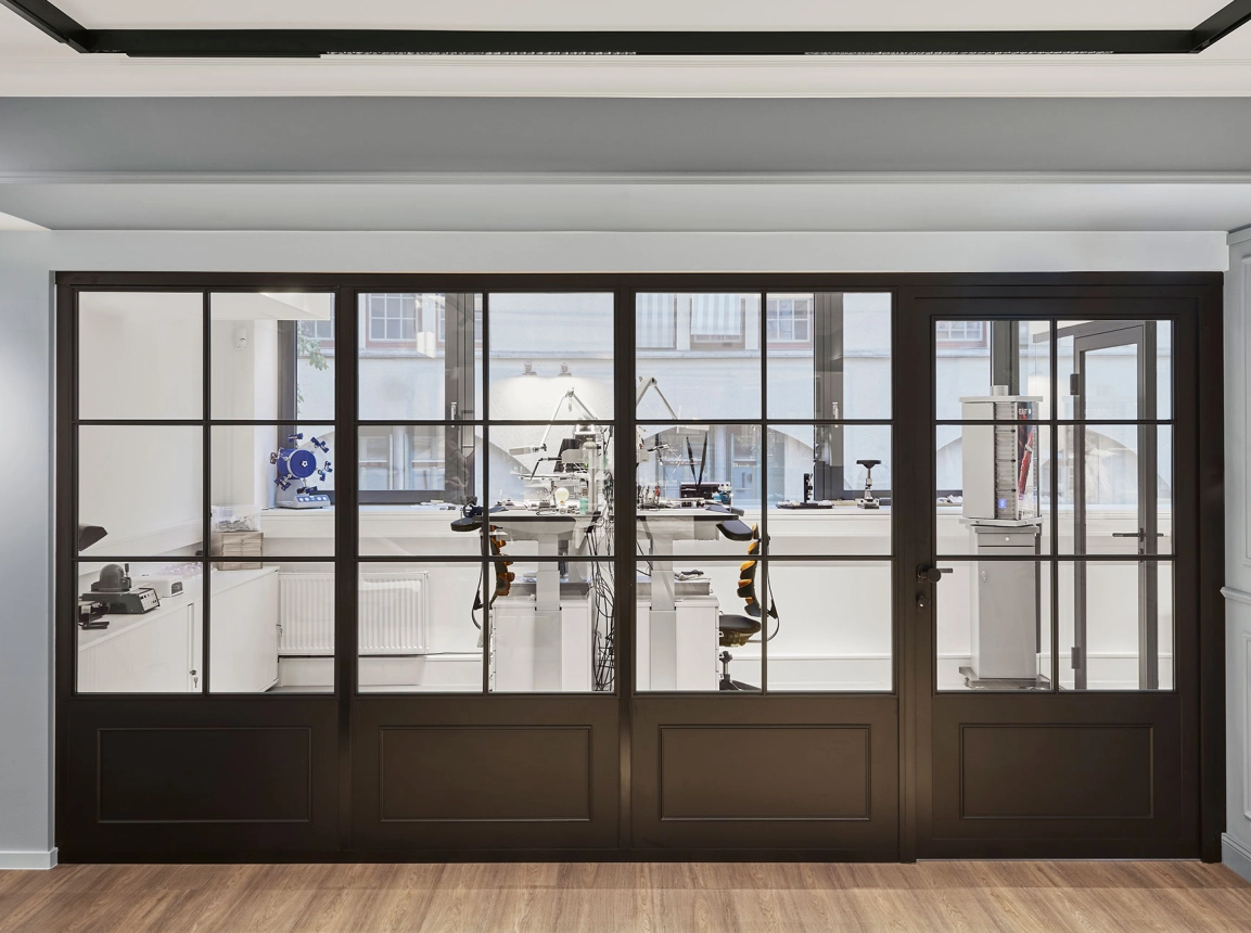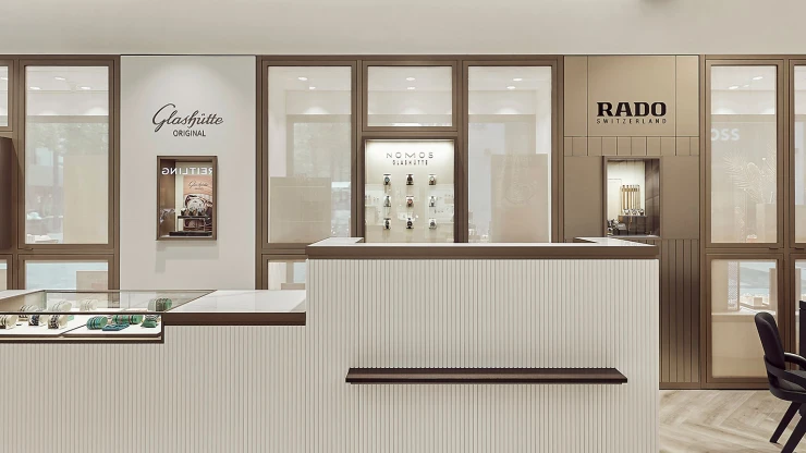 The interiors combine classic Eppli elements with modern accents. Authentic materials such as stucco, carpets, and antique furniture meet elegant surfaces and contemporary details. Accent colors such as blue in the fashion area and warm gray tones characterize the design. Craft workshops for watchmakers and goldsmiths are visibly integrated, celebrating the company's craftsmanship.