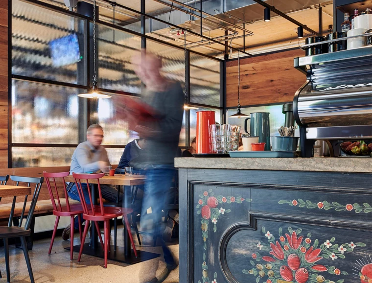 As part of blocher partners’ new construction, reconstruction and extension of the Schuster sports store in Munich, the gourmet Alpina Bar was born. Located right next to the Rindermarkt, the restaurant features modern design elements – including exposed concrete and industrial glazing along with historic enamel lamps, oak tables and wood-panelled walls – that create an inviting space for guests. A black monolith of sea pine surrounds the kitchen and an eye-catching fresco painting circles the bar. Cut into the monolith is the wood-panelled Gute Stube, a separate sitting area. Since 1996, blocher partners has been collaborating with Schuster. Its accomplishments include the new construction, reconstruction and expansion of the sporting good store in 2018.