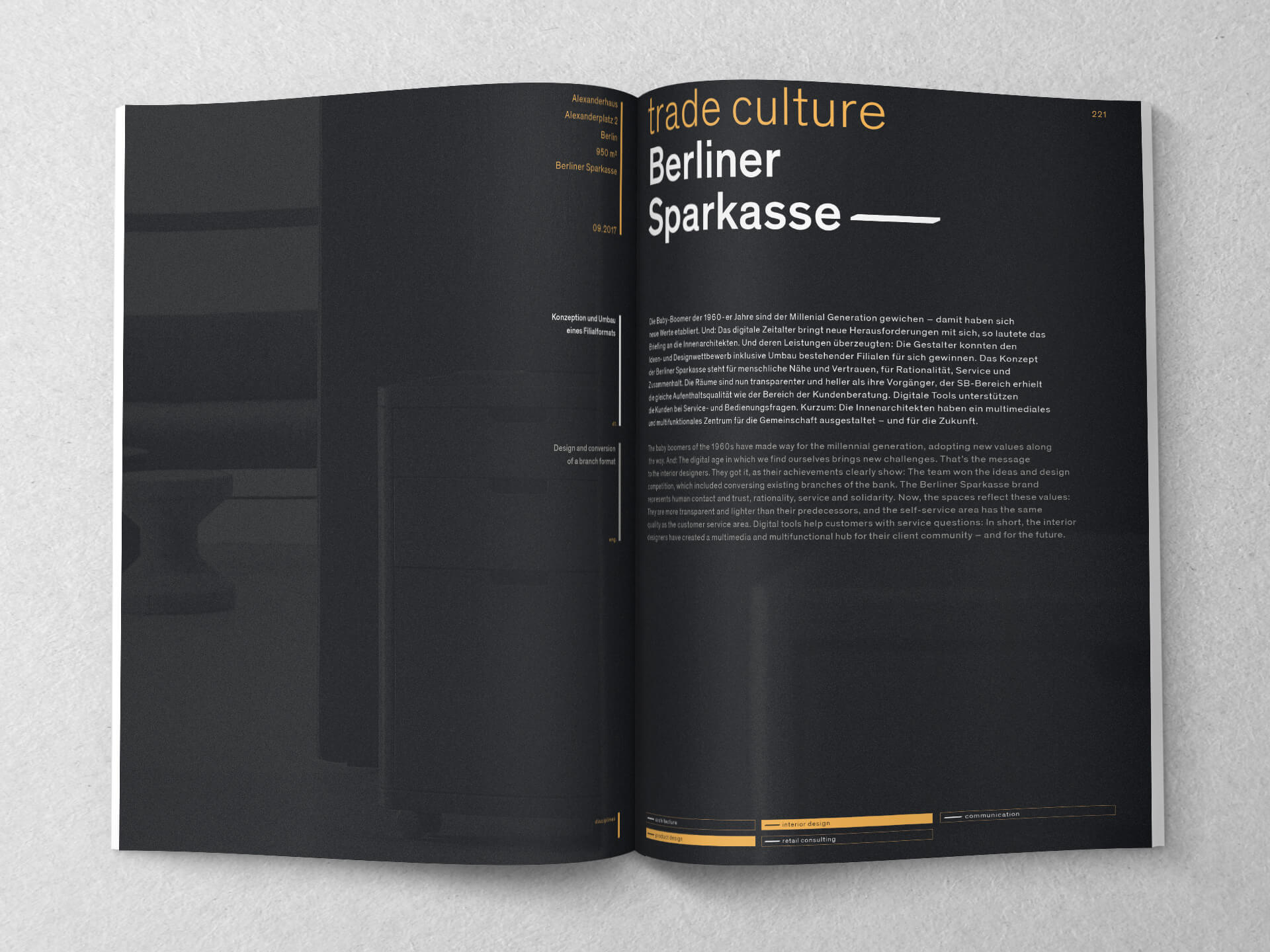 Key topics of this 240-page-tome are mobility, future trends and transdisciplinarity - being highlighted in 41 shown projects and also discussed in six essays. The contents are diverse and range from city development, future trends in retail and the evolution from offices to identity-creating rooms.