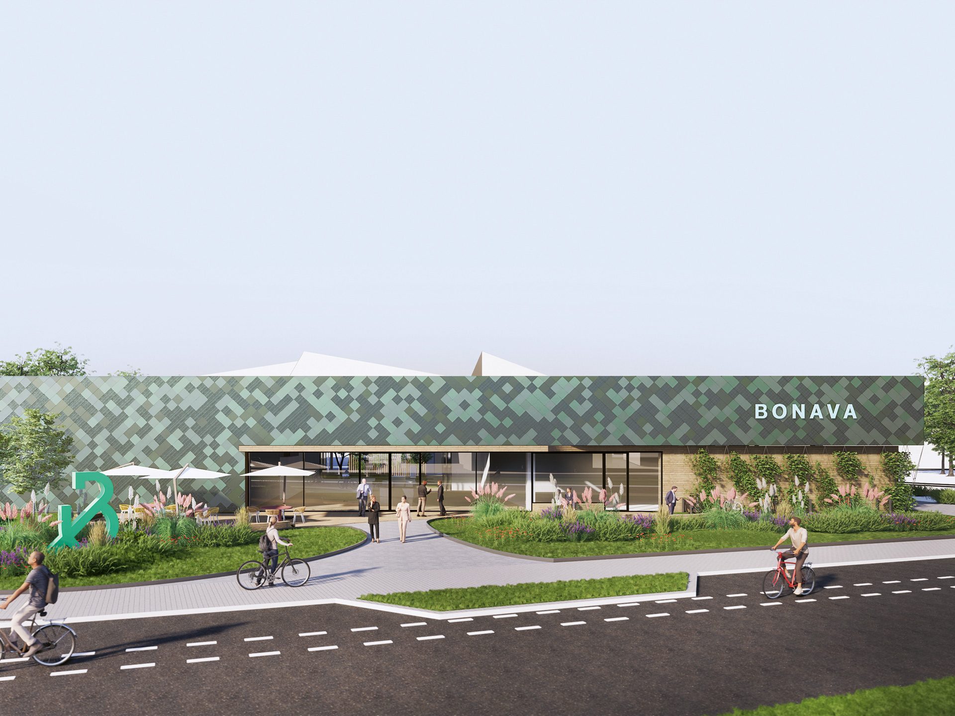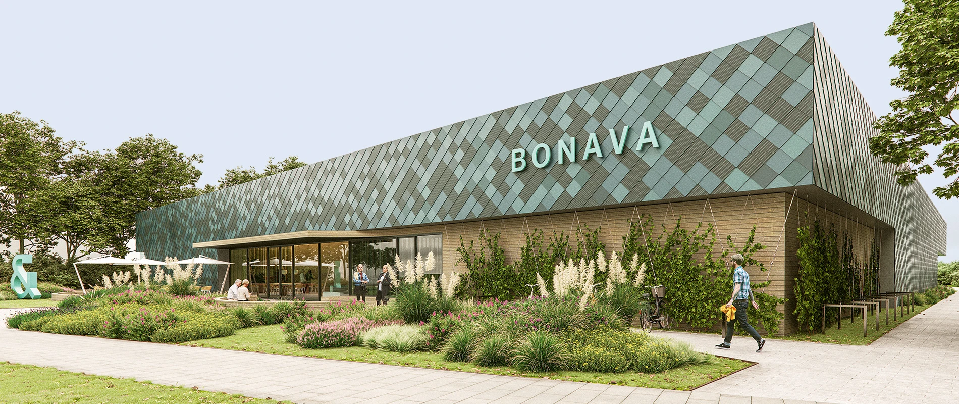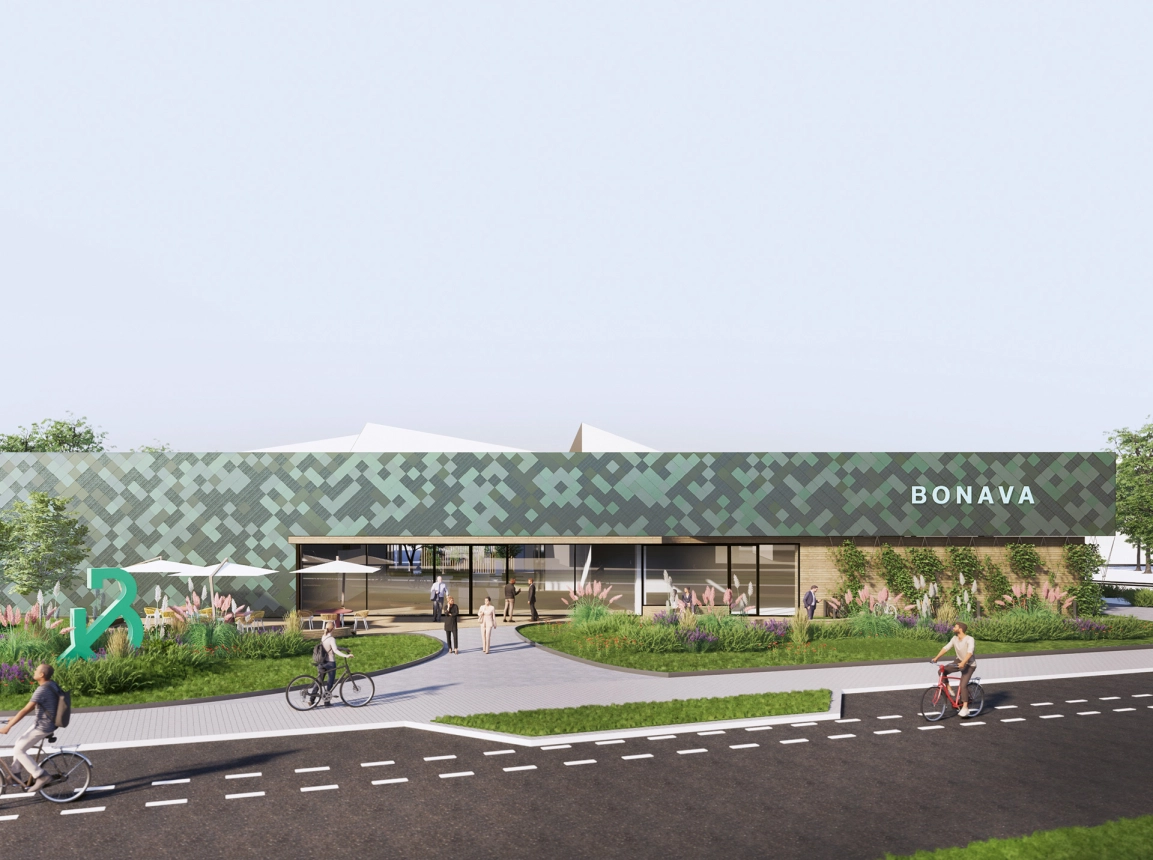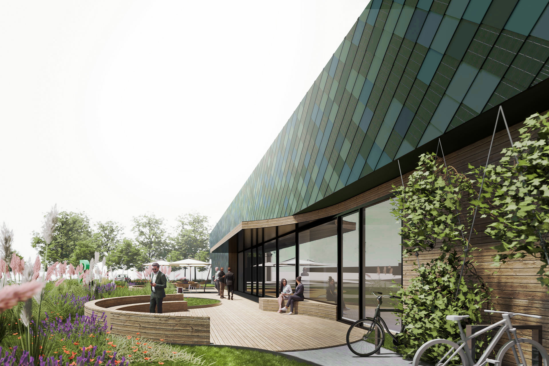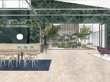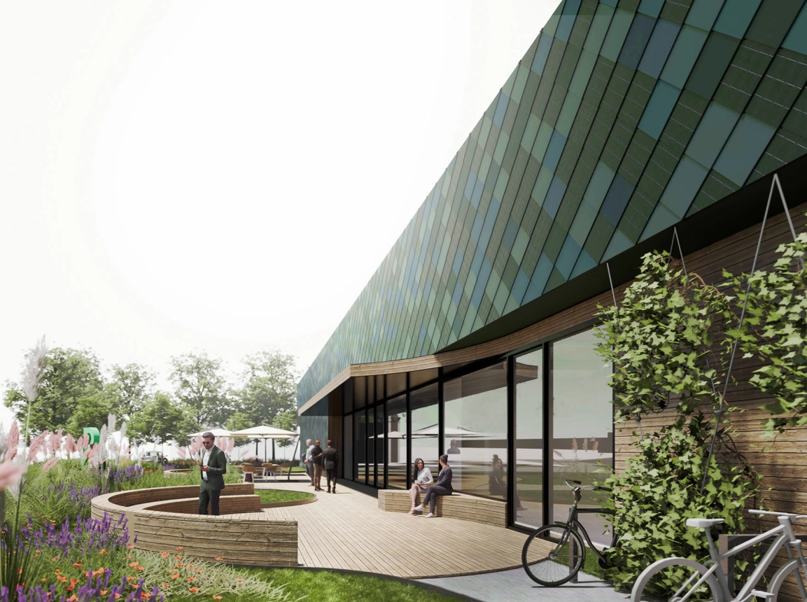 The competition entry for the new themed showroom for a project developer envisages a compact building with a flexible events zone. While the exhibition areas are placed along the façade, the entrance opens out onto a versatile courtyard in the centre of the structure. The special design of the frontage using metal shingles and solar panels makes for a highlight visible from afar.