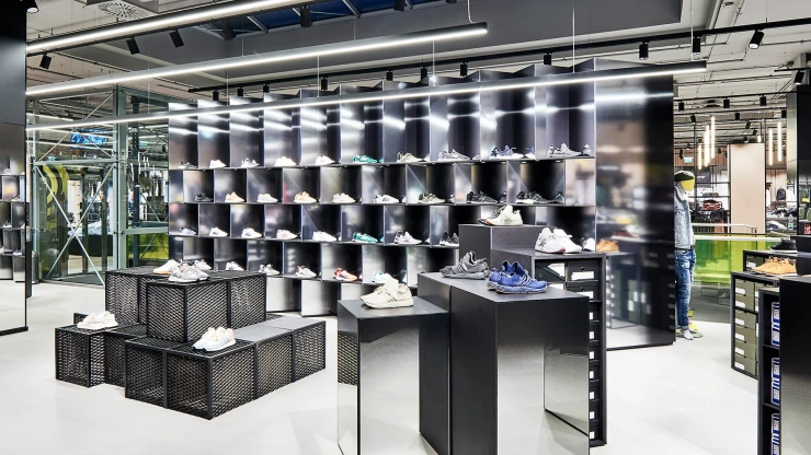 The new façade gives visitors the first inkling of the extraordinary shopping experience that awaits them inside. They set off on their adventure through an entryway of black aluminium set into the large glass front. The store’s colour concept favours natural materials: Light grey natural stone flooring runs through the entire space; wooden slats of whitened ash give the store structure and pick up momentum. The panels serve as product carriers, partition walls or vertical access points.
