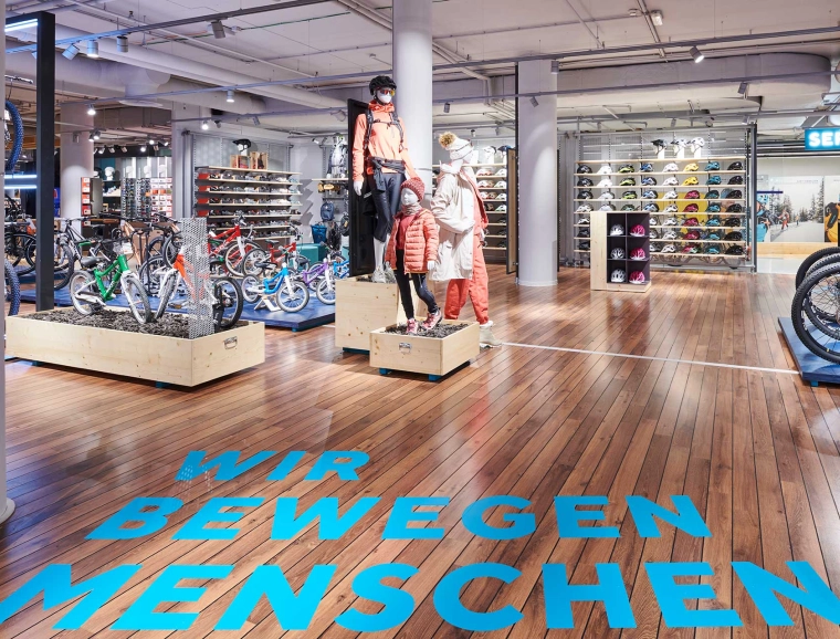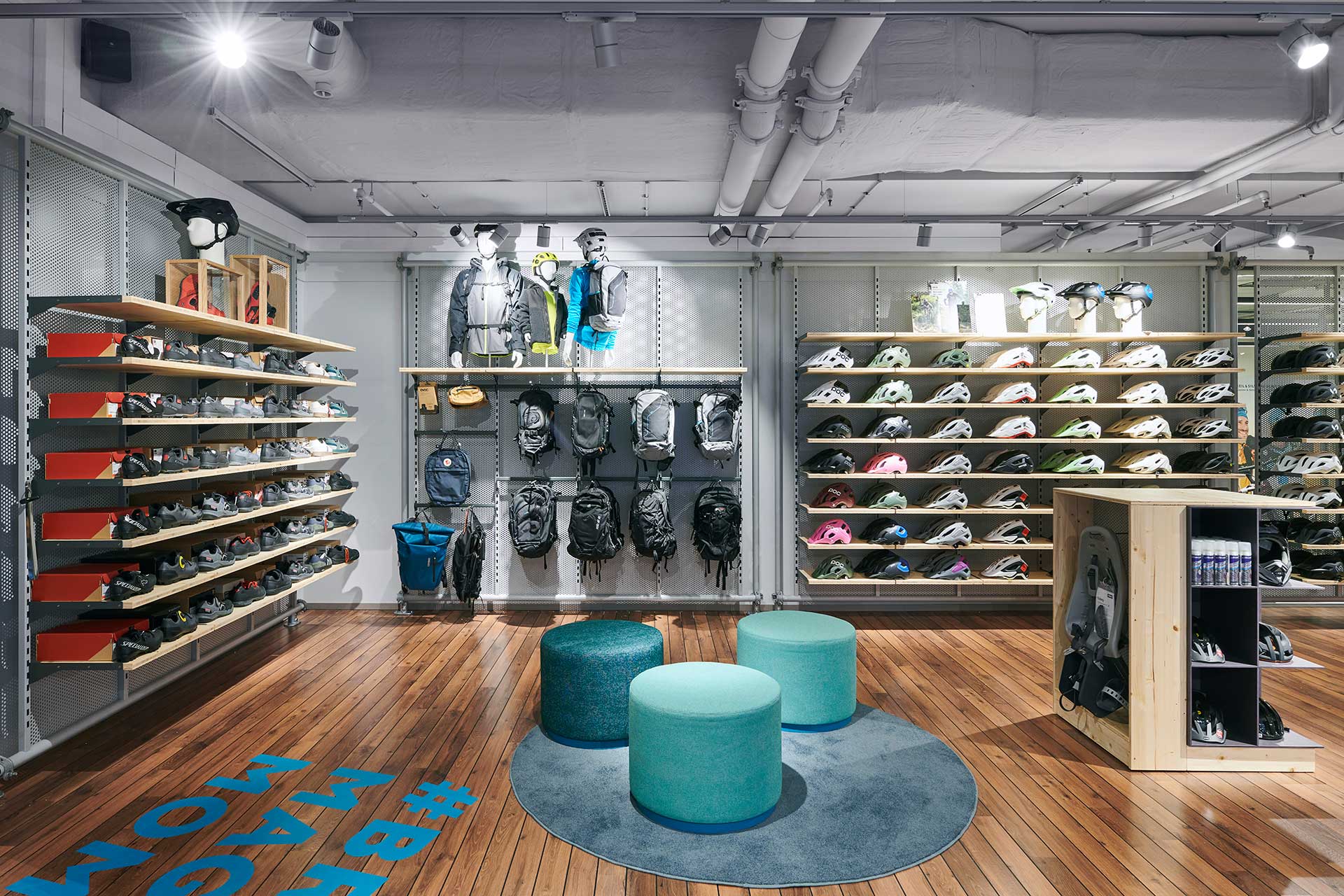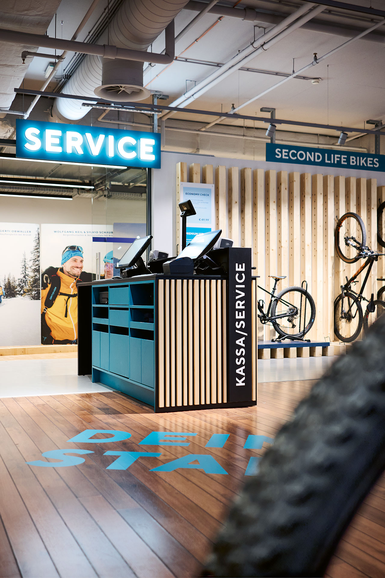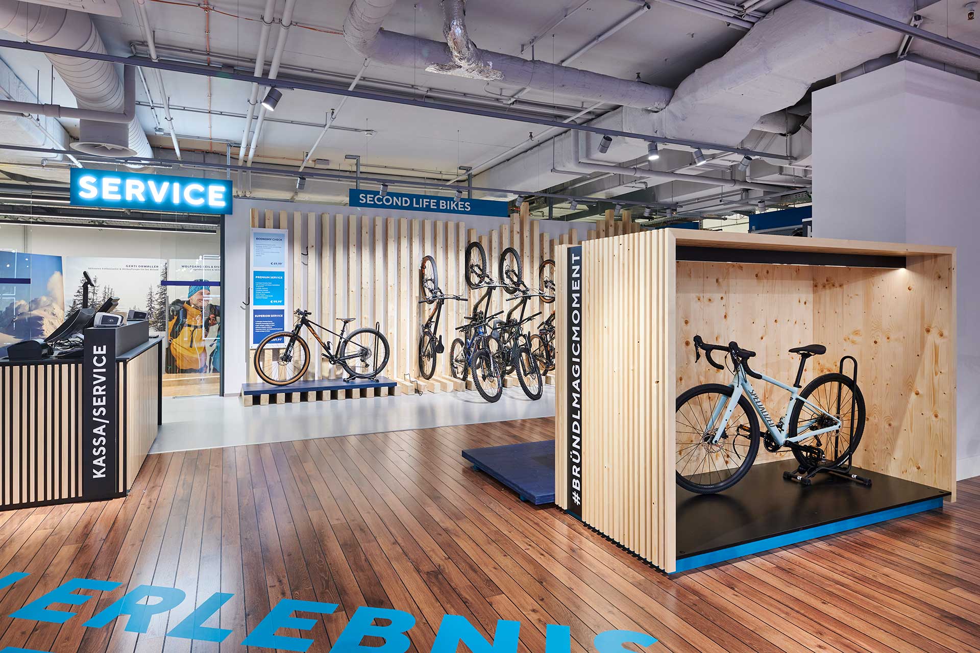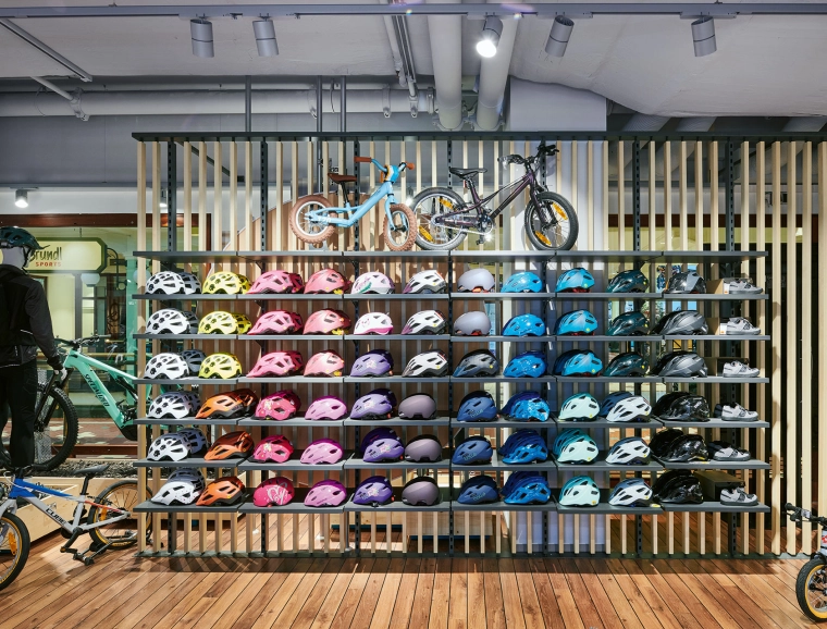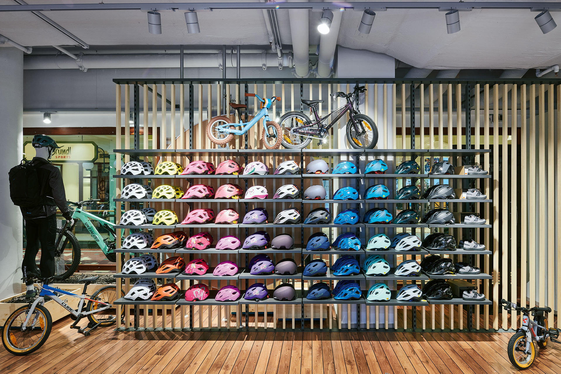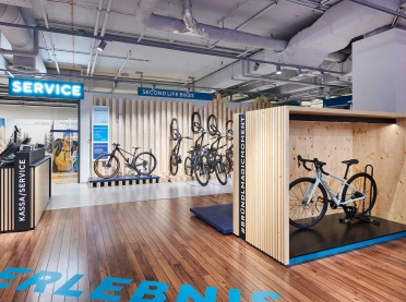 The existing area in the Salzburg outlet centre was expanded by a modern sales area with service workshop and dedicated areas for Job and Second Life Bikes. Everything is designed to be bright and friendly, with honest materials and connections, whereby the shopfitting in the Bikeworld is completely reduced and allows the products to take centre stage.