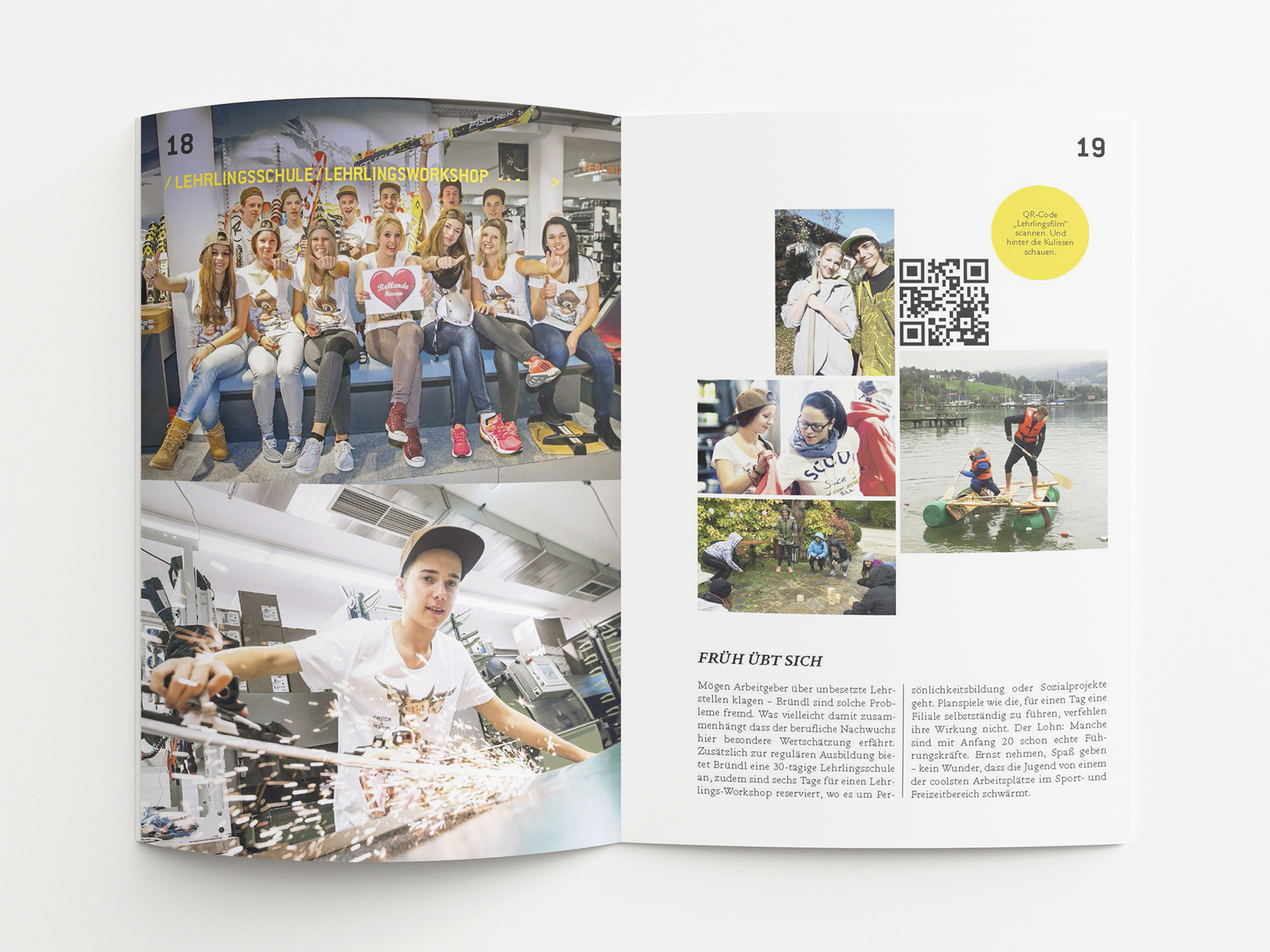 In the complicated "war for talents", the promotion of gifted people has become increasingly important. Therefore, the employee booklet explains the company philosophy, gives insights into the Bründl Academy, provides portraits of employees and creates a sense of community. The booklet contains something for everybody: apprentices, employees, interested parties and clients. In every way, from its handy format to its dynamic photographs, the booklet is extremely accessible and people-friendly. A large part is dedicated to the in-house talent factory, the Bründl Academy. This little gem testifies to the company's unusual commitment to its employees. Hence the Bründl motto: "Everything – except the ordinary".