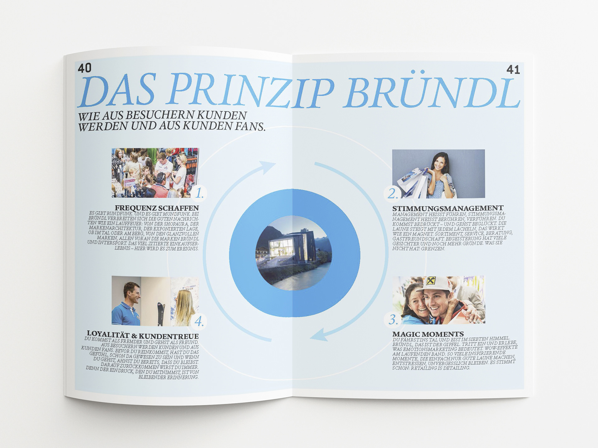 Blocher Blocher View regularly gives this potential an emotional as well as physical manifestation in the lifestyle magazine Bründl Feeling. But for Bründl, what counts the most are its employees, and it was thought that there should be a publication especially for them. The idea of the Bründl Employee Booklet was born.
