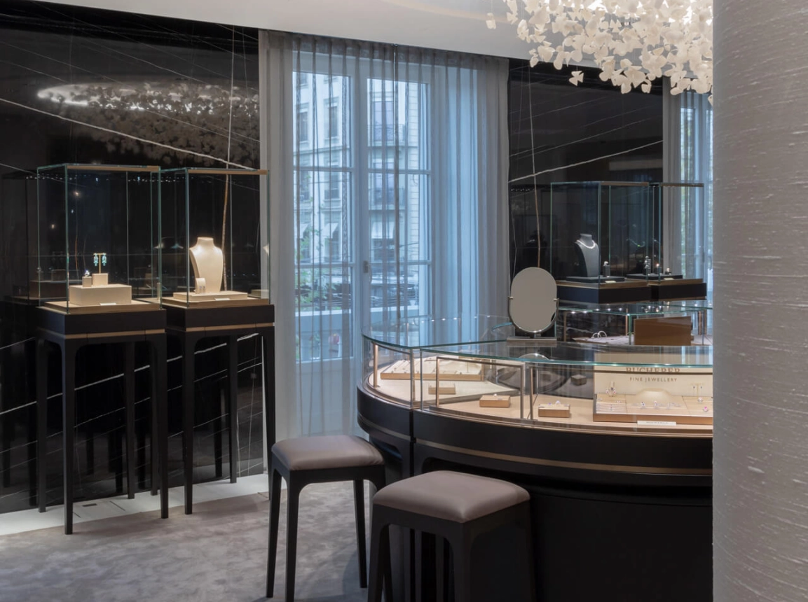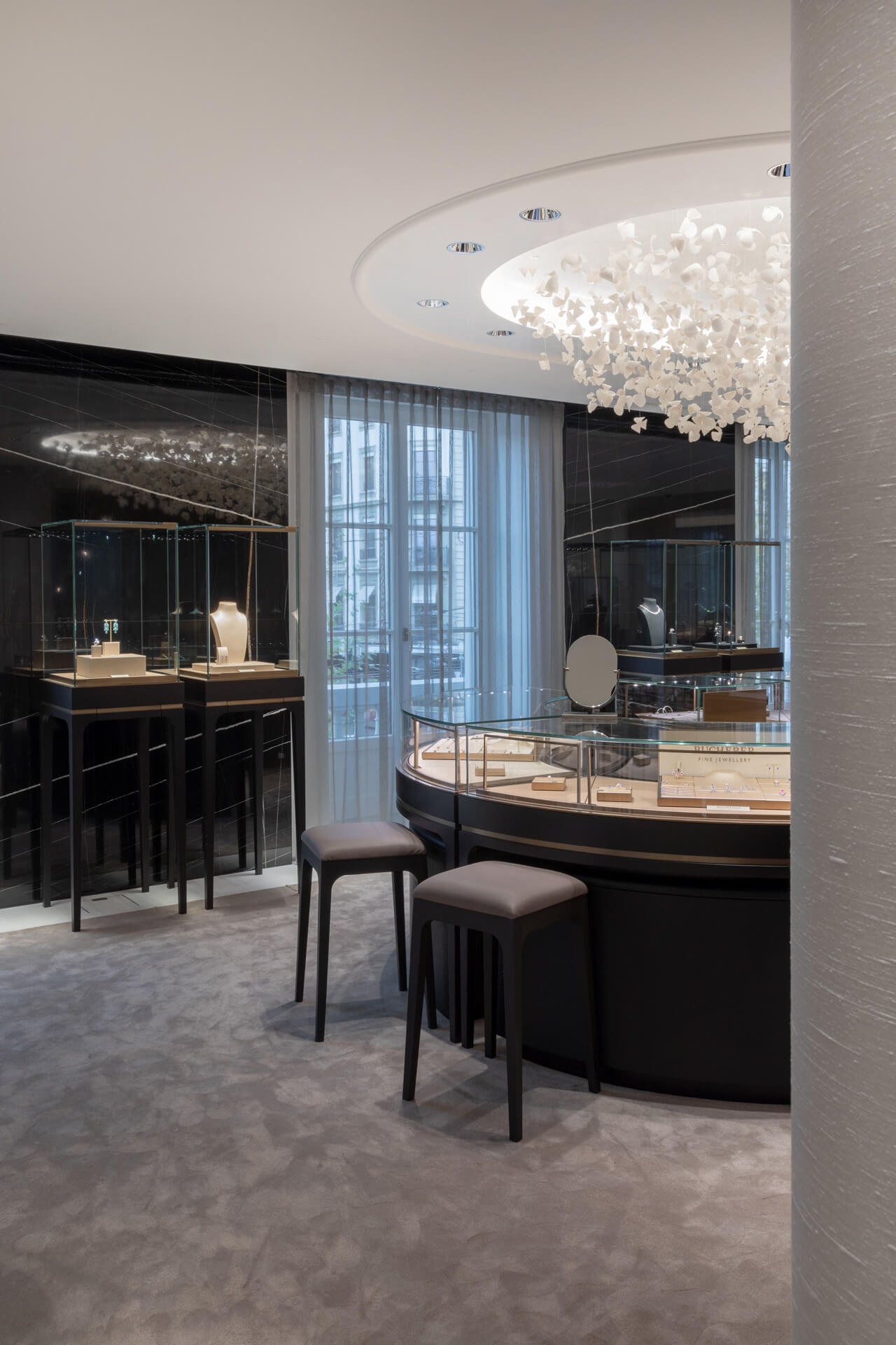 The sophisticated blocher partners interior design also unfolds to full effect in the jewellery department, where a flower installation by British-Brazilian artist Valeria Nascimento enhances the feminine atmosphere. VIP areas on each floor offer both privacy and an opportunity for exclusive consultation. Lounge furniture, matching the wall designs, makes for a special quality of stay. Large, double-wing windows provide a spectacular view of Lake Geneva, rounding off the exclusive shopping experience at Bucherer.