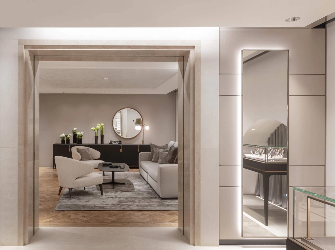 Like a symphonic overture, individual areas unfold as the visitor approaches. Portals in light Botticino marble demarcate each level, adding a note of elegance. While the Rolex and watch departments are on the ground and first floor, the second floor above ground is dedicated exclusively to jewellery: diamonds and other romantic stones. The interior designers integrated a jewellery studio and repair workshop into the third floor.