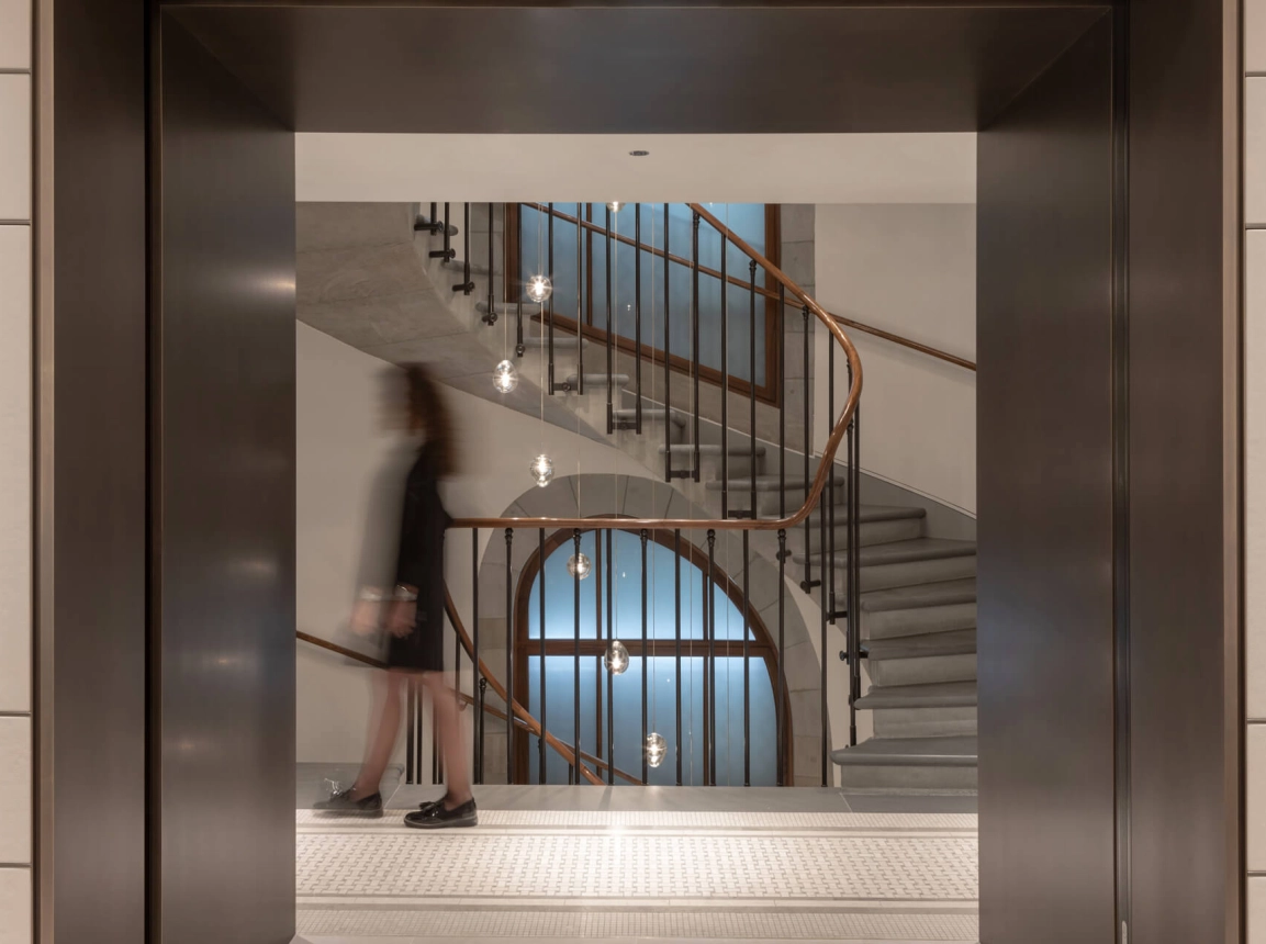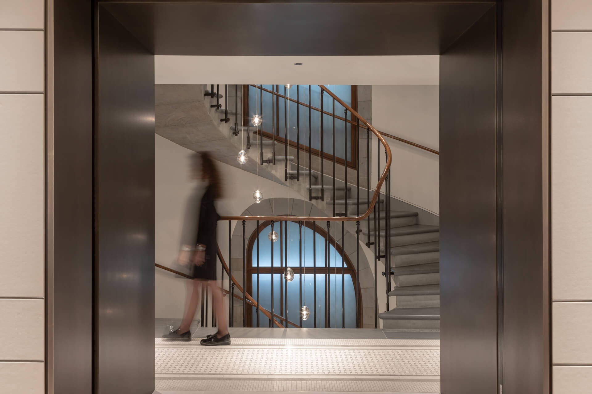 At the heart of the design is the historical staircase that greets visitors at the door. Not only does the staircase link all six floors; it also represents the building’s remarkable character. Working closely with the Office for the Protection of Historical Monuments, the interior designers restored the staircase to its original grandeur: Once again, the natural stone gleams; the black metal railing and entry step reflect the early 19th-century style of French-speaking Switzerland – the period of the building’s construction. The designers also unblocked the windows behind the staircase, fitting them with historically appropriate muslin glass.