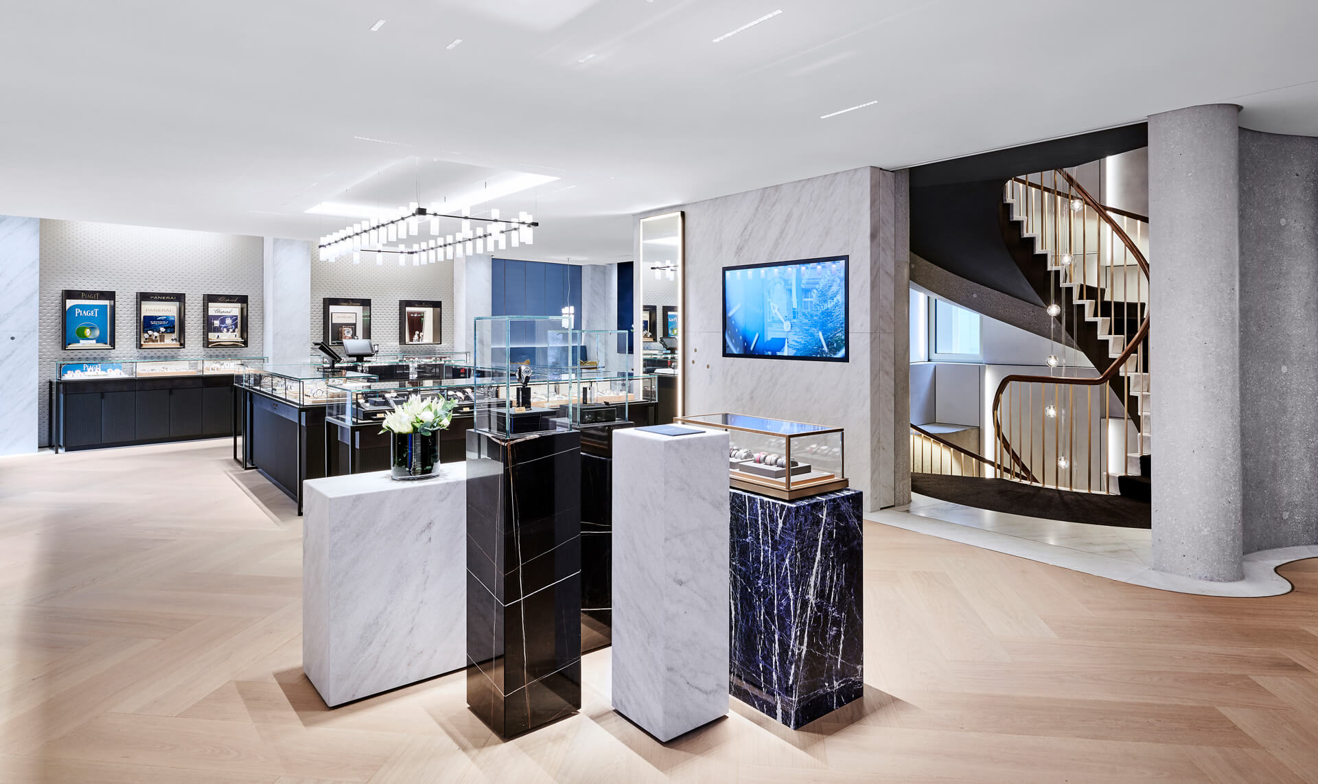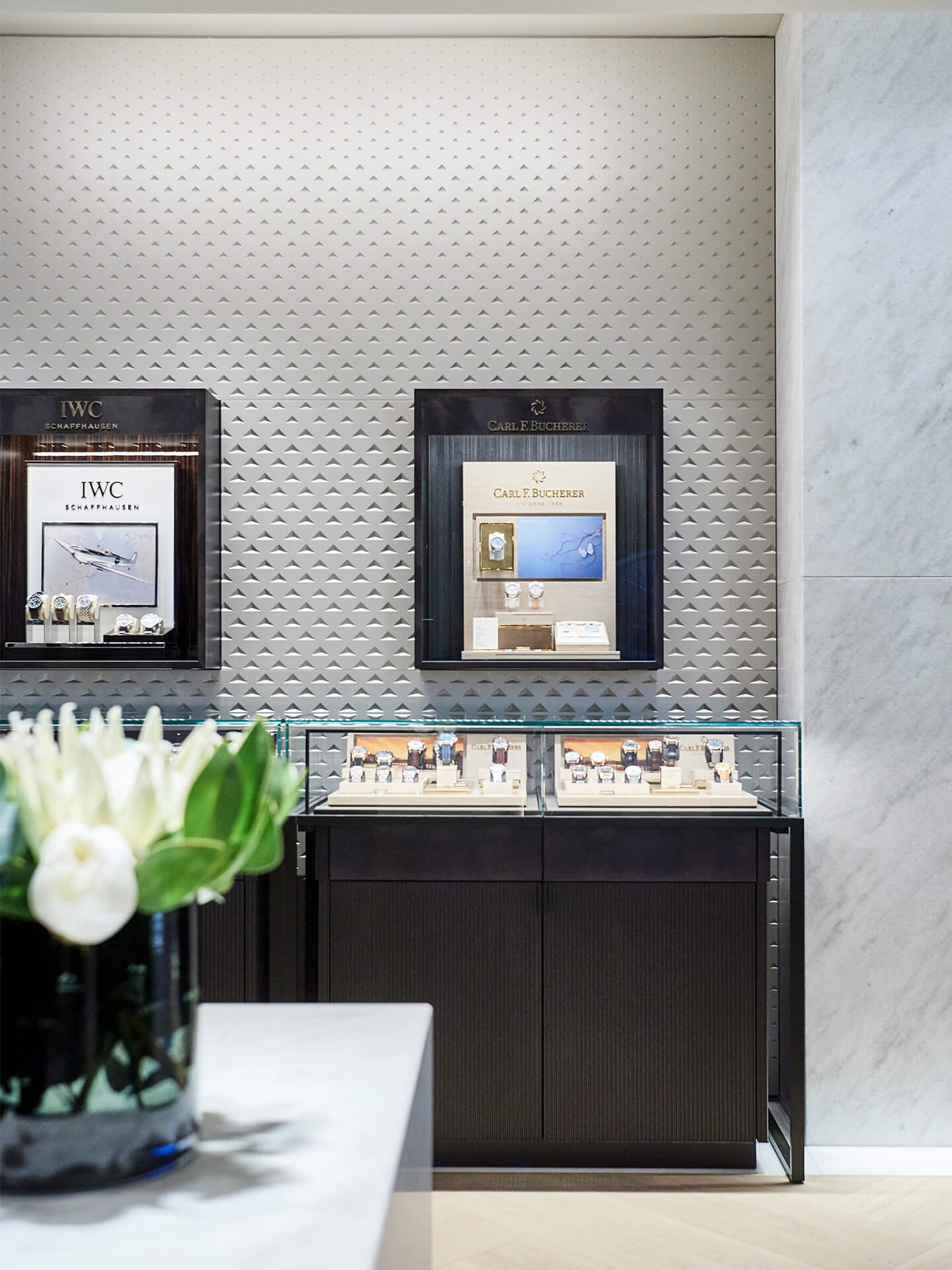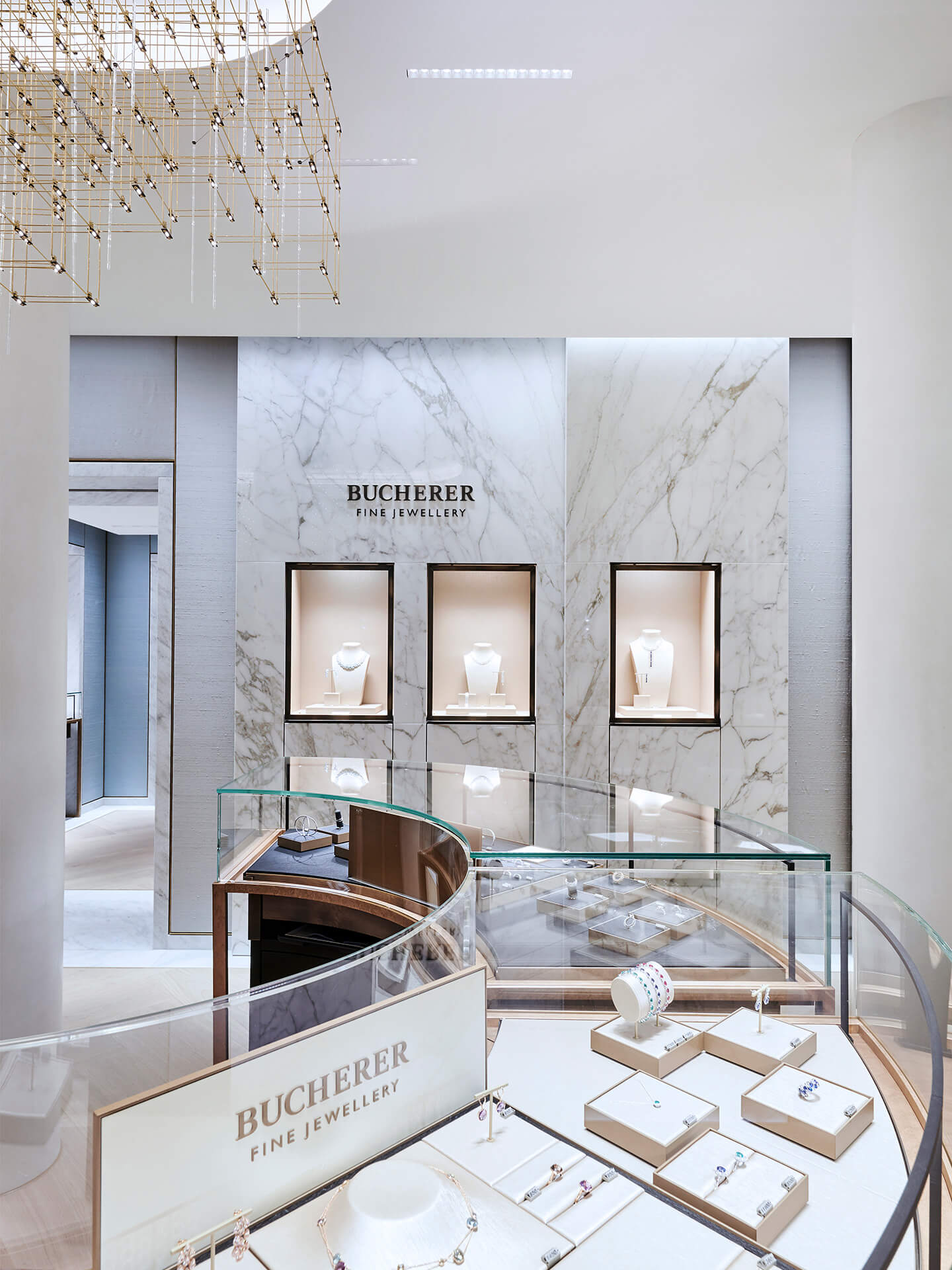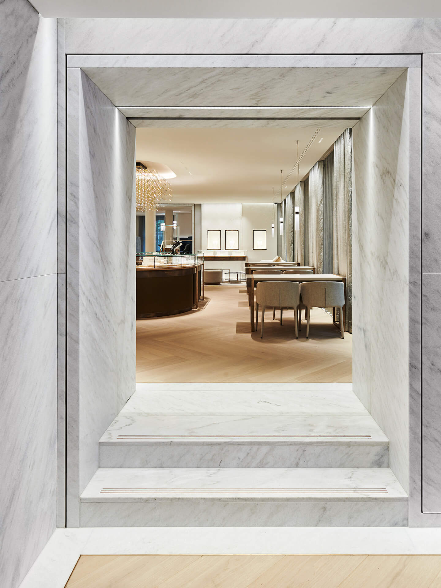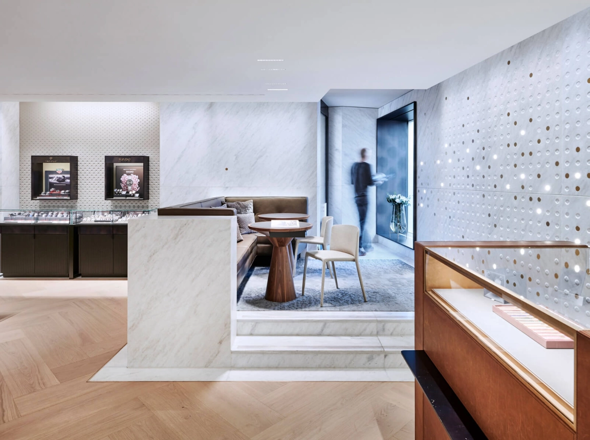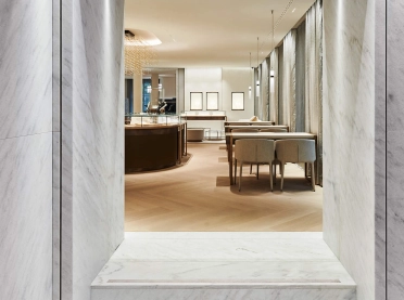 The design concept is based on a close connection between architecture and interior design. To that end, the pattern of the façade is reflected in the interior. Even the material used on the outside – Cristallina, the only marble quarried in Switzerland – is picked up inside: on the walls, in polished form, and on the floors as a frieze. And the metal colours used in the display window area made their way into the store, resulting in a high-quality and classic atmosphere as if cast from one mould.