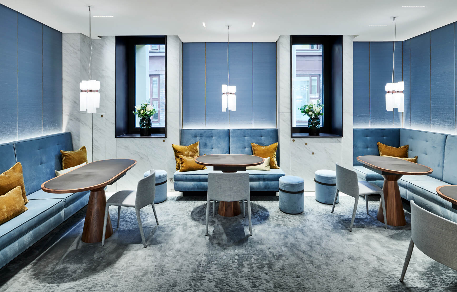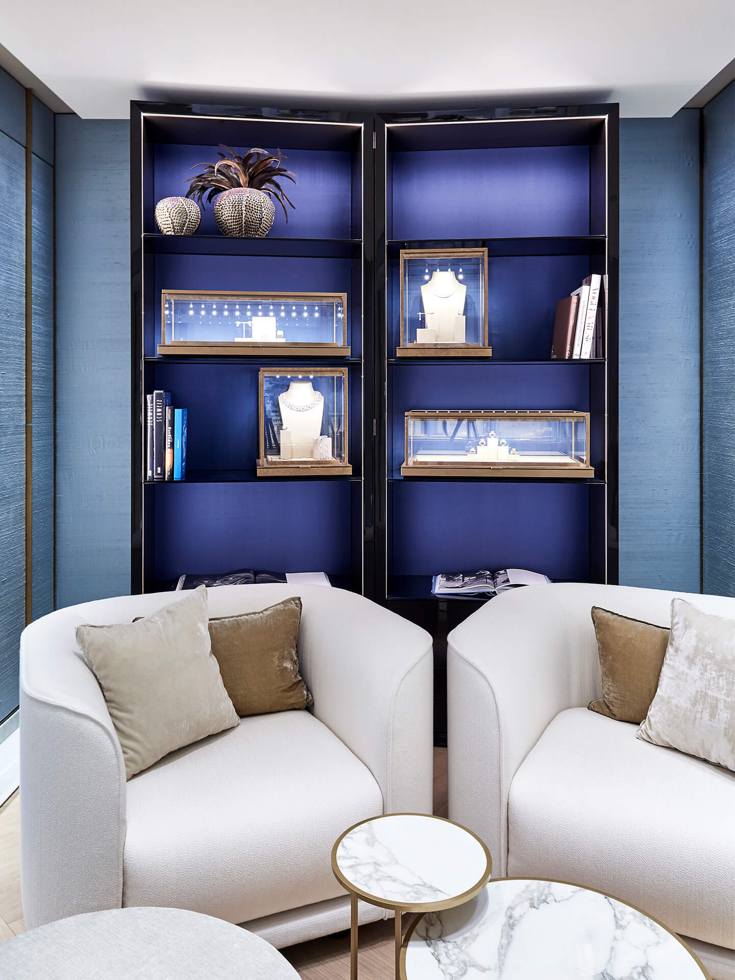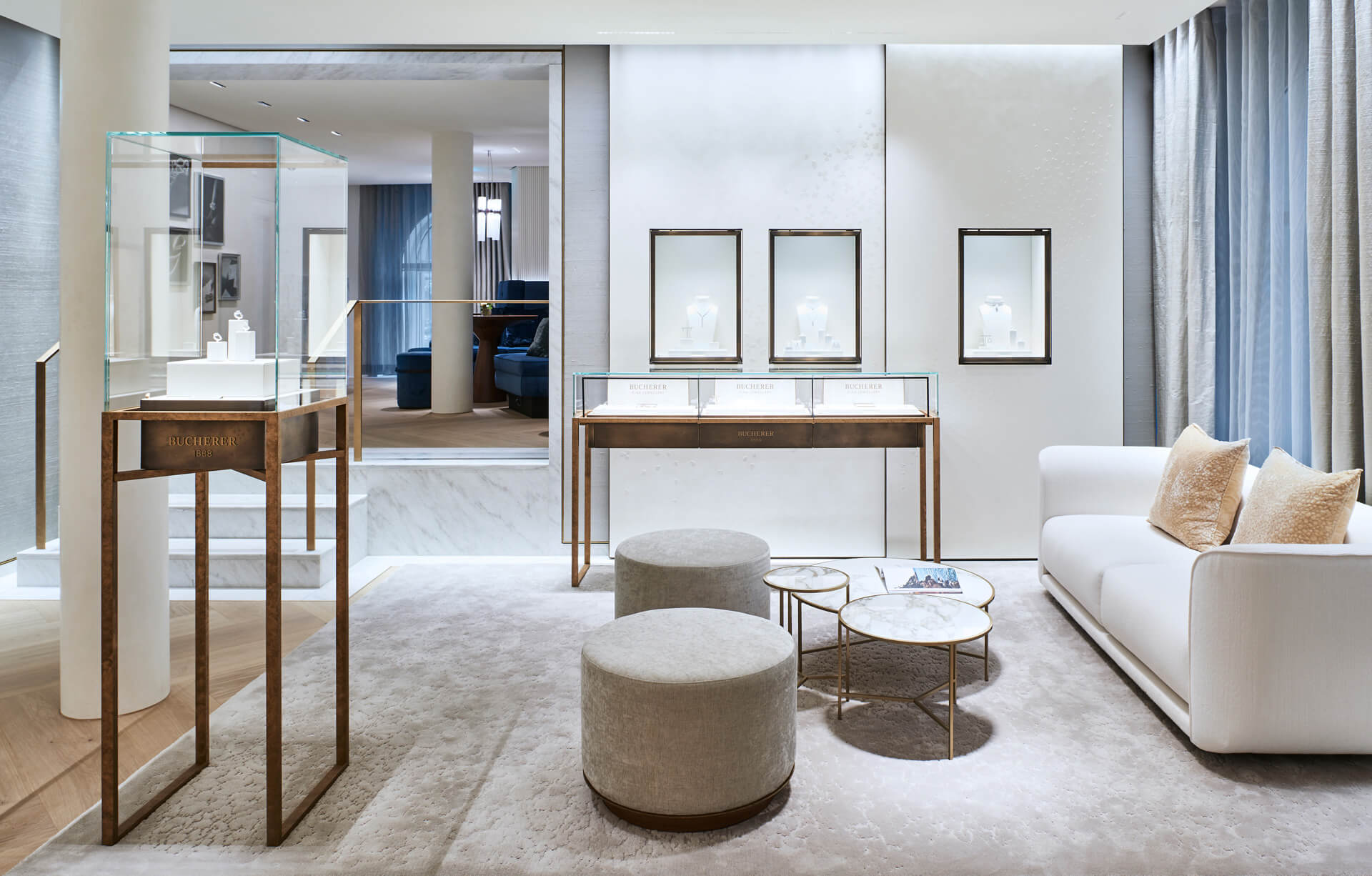 The first floor above ground in the neighbouring building – connected to the flagship store via a passageway – houses the jewellery and romance department. Here, the design language picks up on the façade of the building itself: it’s more playful, softer. Jewellery is displayed on oval counters with special lighting; a separate, private area done in blue silk and a café area likewise decorated in blue velvet tones feature semi-circular niches for consultation and trying on fine jewellery.