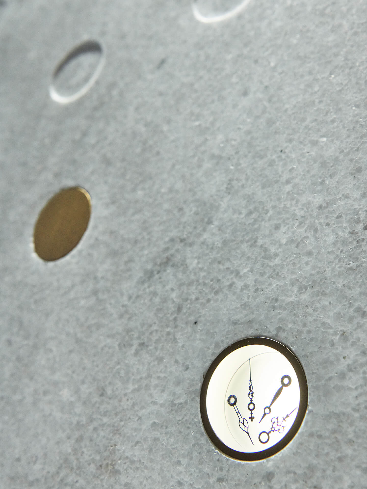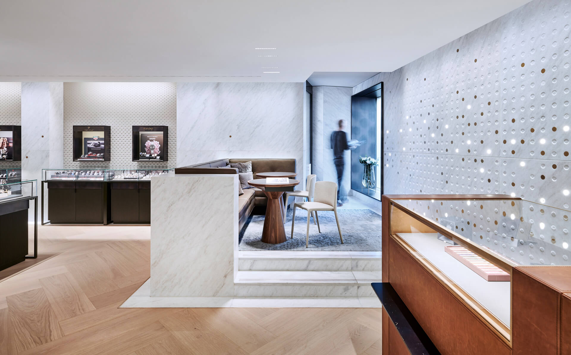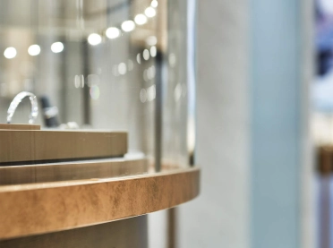 It’s not about design as an end in itself; rather, it’s about creating a striking and precise design language that works as a setting for Bucherer's watch range: on the ground floor with a Rolex boutique, on the first floor upstairs with additional brands – all of which clients can try on in the velvet-covered watch lounge. On the second upper storey is a watch service department, whose design highlight is the Cristallina marble watch display wall. The wall’s round recesses – some with hammered surfaces, others polished or fitted with metal plaques or with cast-in clock parts – are a tribute to the Swiss art of watchmaking.
