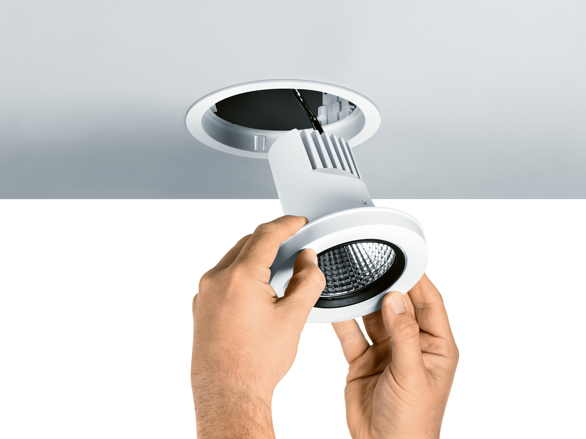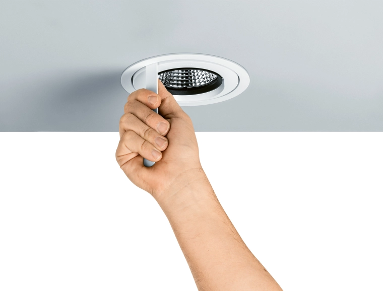 For Zumtobel, a powerful LED built-in spotlight has been developed, which scores with a low installation size and thus ensures a quiet, unobtrusive ceiling design.