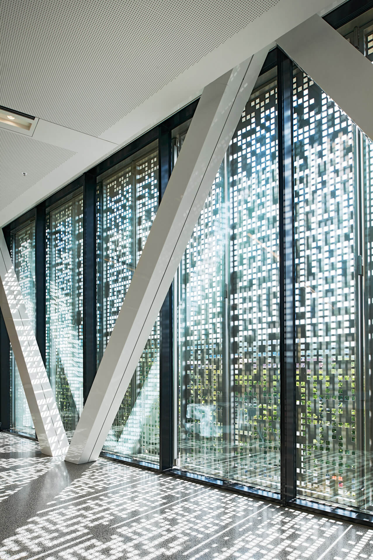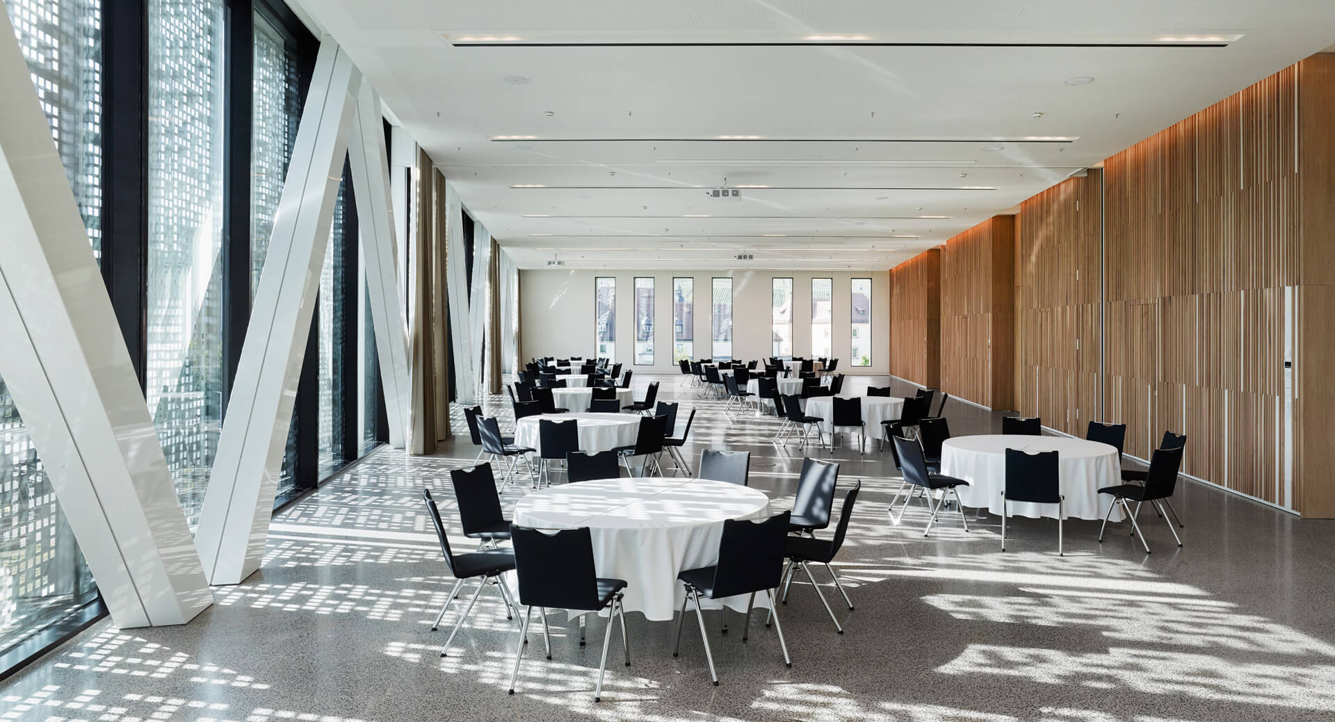 On one hand, the building now projects an unprecedented candour; and on the other hand, structural shading elements ensure that the CCW can have both a public and private persona. Its sunshade of perforated lamellas slides along the panoramic glass front, opening and closing like an accordion, depending upon need. In combination with the glare stopping, floor-length curtains and interior window shades, every possible mood is given its due, from serious to festive.