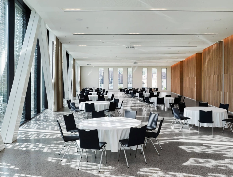 Within 18 months, blocher partners modernized and converted the Congress Centrum, which had first opened in 1985, expanding it by 3,000 square metres, practically doubling the previous congress and exhibition space to 6,400 square metres. The conversion and new construction was segmented into four cunstruction phases, two of them free of booked events (three and four months), two while ongoing operation; accordingly there were only small timeframes for substantial measures .