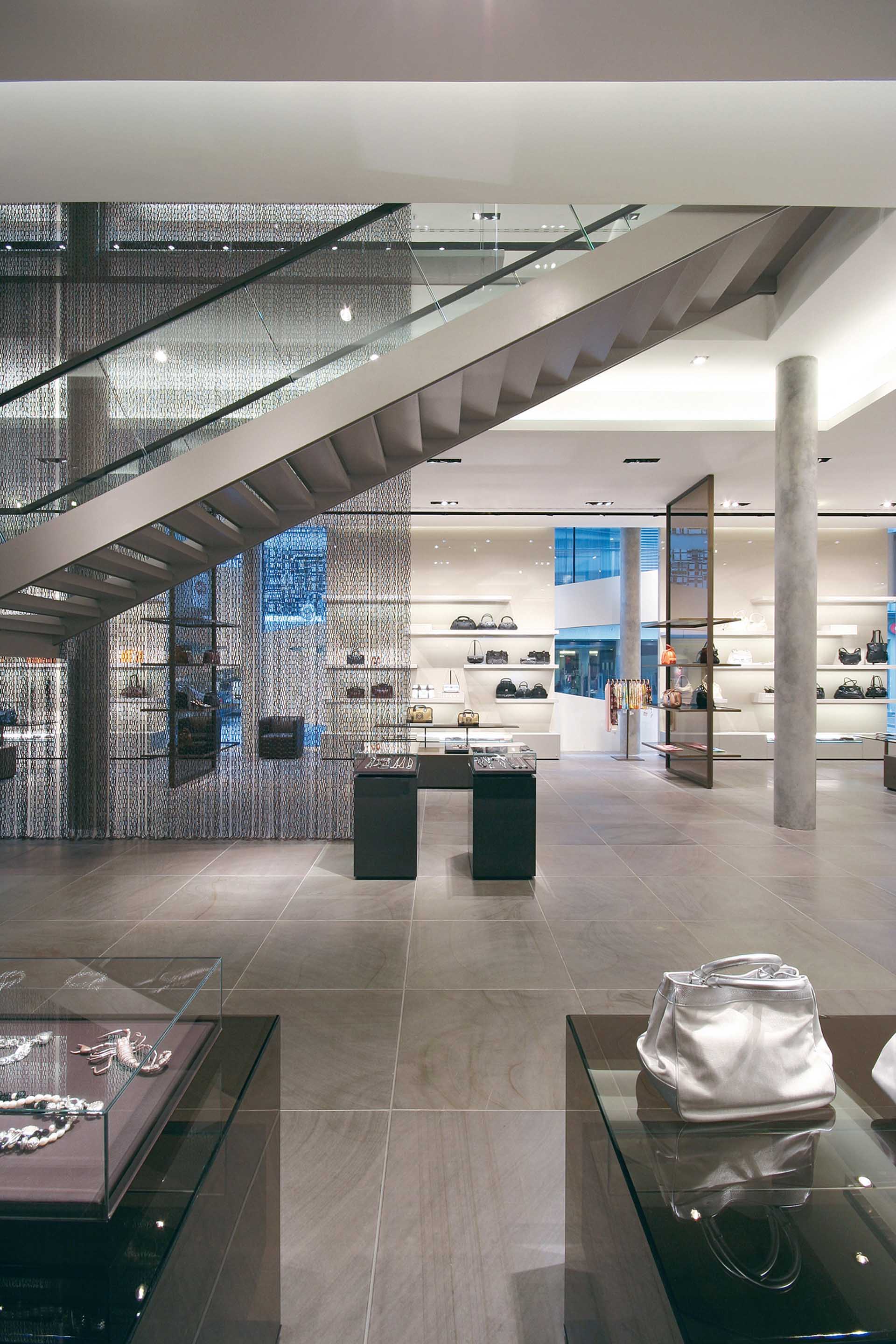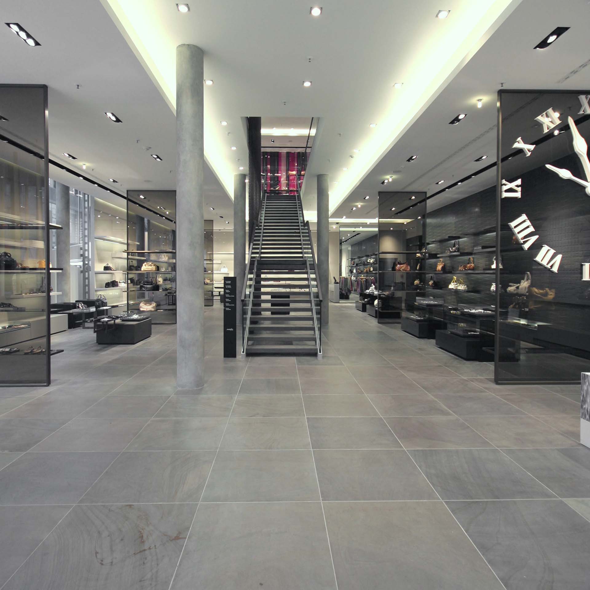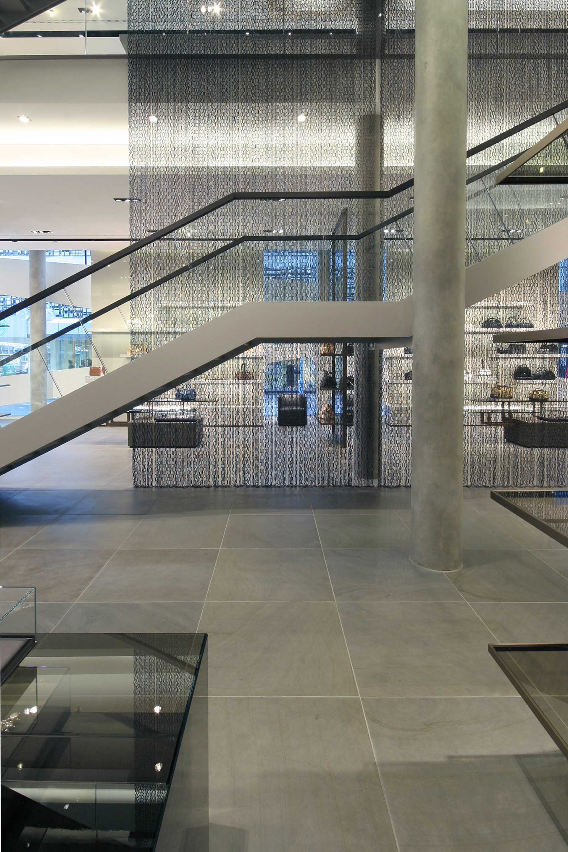 The sales levels convey an elegant atmosphere, characterized by sensitive material like brazed glass, leather and natural stone and a simple design – for example of the cubical furniture.