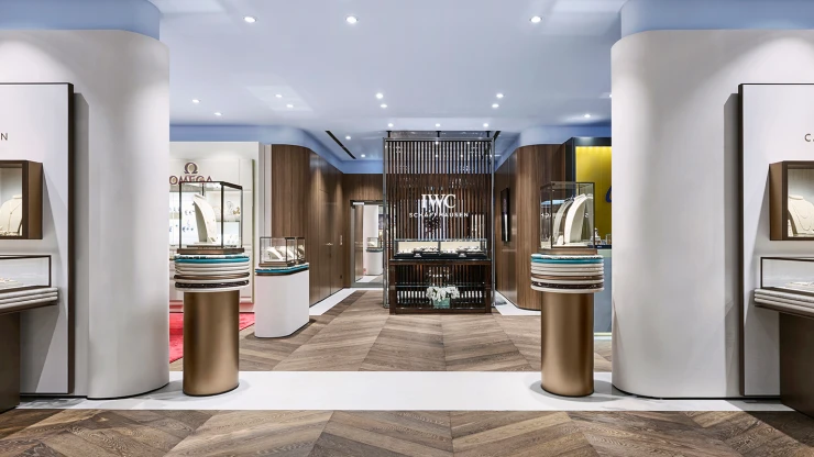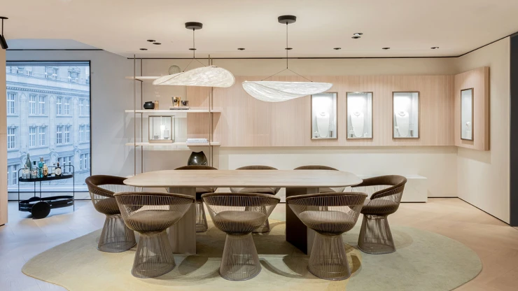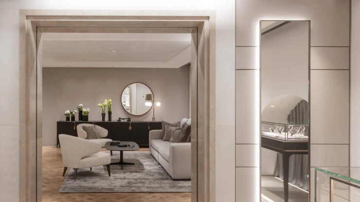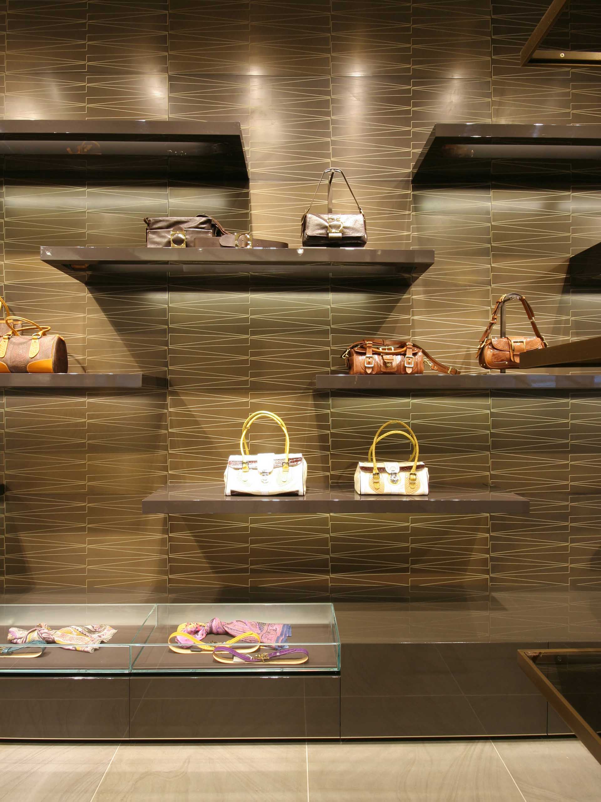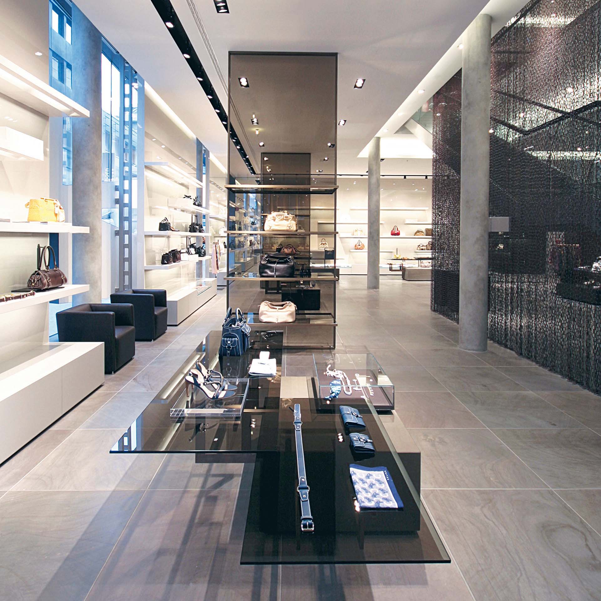 The sales levels convey an elegant atmosphere, characterized by sensitive material like brazed glass, leather and natural stone and a simple design – for example of the cubical furniture.
