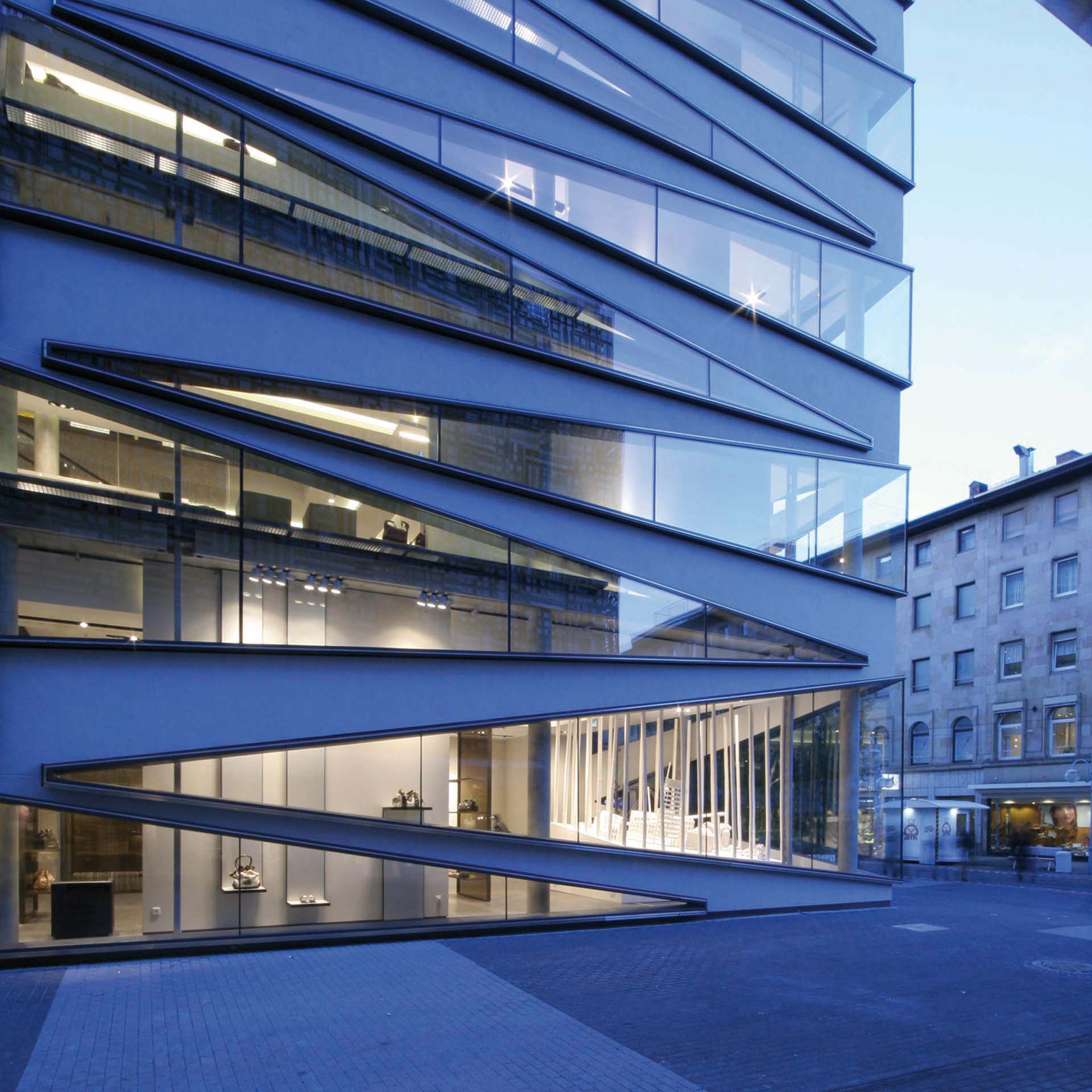 The unconventional façade is a significant reflection of the company culture. Expressivity and timelessness grow together in the urban context. The corpus provides no clues regarding the division of the floors. Instead of dividing the façade horizontally – as suggested by the structure of the floors – the connection is diagonal. The interior space appears to curve towards the observer. The wedge-shaped glass surfaces shift like showcases beyond the closed surfaces, fusing the sales floors.