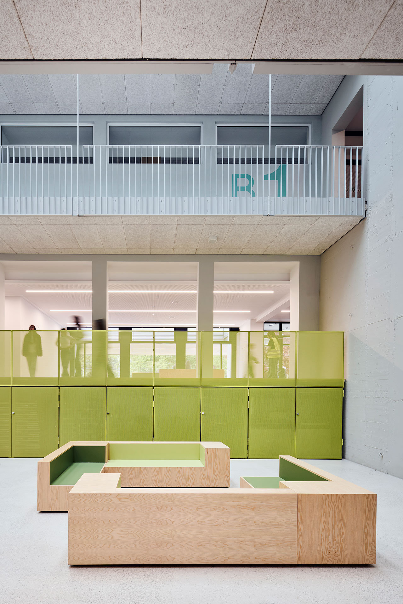 The schoolyard has also become greener: instead of tarmac, there are now lawns and planting beds. Light-coloured concrete paving has been used where solid ground was required for paths and fire service areas. This heats up less and has the advantage that rainwater can seep away through the joints. New play and sports equipment encourages children to exercise during the breaks and when there are no lessons. Lots of seating invites children to relax and study outdoors.