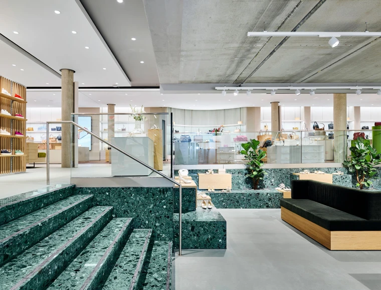 An 815 square metre area on the ground floor has been transformed into a premium department for women's shoes and bags. The new department is divided into two levels with a slight difference in height, which are connected by a few steps.