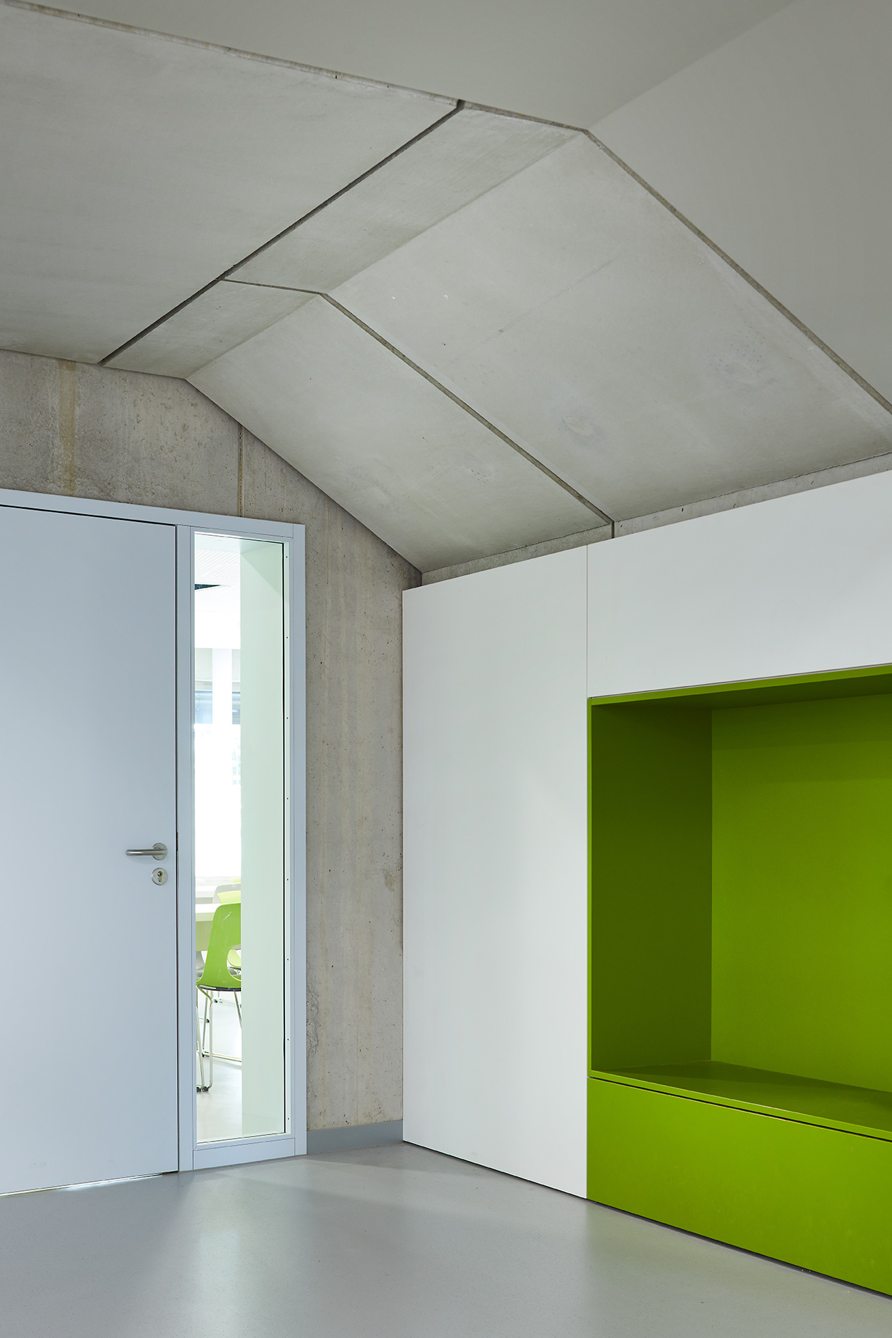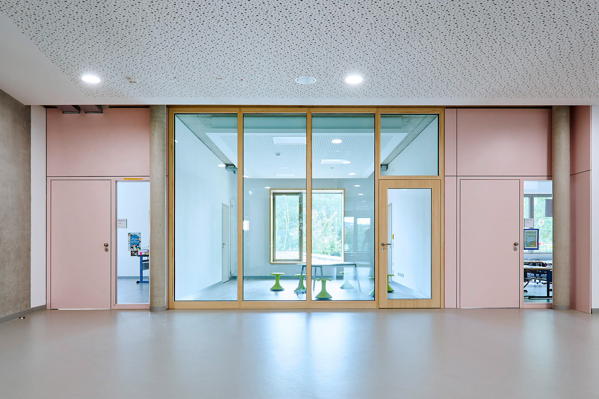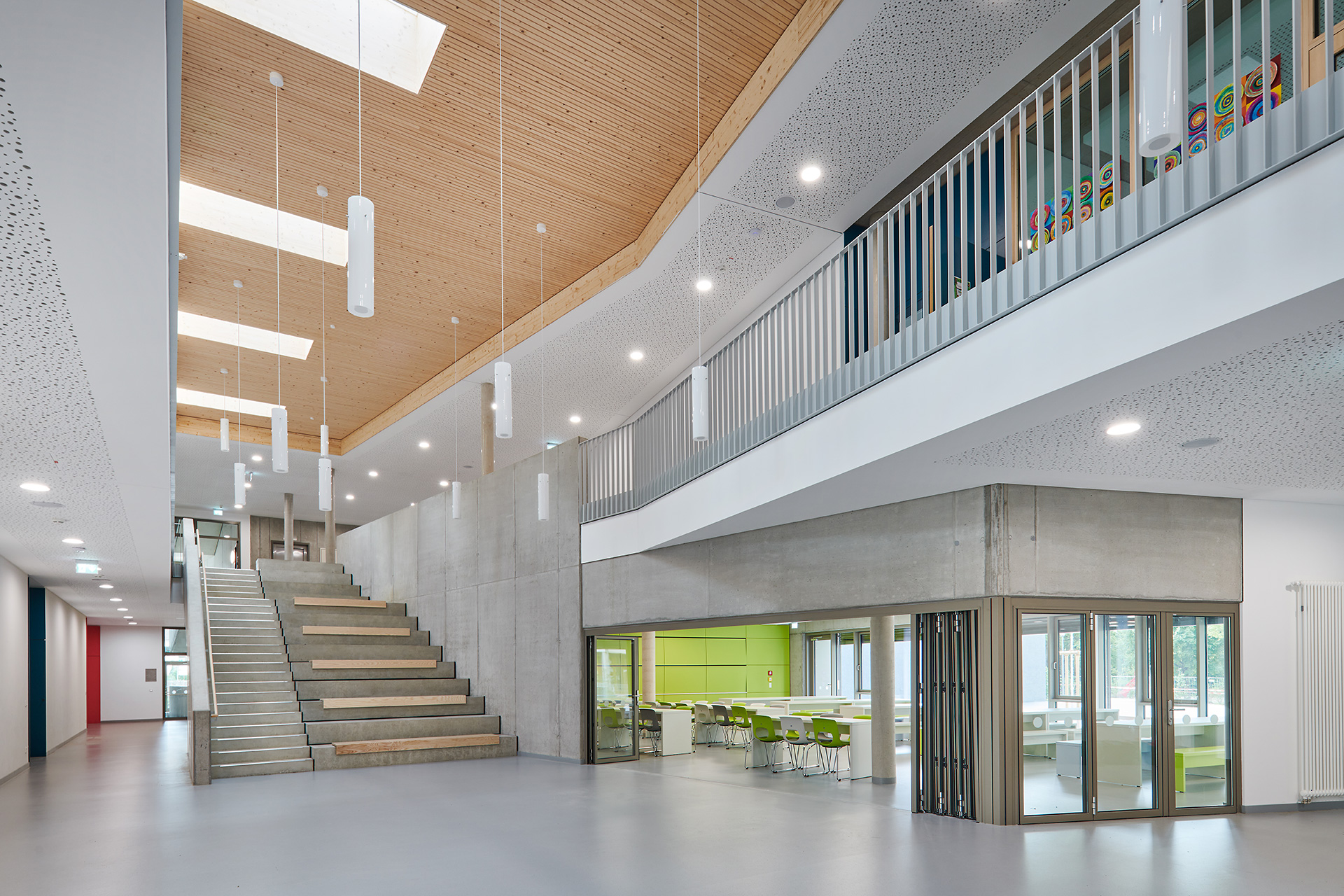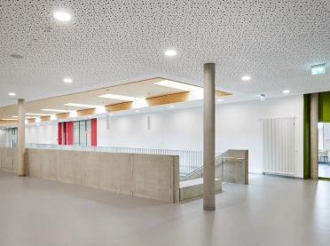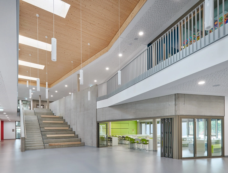 Rectangular skylights in the ceiling above the foyer fill the space with light, bringing transparency and brightness to an area that is also intended for indoor activities during bad weather. The resulting atmosphere makes it easy for pupils to spend extended amounts of time here. A wide flight of exposed concrete stairs leads from the foyer to the upper floor; it features seating steps and wooden benches from which one can watch the action in the foyer below. The cafeteria is located next to the stairway; one can connect it to the foyer for events by opening the large, sliding glass wall.