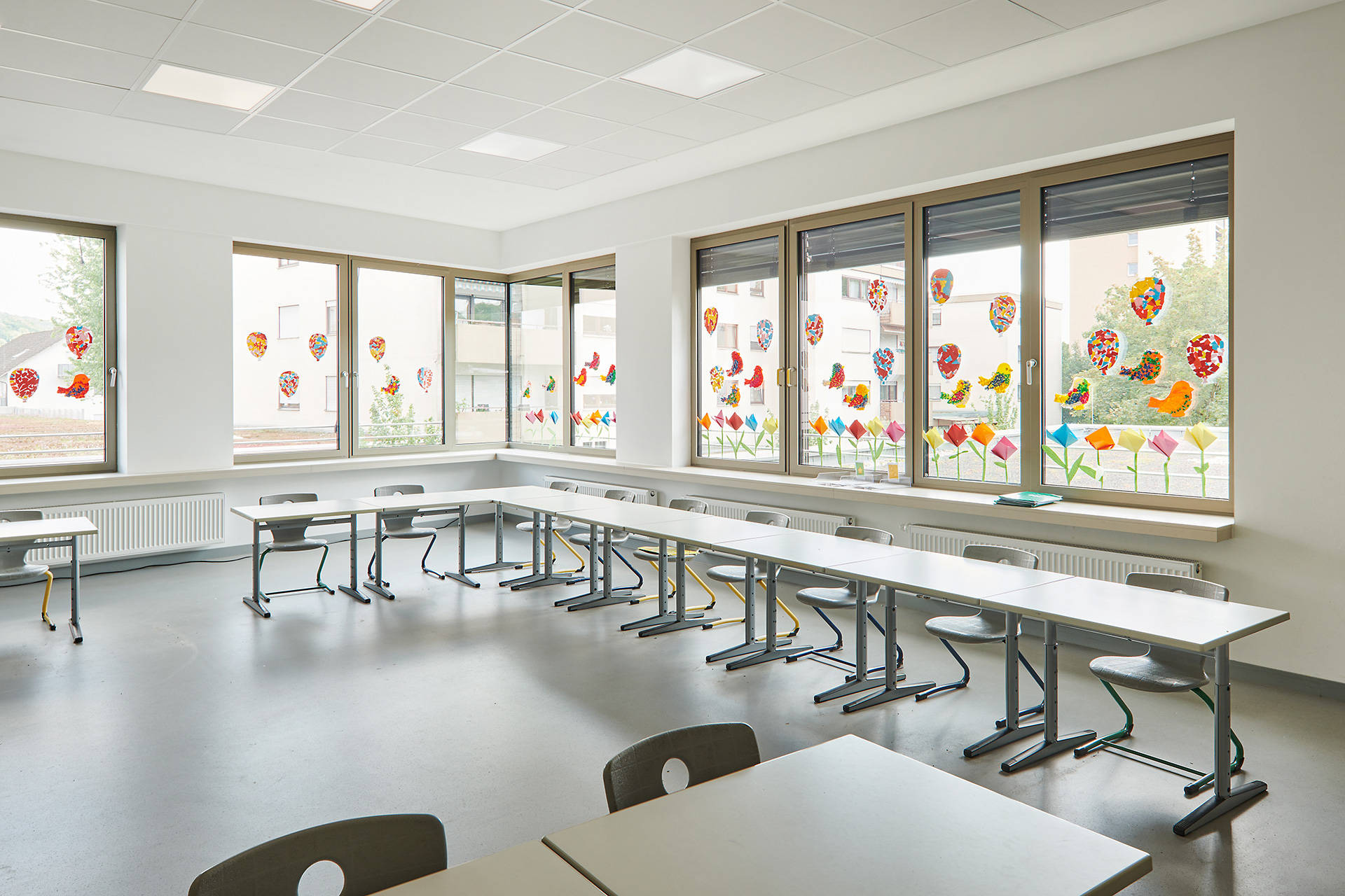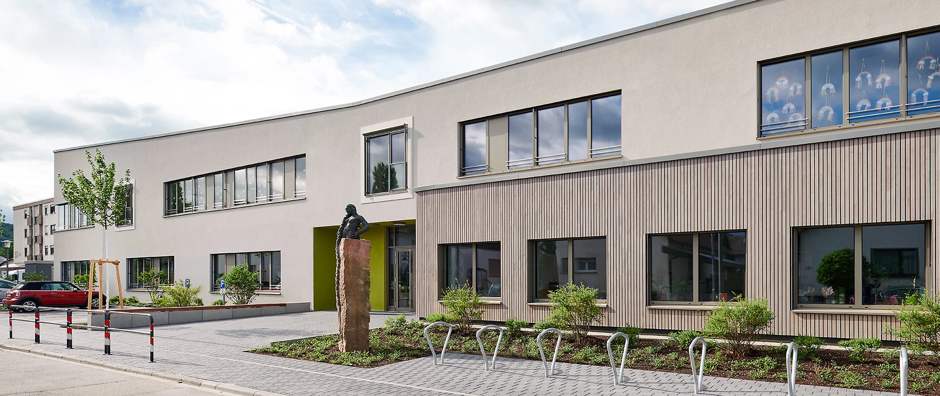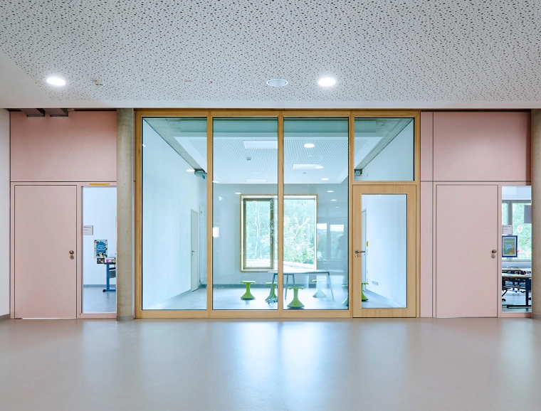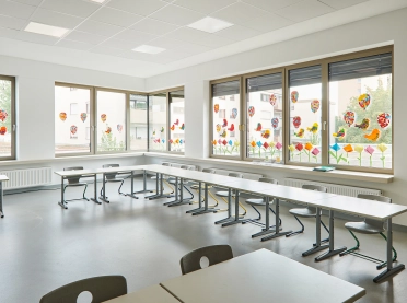 The all-day elementary school can accommodate 336 pupils. Twelve classrooms are located on the upper floor; two of them are linked in the center of the space via a so-called flex room: a retreat and recreation area whose glass wall faces the corridor and can be seen from the outside through square windows in the building’s façade. On the ground floor, in addition to the entry area and foyer leading to the teachers’ and administrators’ areas, there are rooms dedicated to music and art, a teaching kitchen, the cafeteria with kitchen, and recreation and student work rooms for the all-day area.