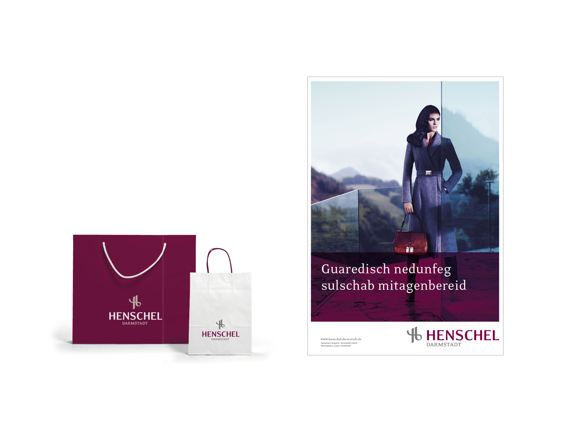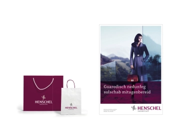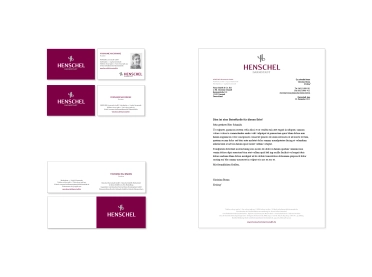 The reworked logo and the strong, primary colour – a dark red that verges on violet – communicate the new Henschel spirit on such items as stationery and business cards, website and retail graphics. It's a confident gesture to customers, underscoring both the Henschel Modehaus tradition and the company's passion for progress.