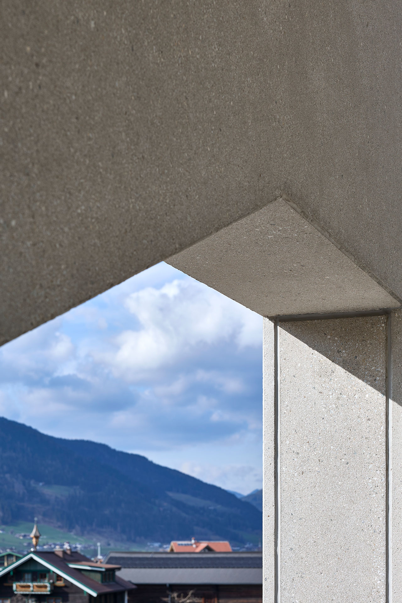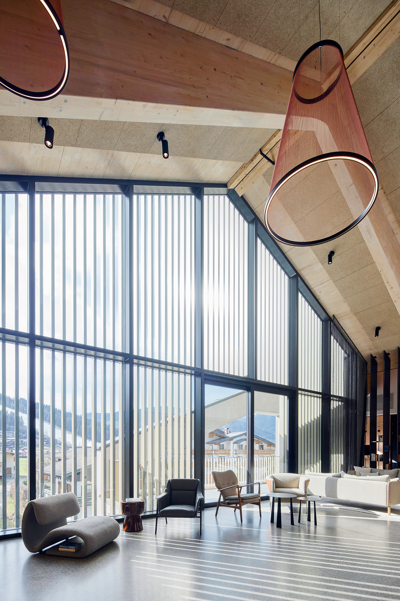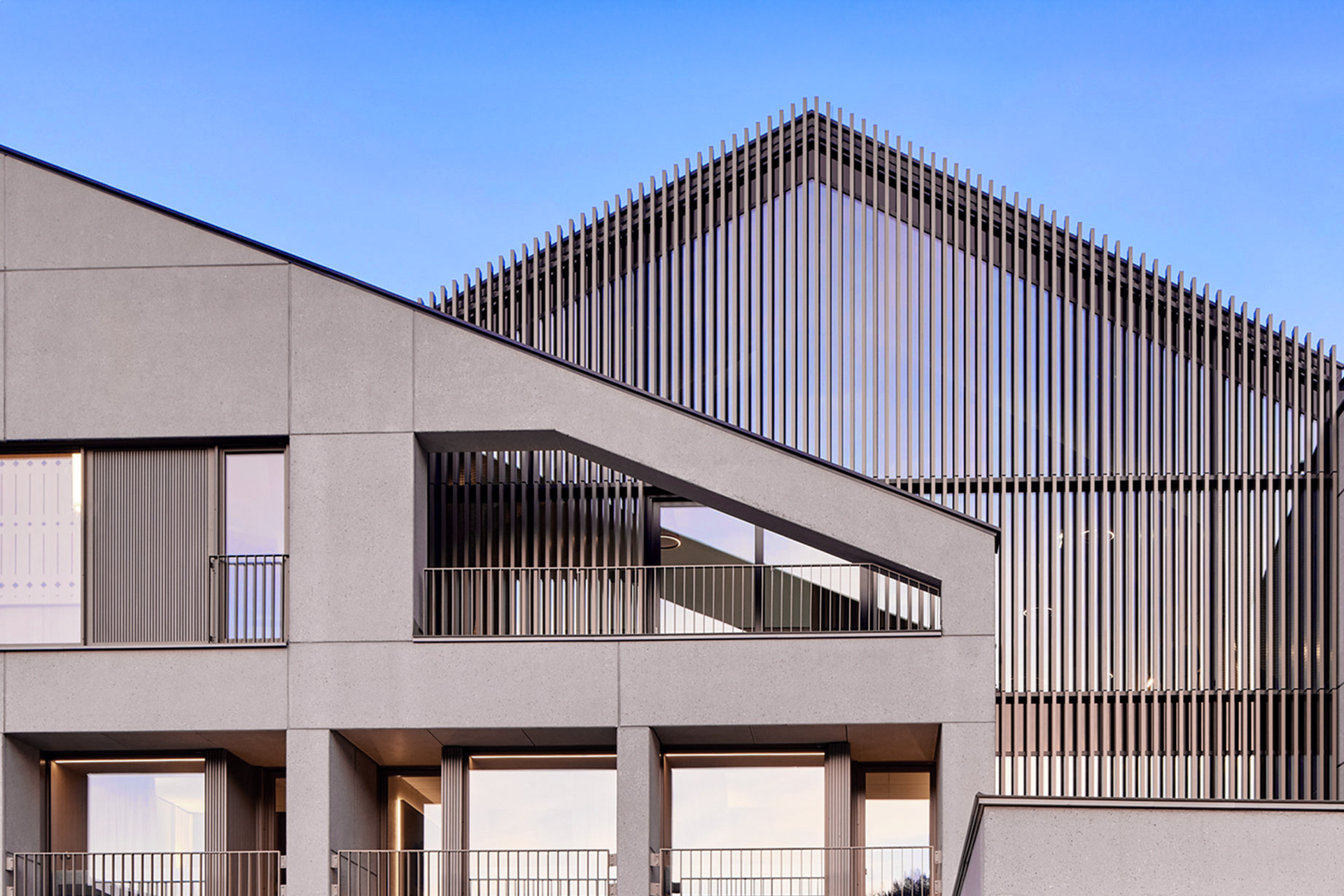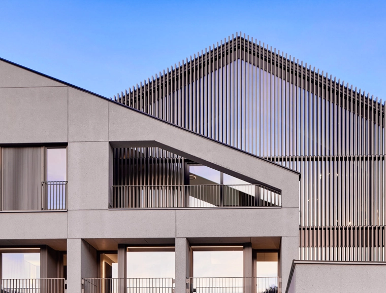 The existing building was extended by a striking new building, which is divided into three slightly offset volumes. The characteristic pitched roofs take up alpine building traditions and interpret them in a contemporary way. Particularly striking: the glass façade with metal slats in pearl beige in front, which lend the ensemble a rhythmic lightness. Below ground, a two-storey underground car park completes the offer.