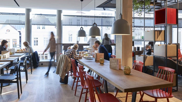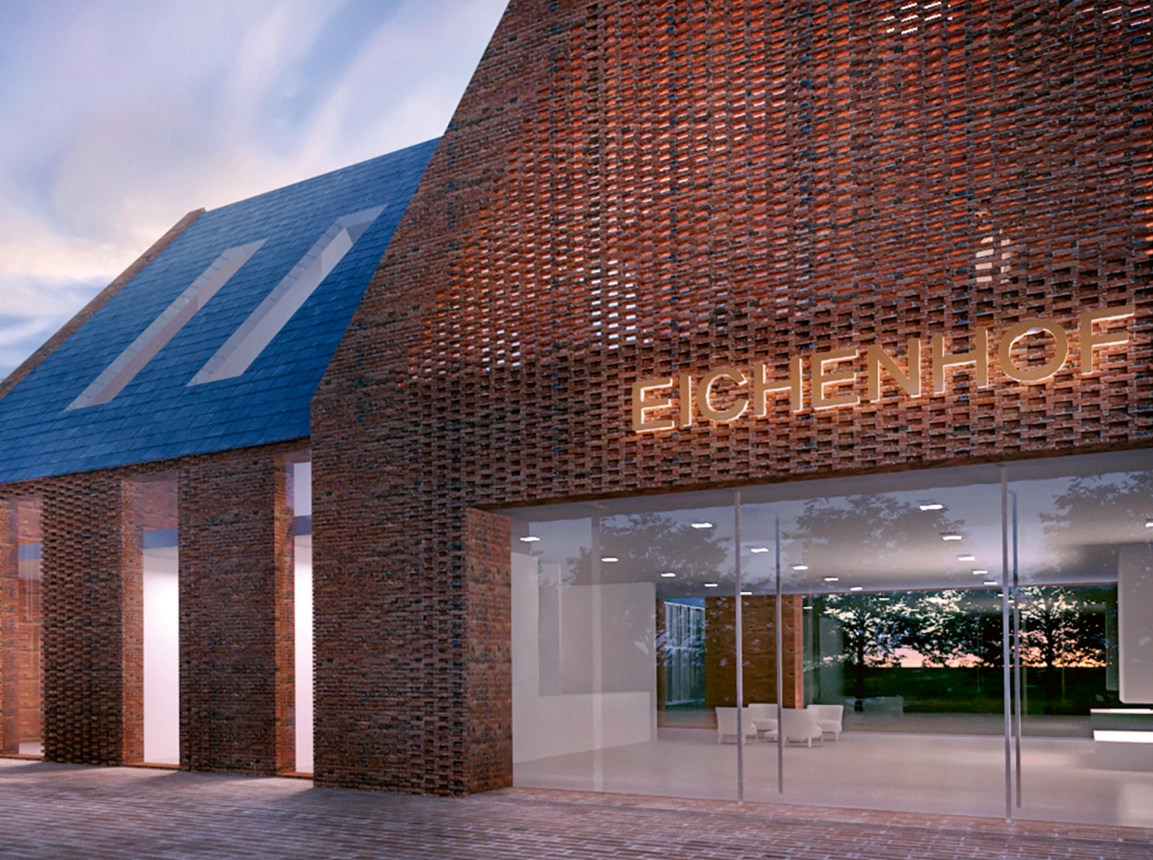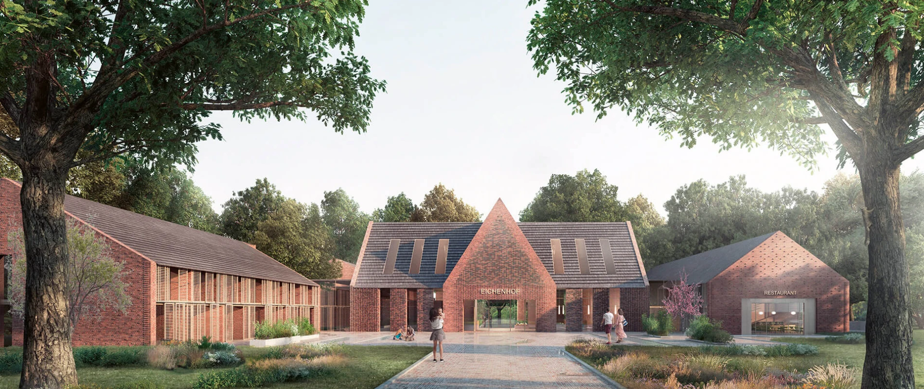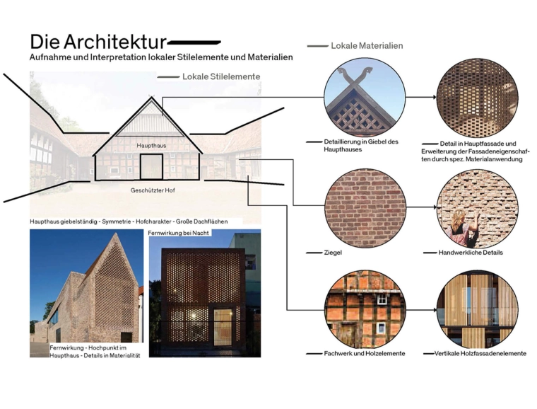 With an ensemble design at a scale typical of this locality, the architects embed the new hotel in the enchanted environment. The signature main building with its lobby, bar, and event rooms is complemented by three wings of hotel rooms. This gives rise to sheltered outdoor spaces that emphasize the natural surroundings. As a modern twist, the partially translucent and richly detailed façade – otherwise composed of brick and timber – references local materials and craft traditions.