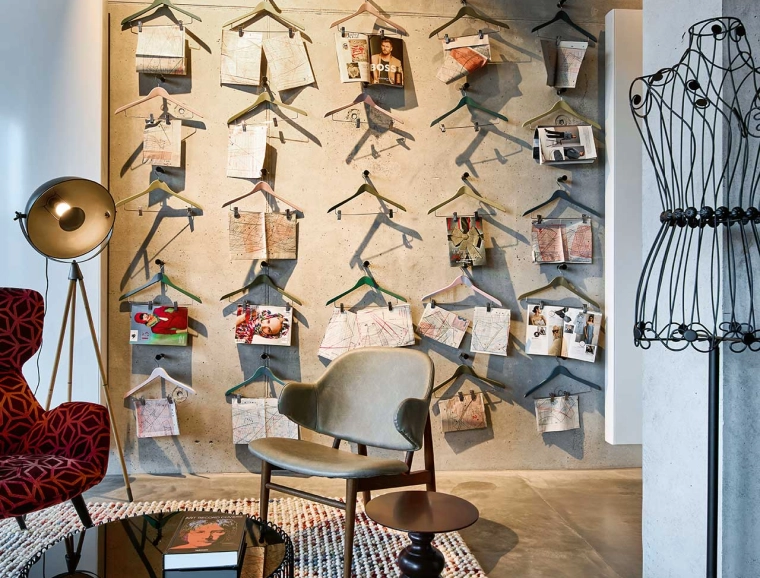 A catwalk runs as a common thread through the lobby, past various curated areas that refer to the Outletcity's origins in the textile industry with creative details. Innovative light installations, quotes from the fashion world on the ceiling, Hollywood make-up mirrors and a counter with an iridescent surface playfully round off the concept. The bar also serves as a reception and the lobby as a café and breakfast restaurant, which is also very much appreciated by lokals.