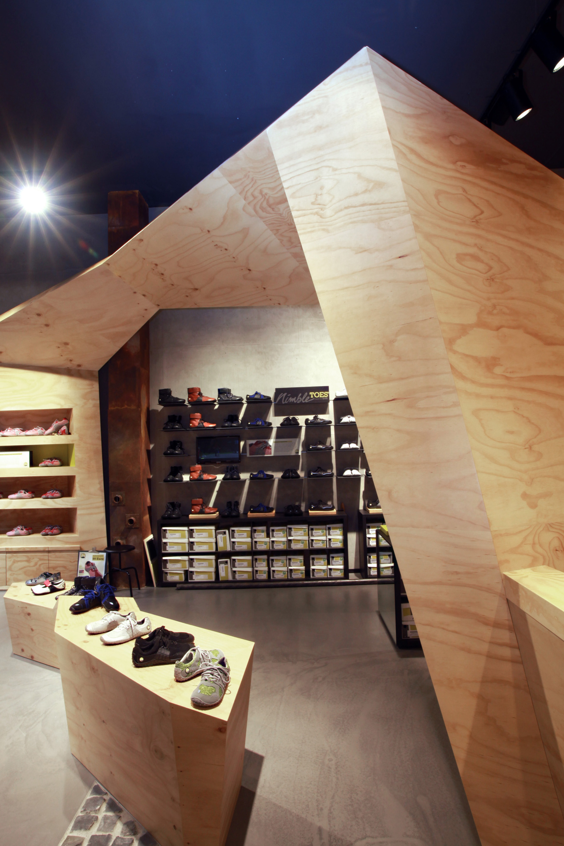 The central eye catcher: the indoor course – inspired by nature - which the interior designers planned in close cooperation with Parkour professionals. The folded spruce wood construction develops from the wooden backwall close to the entry and builds an almost room traversing ark. It’s extension forms a counter – not only a checkout area but also meeting point and bar where organic drinks are served. In front, a central piece of furniture for special presentations repeats the expressive shape of the wooden sculpture – accompanied by a test track with different surfaces. The whole store becomes a playground for Parkour runners – and to a welcomed meeting point for regular workshops.