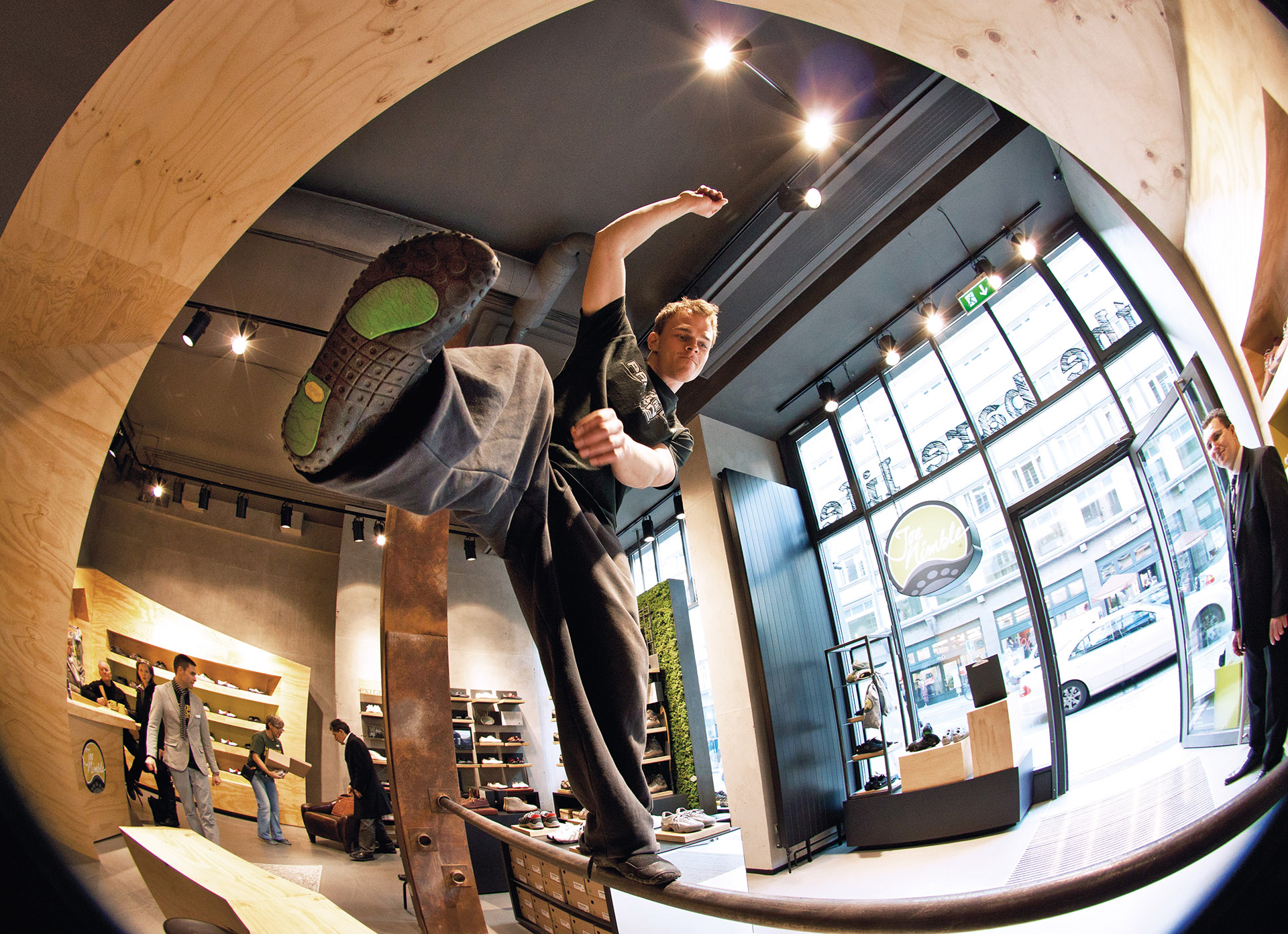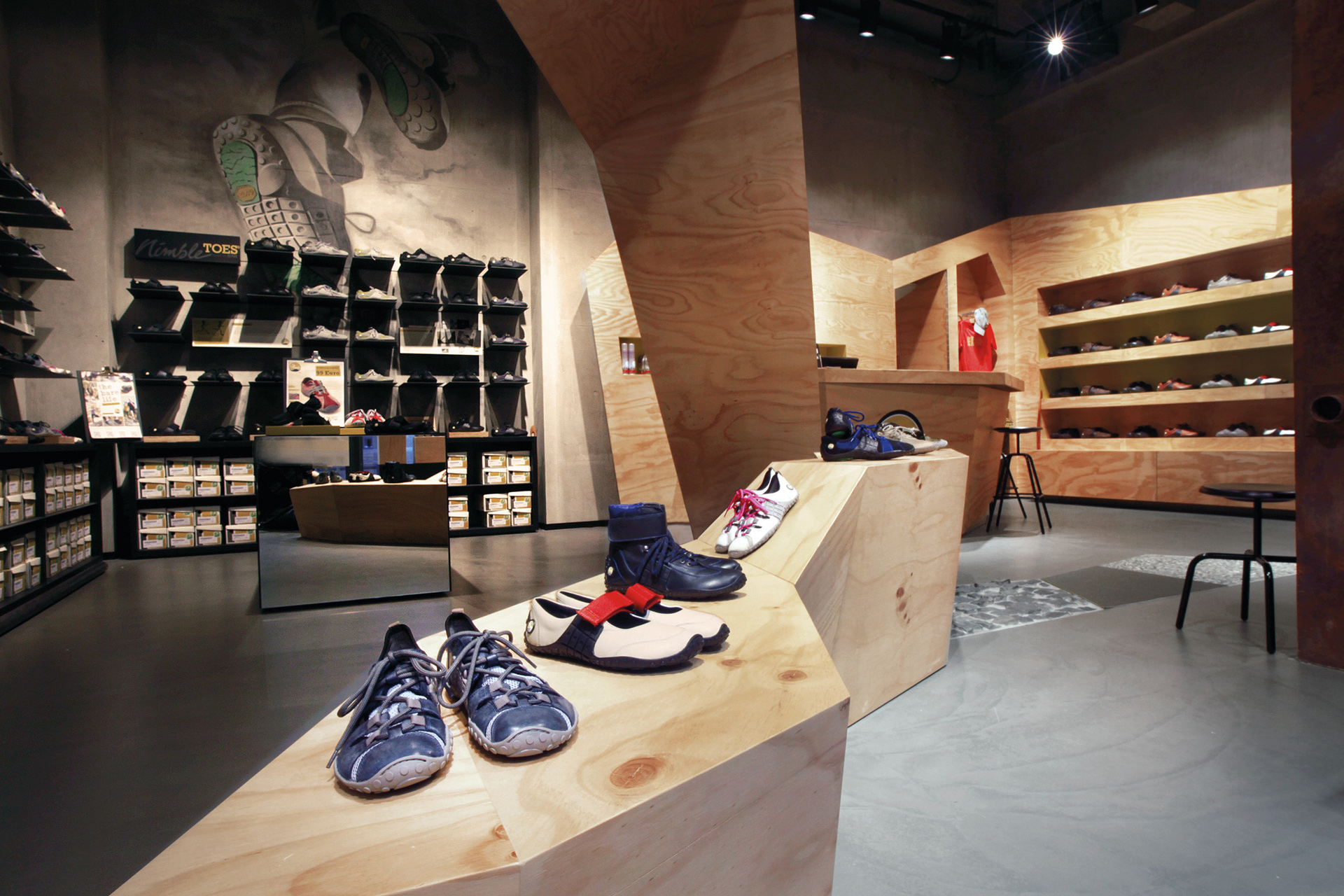 Shoes with a barefoot feeling: The so-called Nimbletoes attract young sport enthusiasts around the globe. blocher shops paid tribute to them with the store at Berlin Friedrichstraße. Both playing fields of the Parkour sport, city and nature, are expressed within the store design. The urban living space is represented by rough materials. Concrete, screed, stone, metal and the rough, black ceiling spread a creative flair – as does the graffiti wall at the opposite of the entry. Small screens and boards introduce with graphics and films to the world of Joe Nimble and tell of its connection to nature. This environmental spirit is also expressed through warm, structured material like brushed wood or a greened moss back wall.