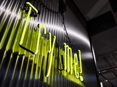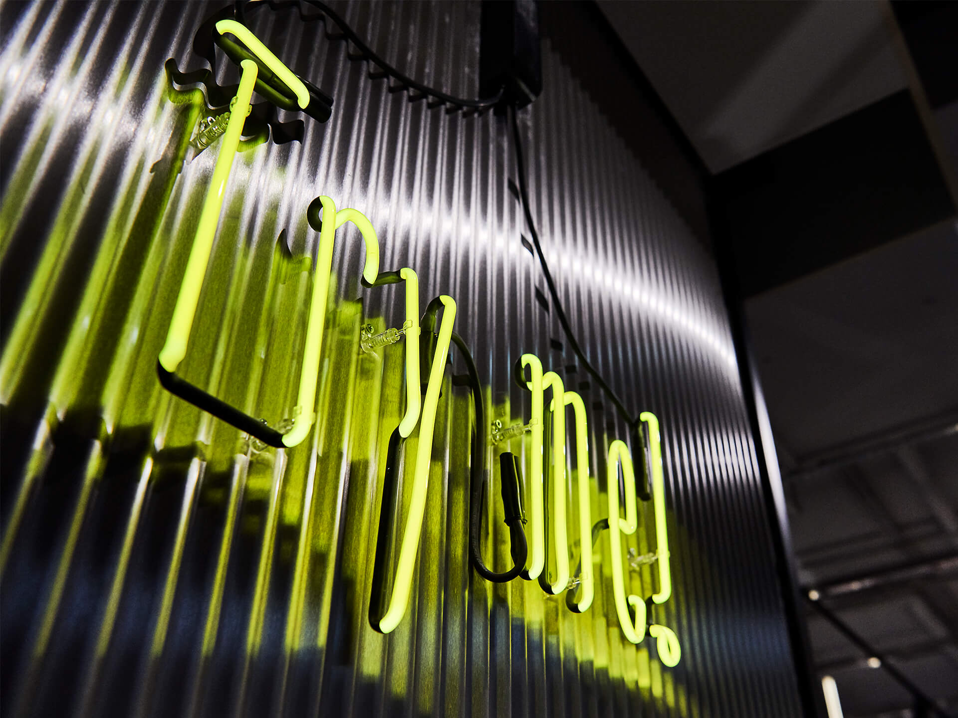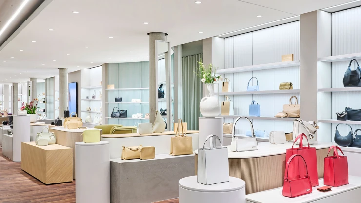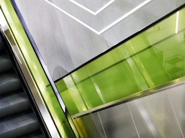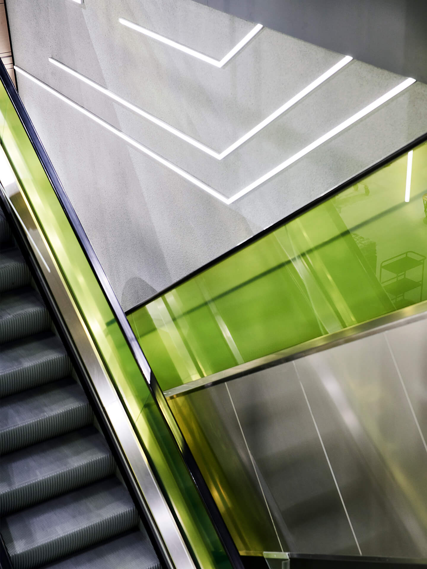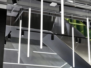 The interior designers also used lighting to structure the space: suspended from the ceiling, vertical light wands show the way to the further reaches of the sales area while at the same time selectively reducing the effective ceiling height. LED wall elements and horizontal lights hung from the ceiling lead to the escalators that bring visitors to the men’s department on the second floor. Neon lettering on the walls also serve as signposts and heighten the store’s modern ambience.