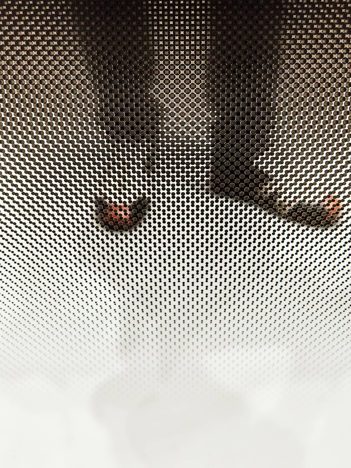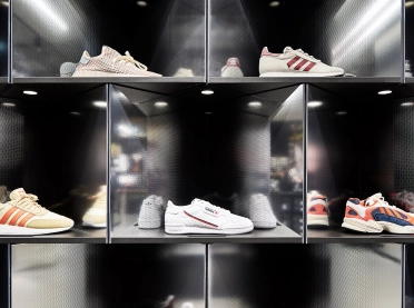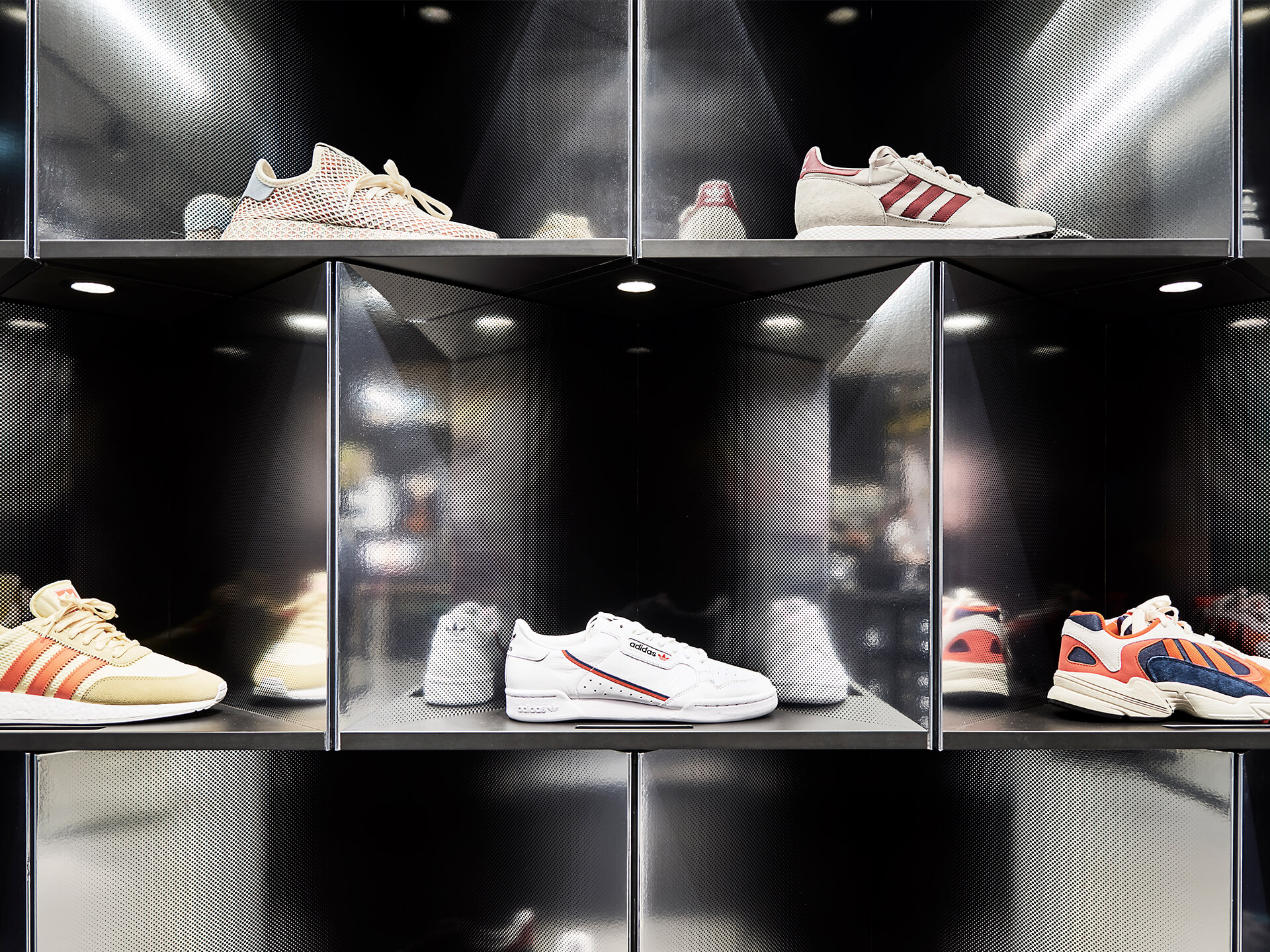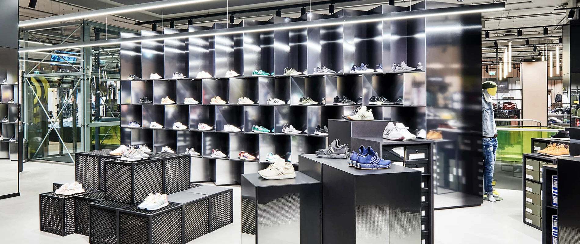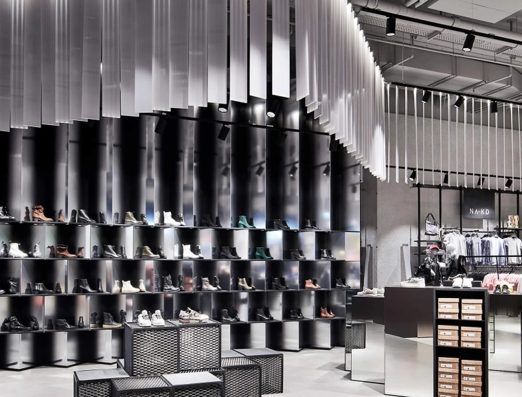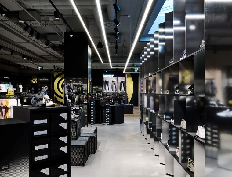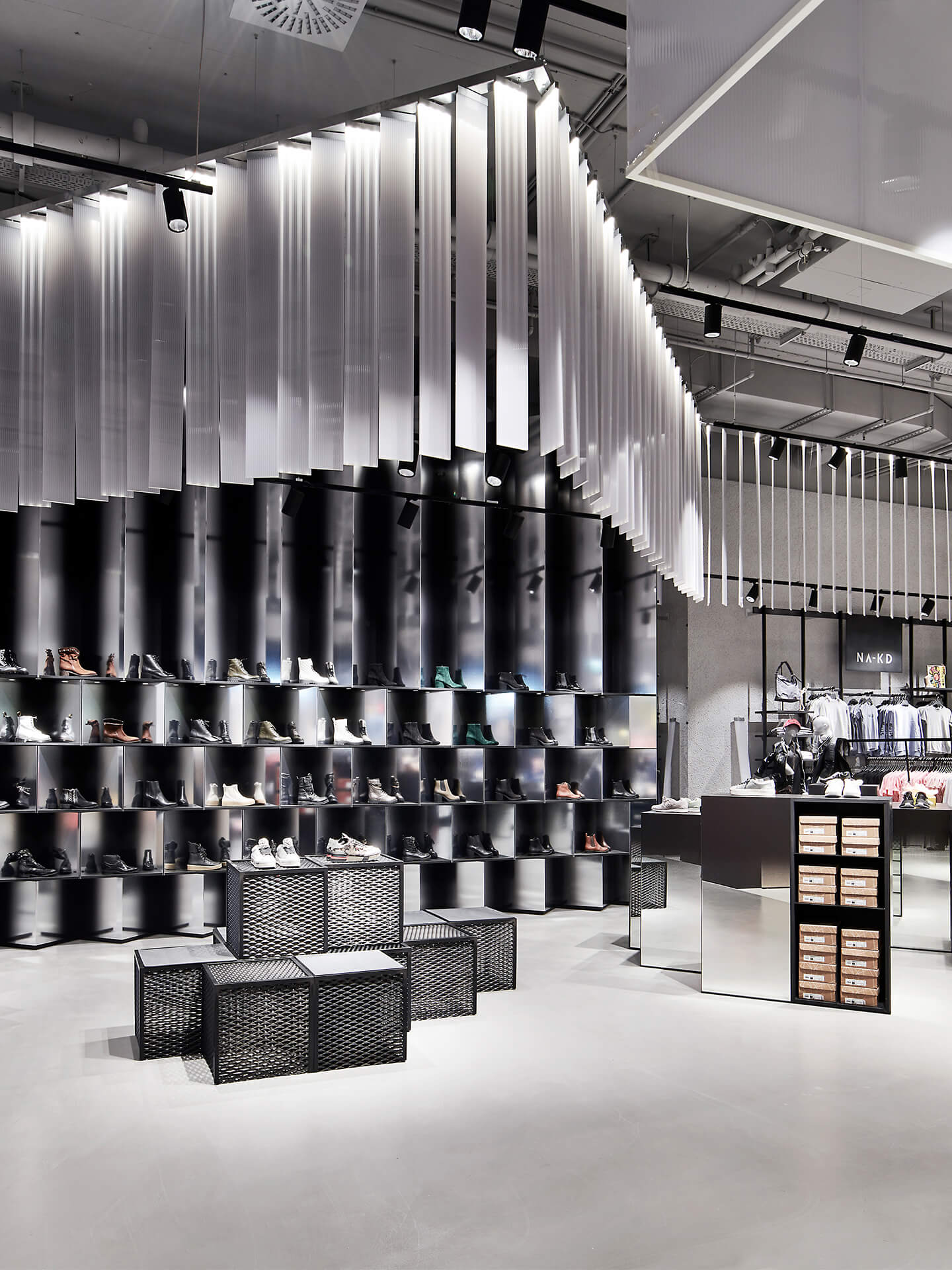 Aside from the huge selection of jeans and related attire, the Infected store also offers an enticing assortment of shoes for women and men. Footwear is displayed against vertically folded highlight walls several meters high. Individual shoes are slipped into horizontal niches in the folded walls. The transition from reflective to darker surface emphasizes the folds’ three-dimensional effect, ensuring an effective visual presentation.