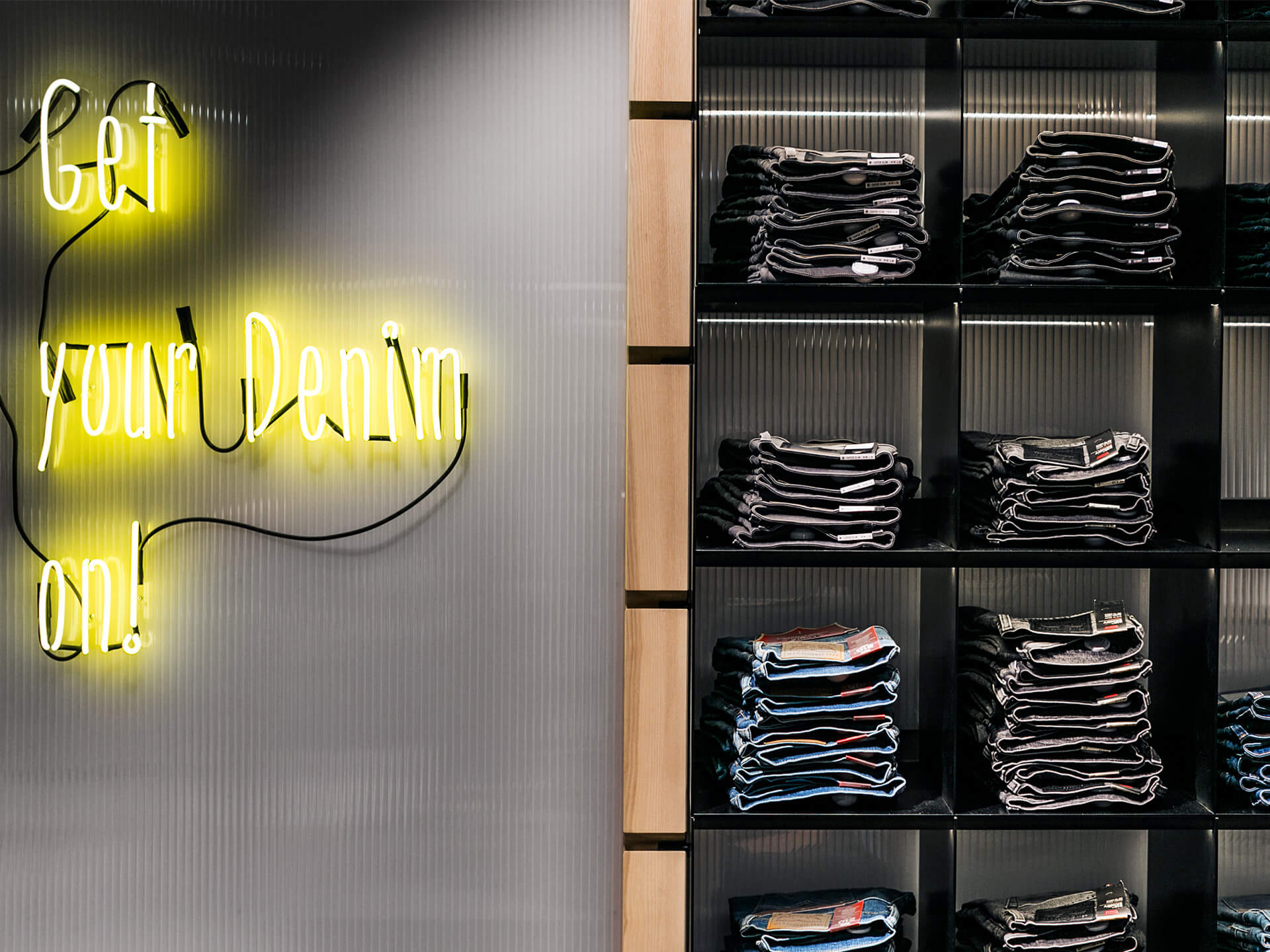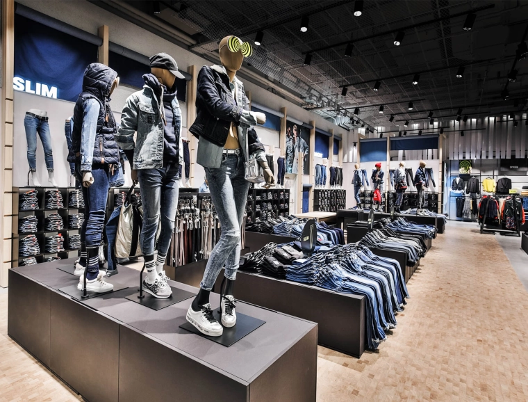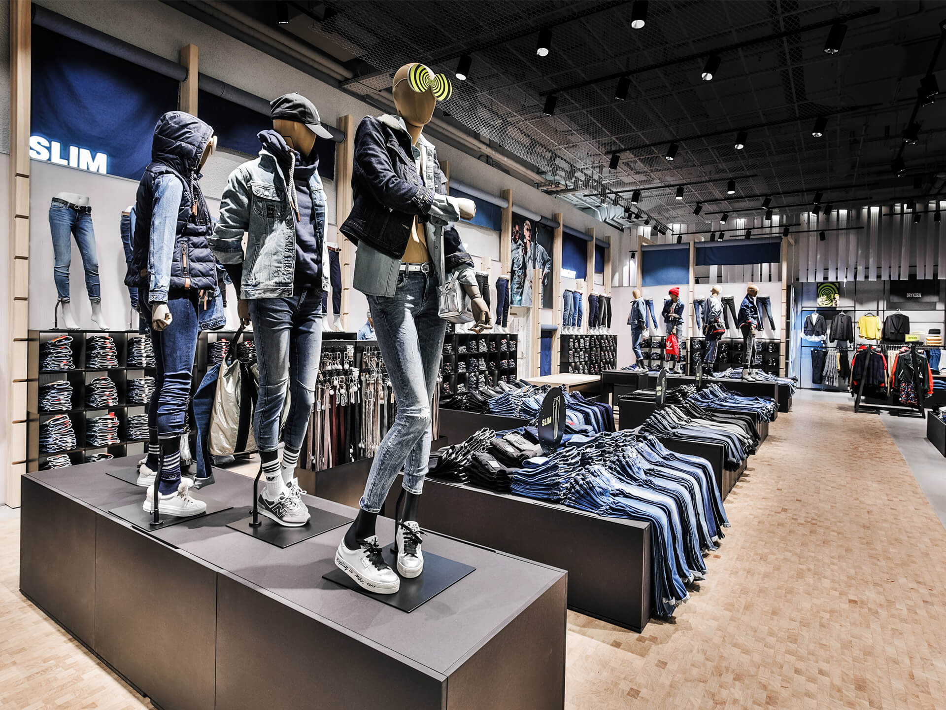 What makes an authentic store for denim fans, young and old? Most designers, given this challenge, would dig deep into the nostalgia box. But the concept developed by blocher partners interior designers is oriented towards the future. Gleaming metal elements, references to the manufacture of jeans, and high, open ceilings create an appealing atmosphere.