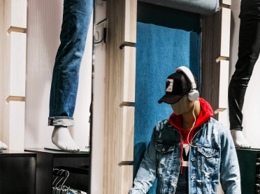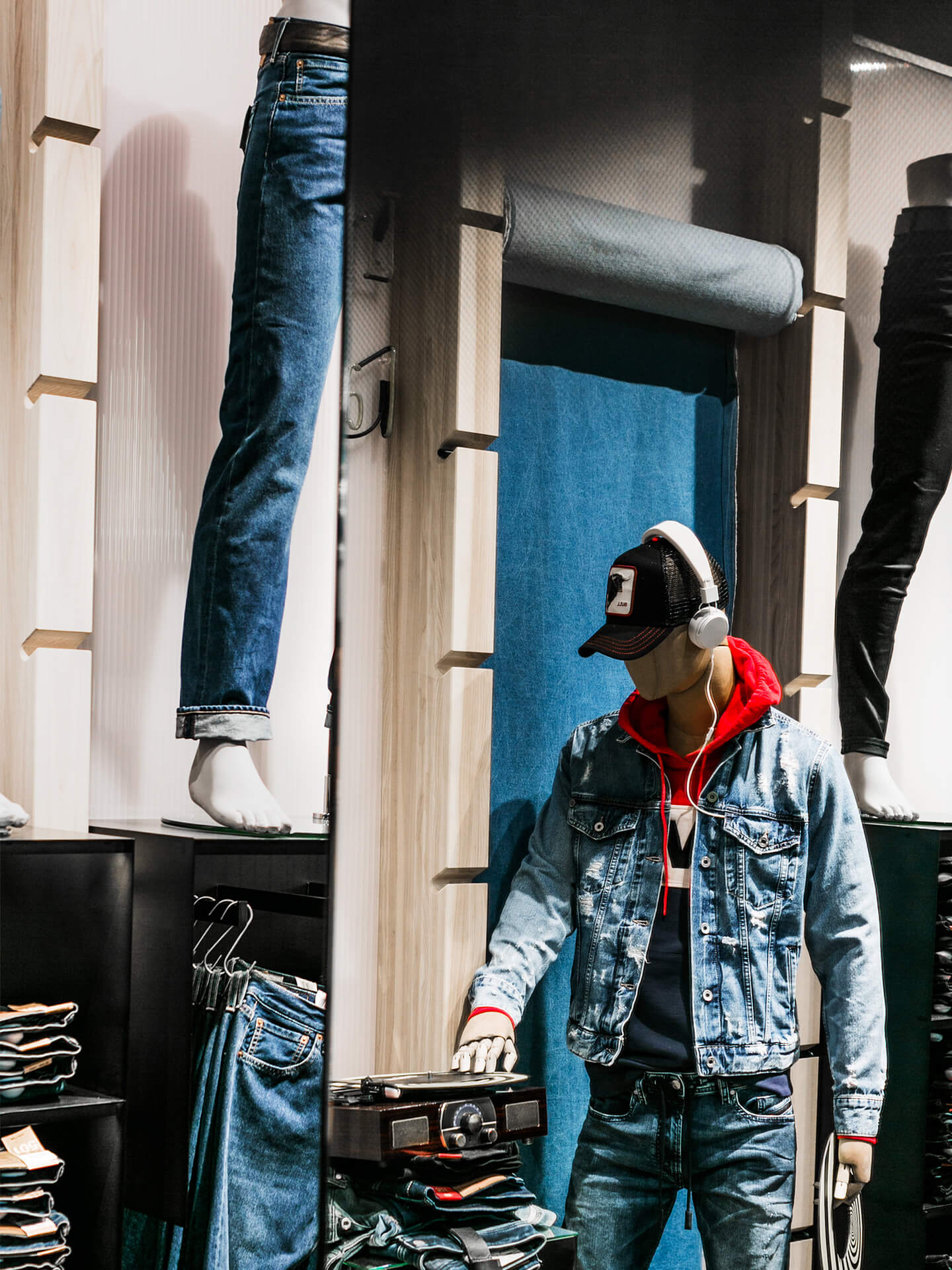 To maximize the store’s draw within the mall, the interior designers placed an approximately 90 square meter, flexible LED wall above the entrance, welcoming visitors into the world of Infected. The big impression continues inside: Ceilings more than five meters high on the first floor in the women’s department create the perfect setting for an industrial look. Partial wall coverings of corrugated iron, terrazzo tiles and double-webbed polycarbonate slabs subdivide the space. The furnishings fit: mid-space fittings of dark metal, display shelves of black crude steel and cubes of expanded metal. Rolls of denim material suspended on wooden frames refer to the manufacturing process.
