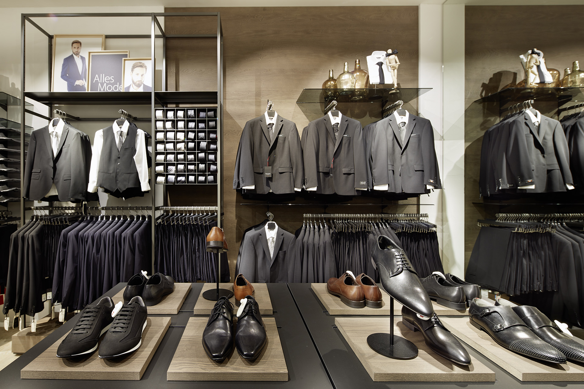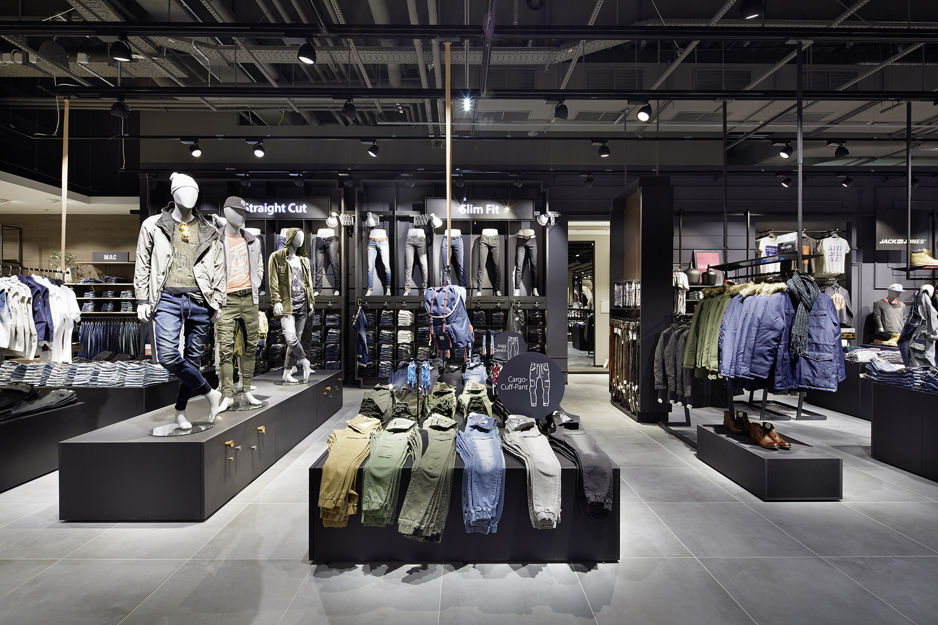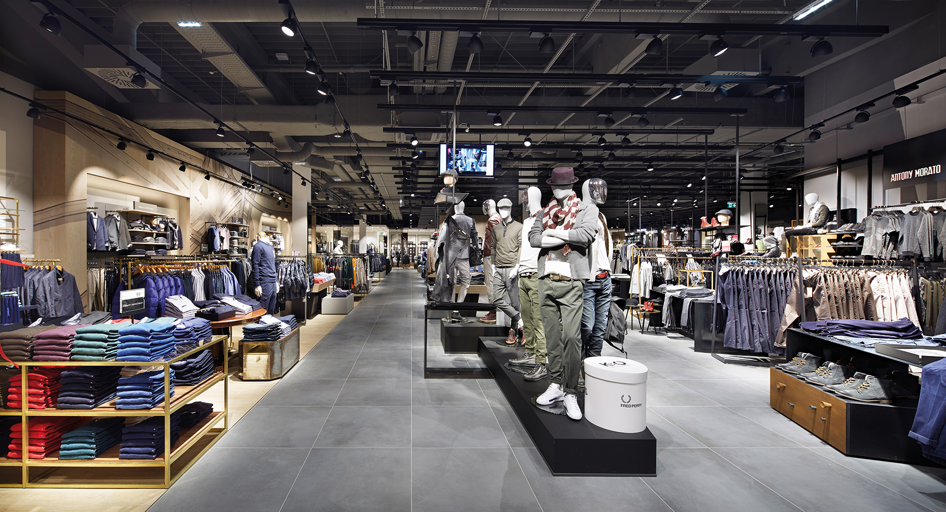 Younger and sportier brands and accessories are presented in the central zones and in front of the White Boxes. Strikingly patterned tiles on the ground floor differentiate the accessories area. On the first floor above ground, a special ceiling of dark grey trapezoidal metal strips marks the central zone, with a decidedly masculine accent. Eye-catchers on both levels: the asymmetrical wooden changing cubicles, which reach the ceiling and serve as sculptural elements in the central area, in some cases interrupting the suspended ceiling elements.
