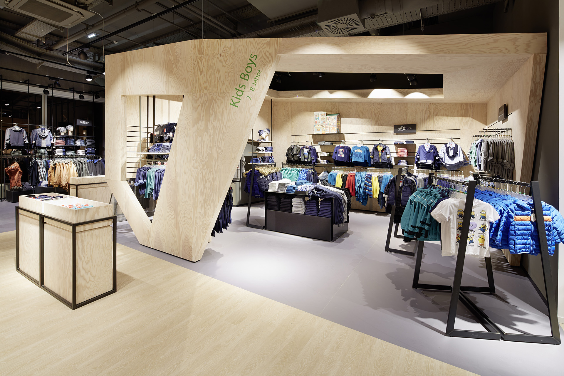 With 150 square meters on the ground floor, the Kids' World is multi-faceted. Separated from the women's department, the space is defined on the left and right by two house-in-house constructions: While boys can play in a stylized tree-house atmosphere, the girls' department has a dreamlike atmosphere, with wall paintings of local plants and animals. Between the two sections, a landscape of presentation cubes lead into the niches where teens can find their favourite brands, including a wall of jeans.