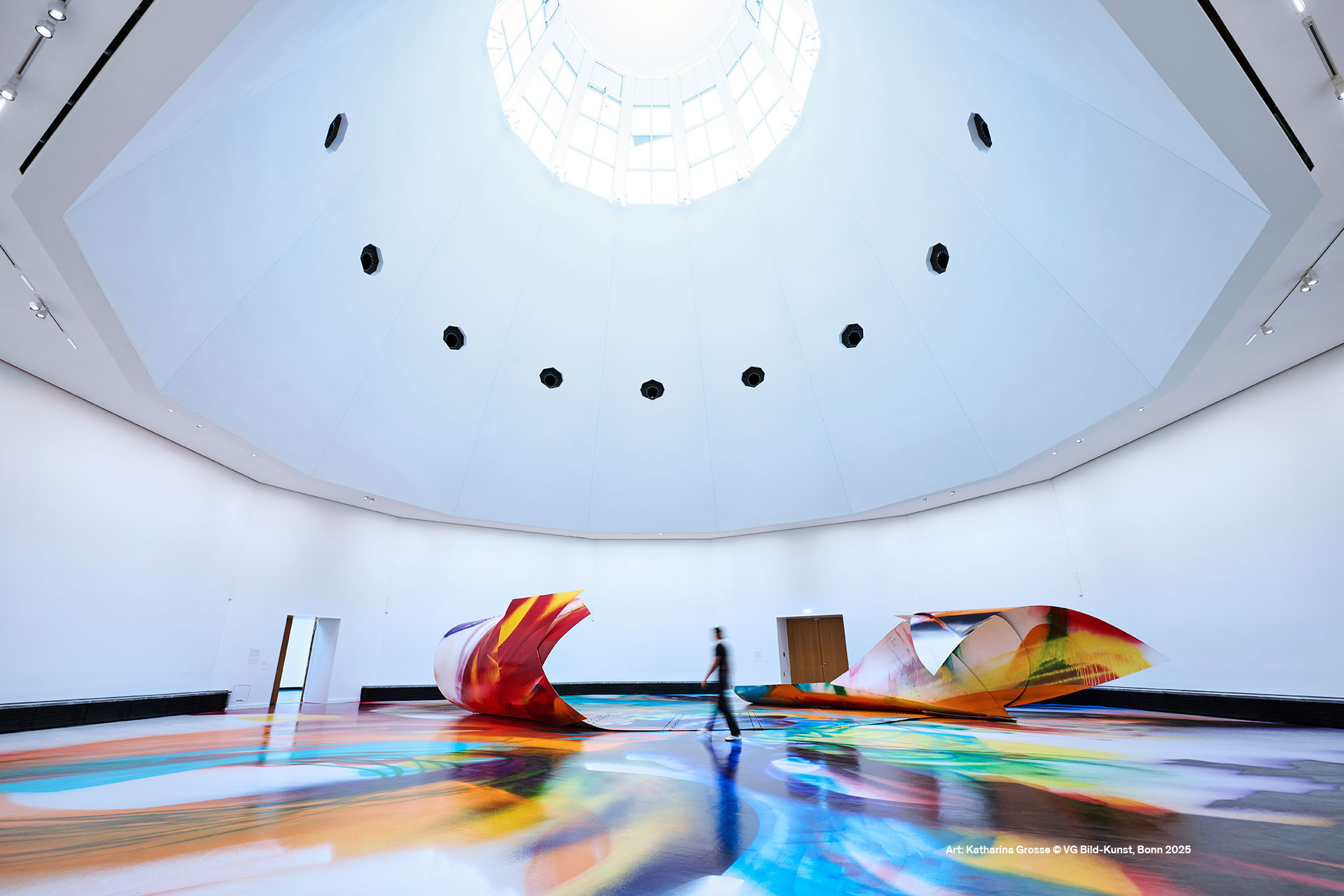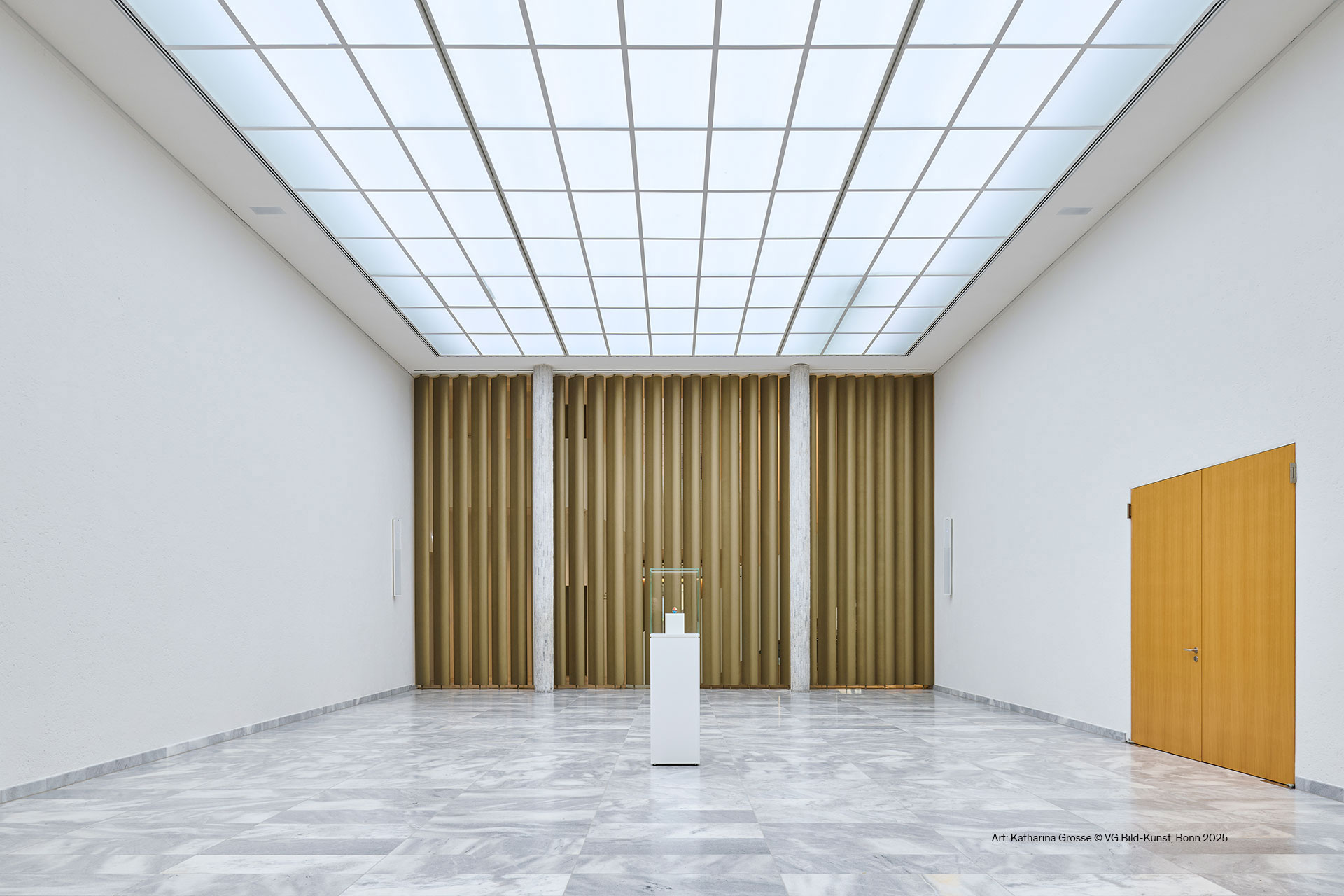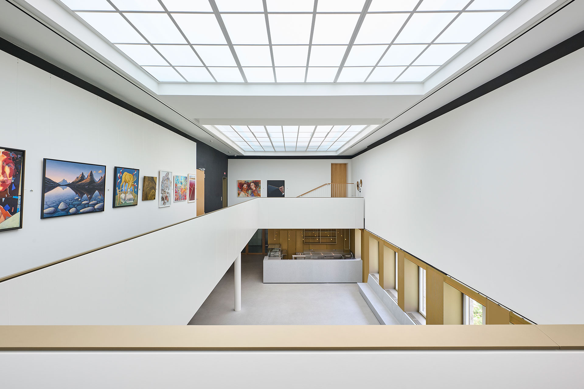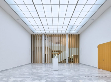 Visitors first enter a reception hall, followed by the so-called Marble Hall, which has a dynamic louvre wall on the two narrow sides. These anodised aluminium slats are white on one side and golden on the other. Whilst they are fixed on the right-hand wall, they can be moved on the left-hand wall. If they turn out of the axis of the wall, the room opens up to the neighbouring room. However, if the wall is closed, it also provides acoustic impermeability. The white surface can be used as a screen for projections. The complete basement of the Marble Hall has created additional space to accommodate the cloakroom and sanitary facilities. A staircase integrated into the existing building, including lift shafts, provides access from the basement to the first floor. Behind the Marble Hall, the domed hall can be accessed through an intermediate space. The architects were particularly careful with their interventions here, as it is the centrepiece of the building. They improved the acoustics in the hall and extended the utilisation profile. The restaurant on the ground floor was also given a facelift, including the terrace. In keeping with Theodor Fischer's original plans, the architects partially removed the ceiling above the dining room, creating a spacious atmosphere in the restaurant and a dialogue between the dining room and the exhibition hall above.