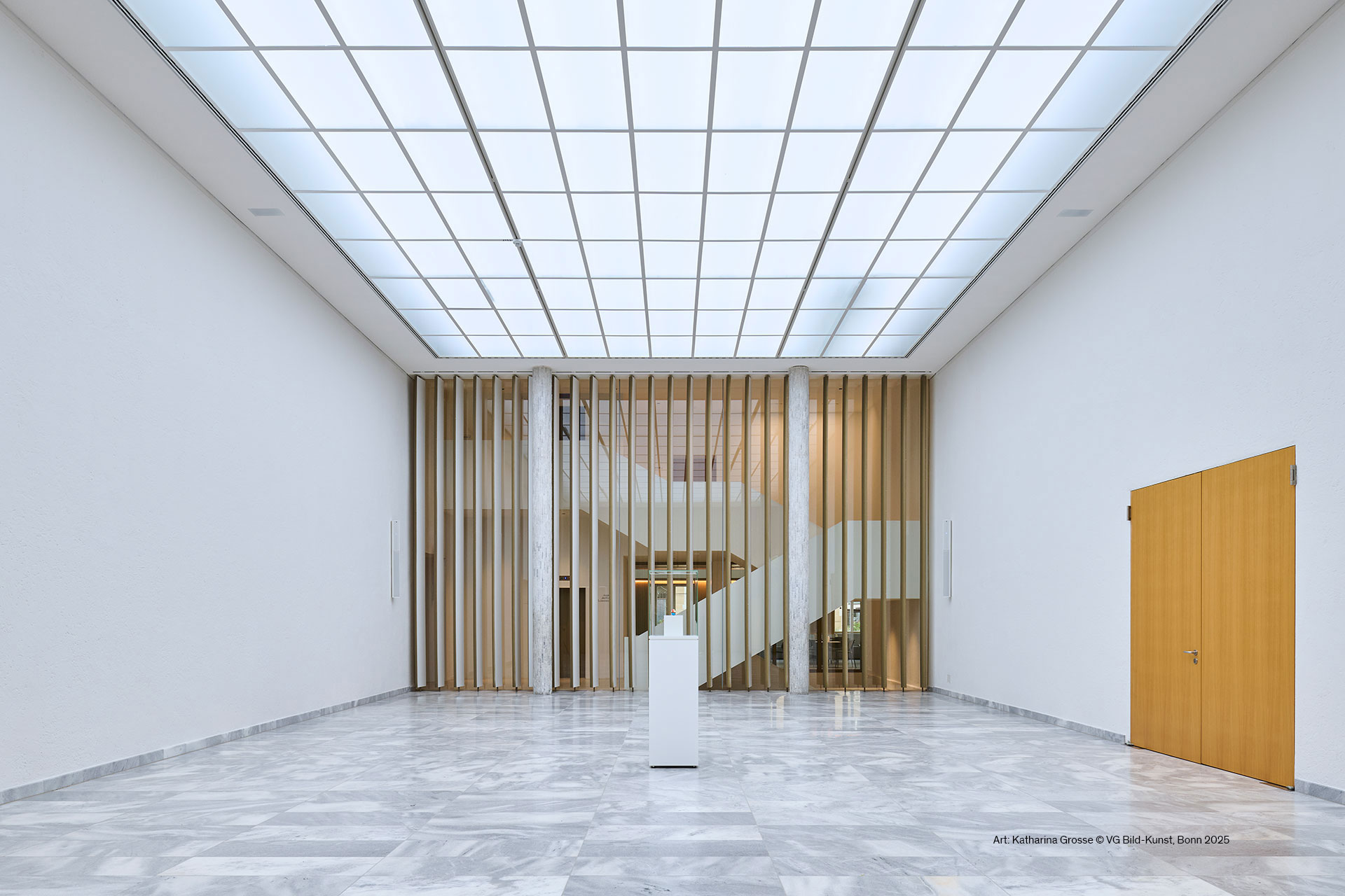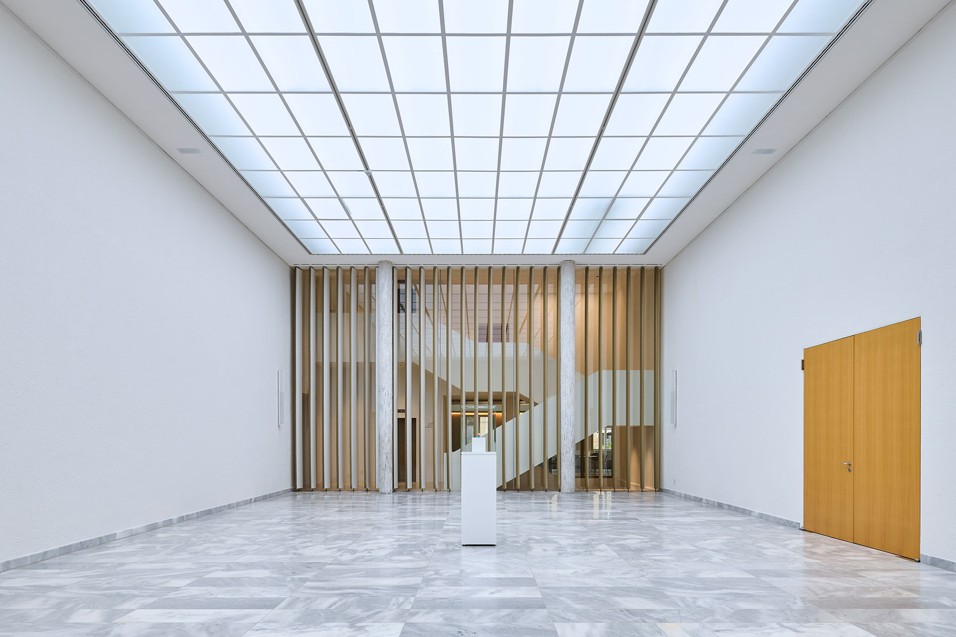 The architects renovated the building envelope conservatively. They moved the main entrance from the centre axis to the right-hand edge and accentuated it discreetly with the help of a glazed portal in front with a frame made of burnished bronze. ‘Visitors should feel the high quality of the monument as soon as they enter the building,’ explains Wolfgang Mairinger, Senior Partner at blocher partners.