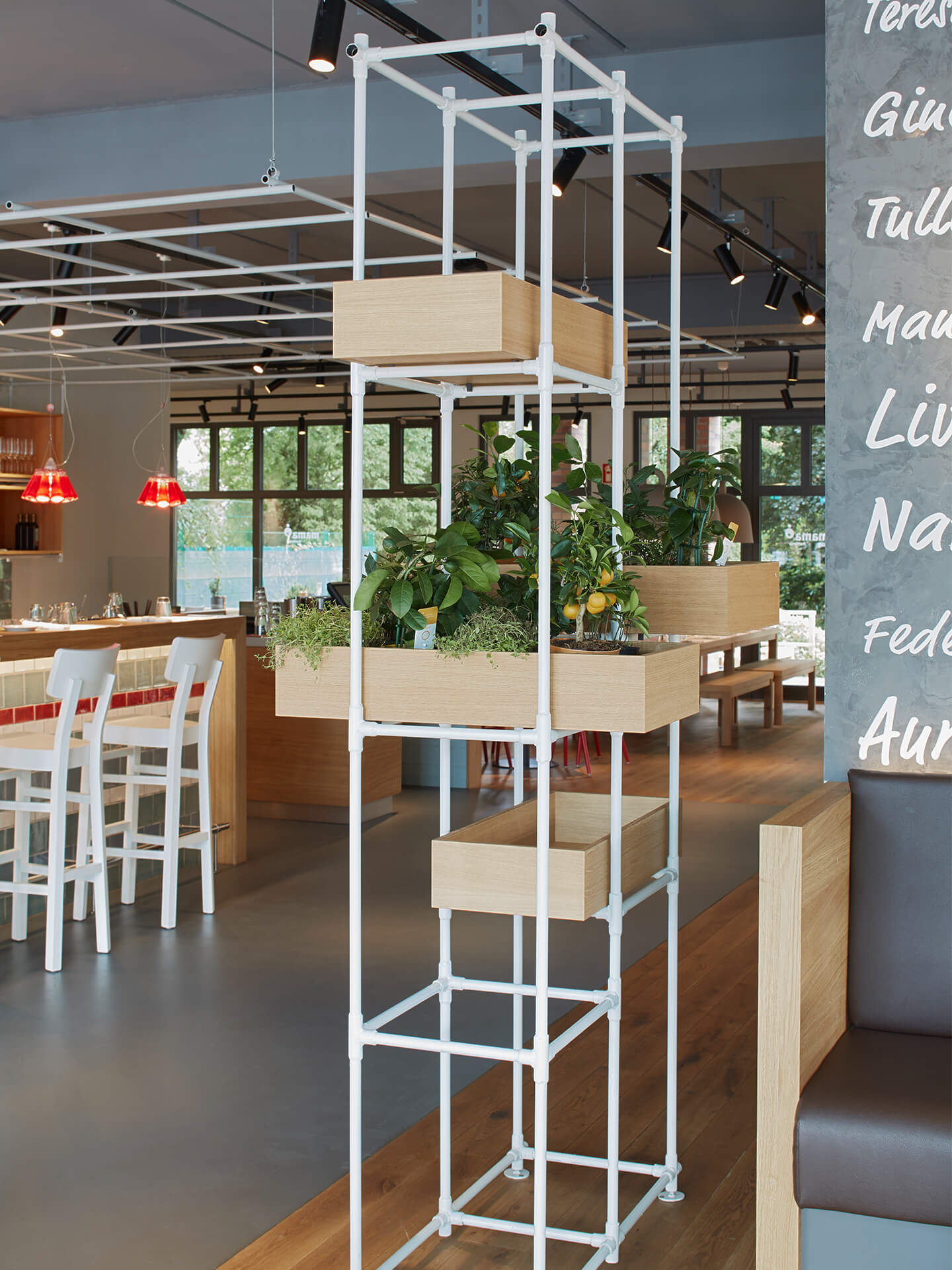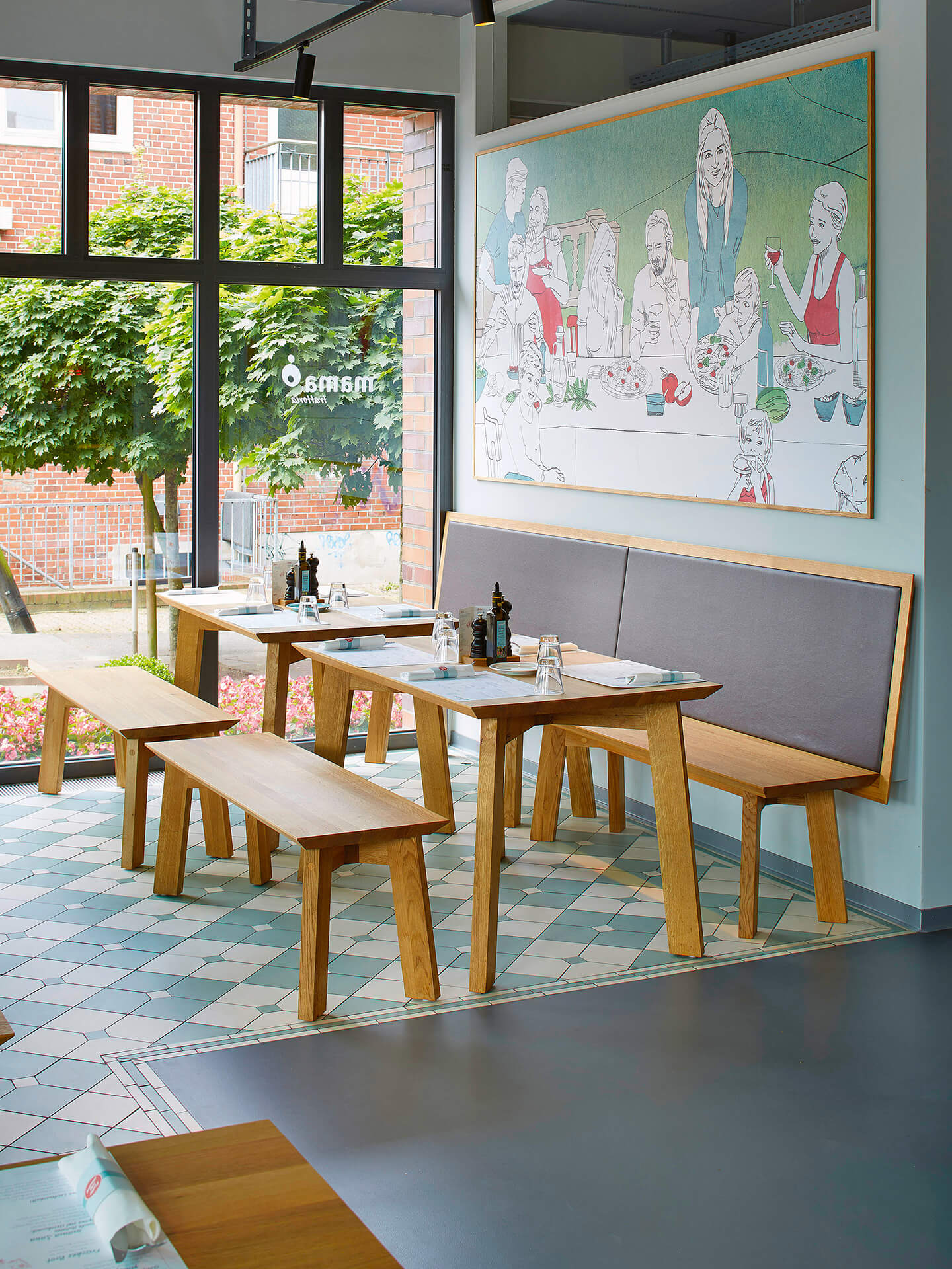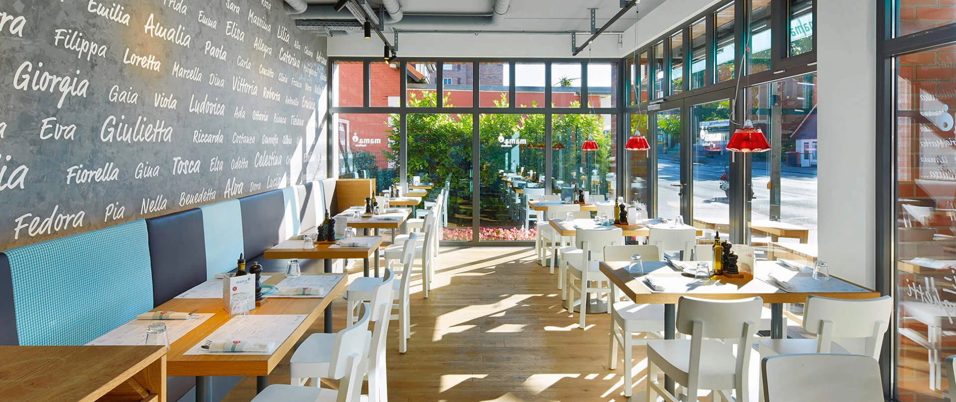 The ambiance is light and reserved, featuring elements of Mediterranean and Scandinavian design. At the same time, the wooden tables and chairs give the restaurant a homey feel. As in every Mama’s restaurant, there is a wall with names of Italian women: a tribute to the mothers whose recipes inspired the restaurant concept.