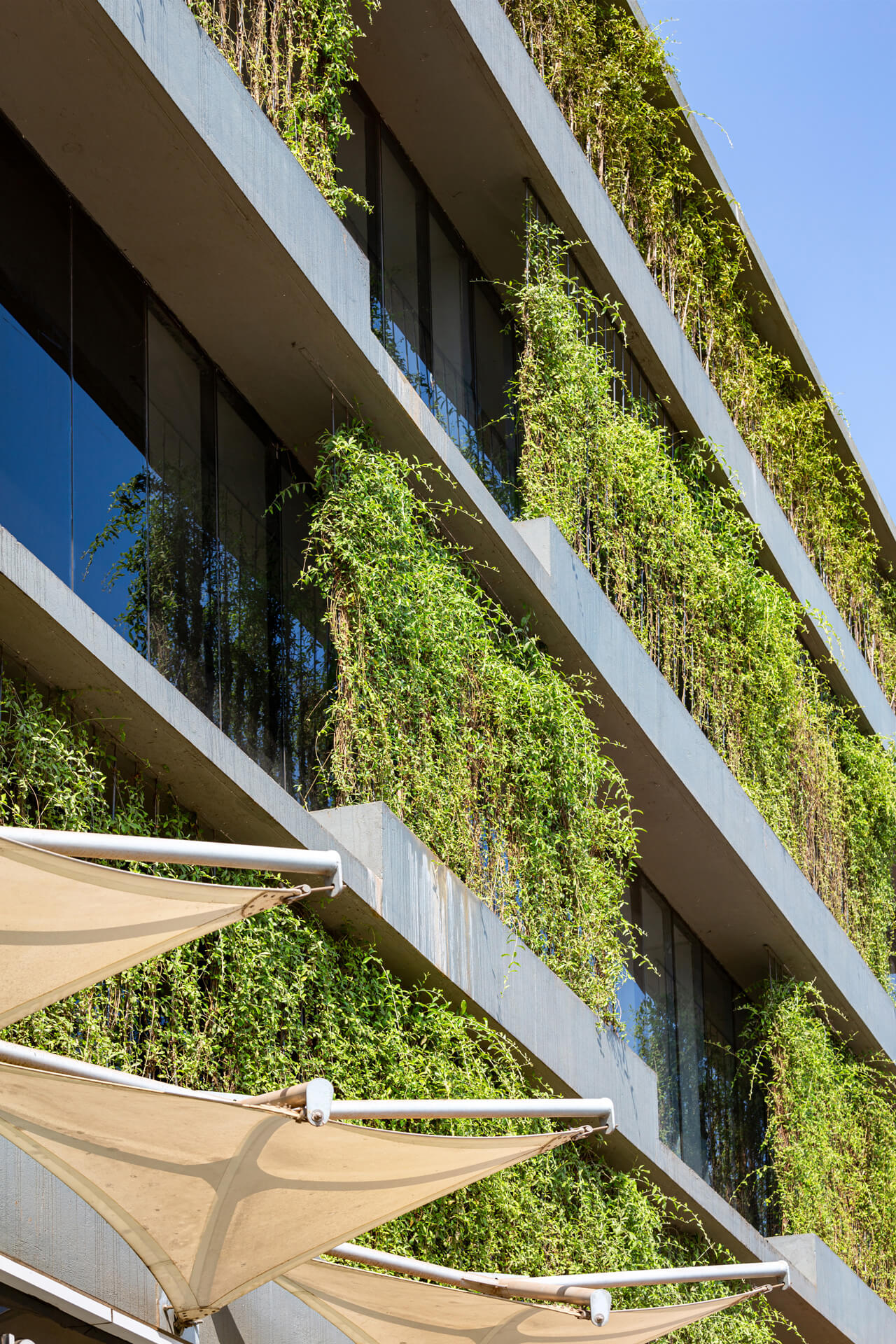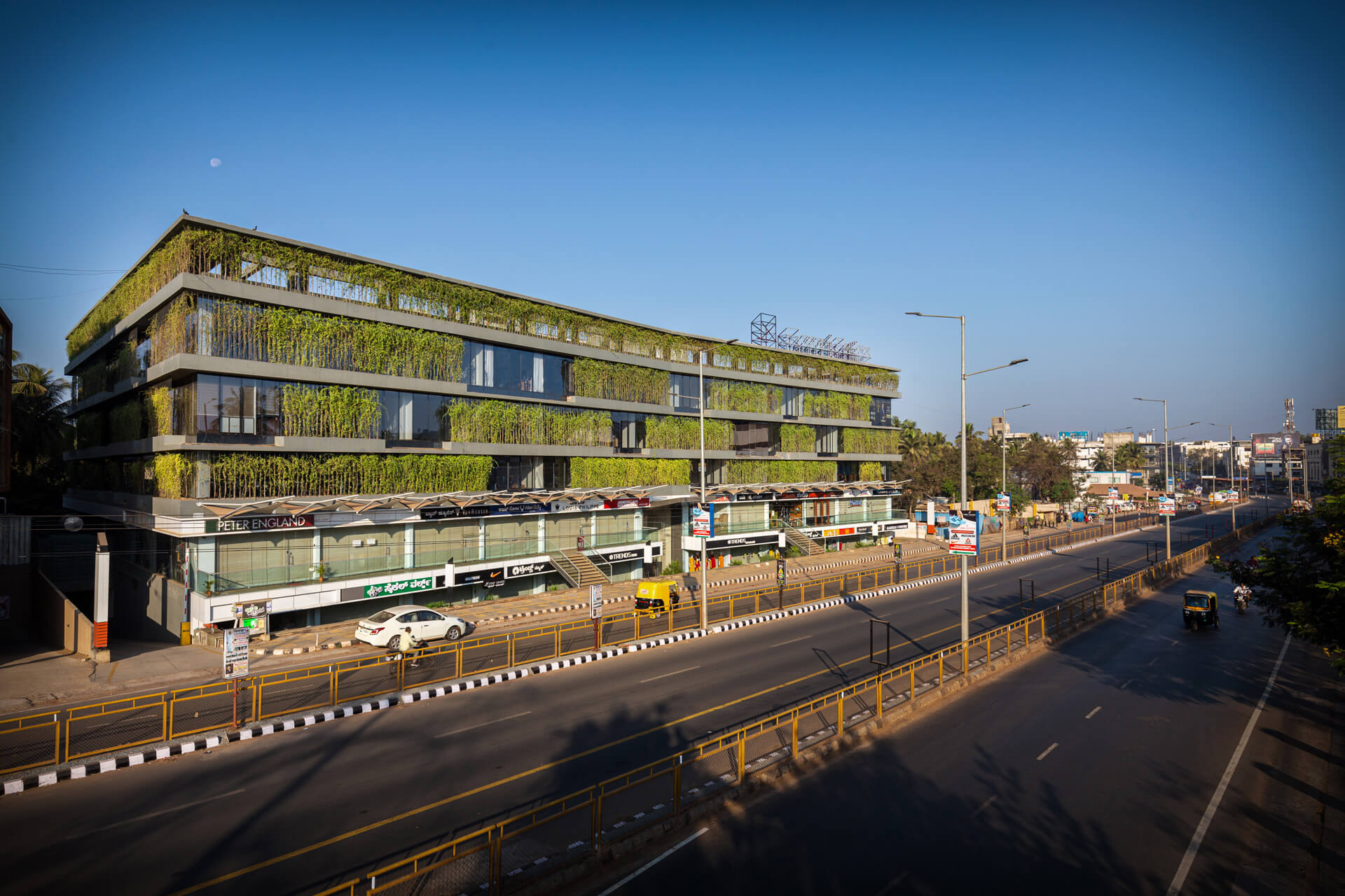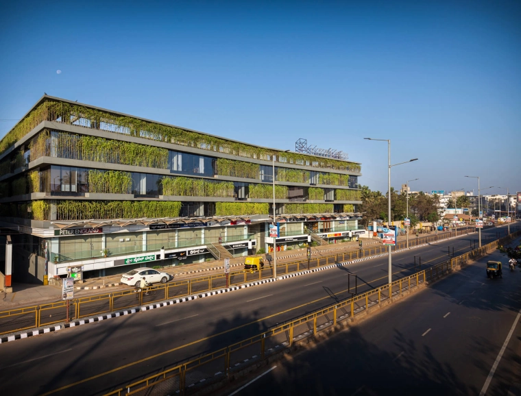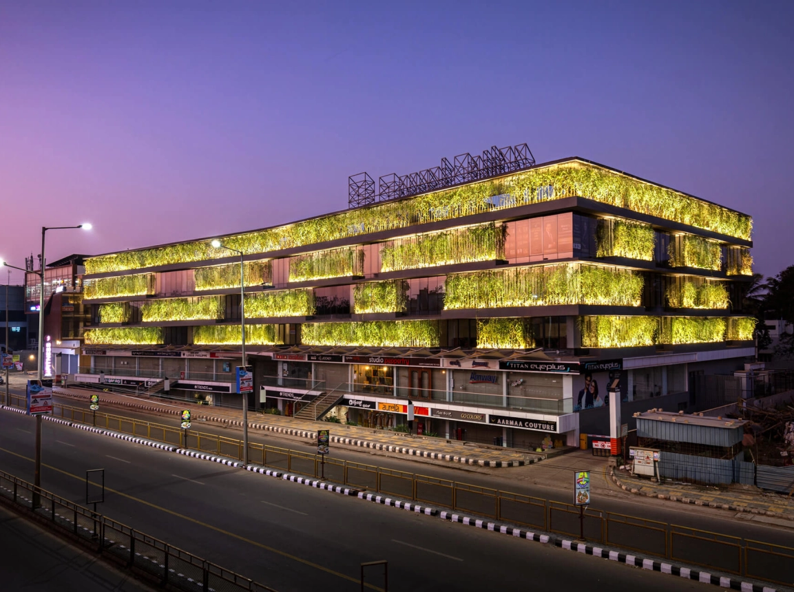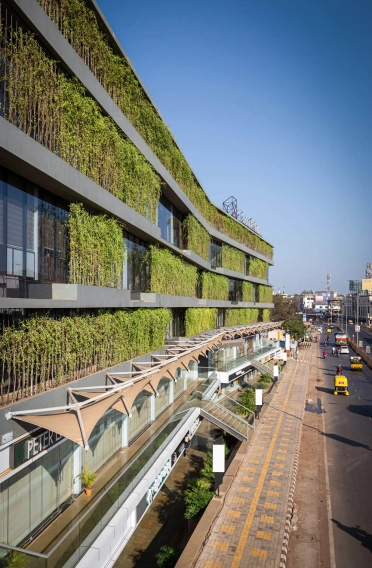 The future looks bright, with the Marvel Artiza retail and commercial building: It will offer attractive space with five storeys of offices and a shopping mall surrounding a central, light-filled atrium. Visible from a distance, the rectangular new building is located on an access road to Hubli, an Indian city with more than a million inhabitants. The architects designed the façade as a vertical garden: plantings help block the sun, create privacy, and draw attention in the urban landscape.