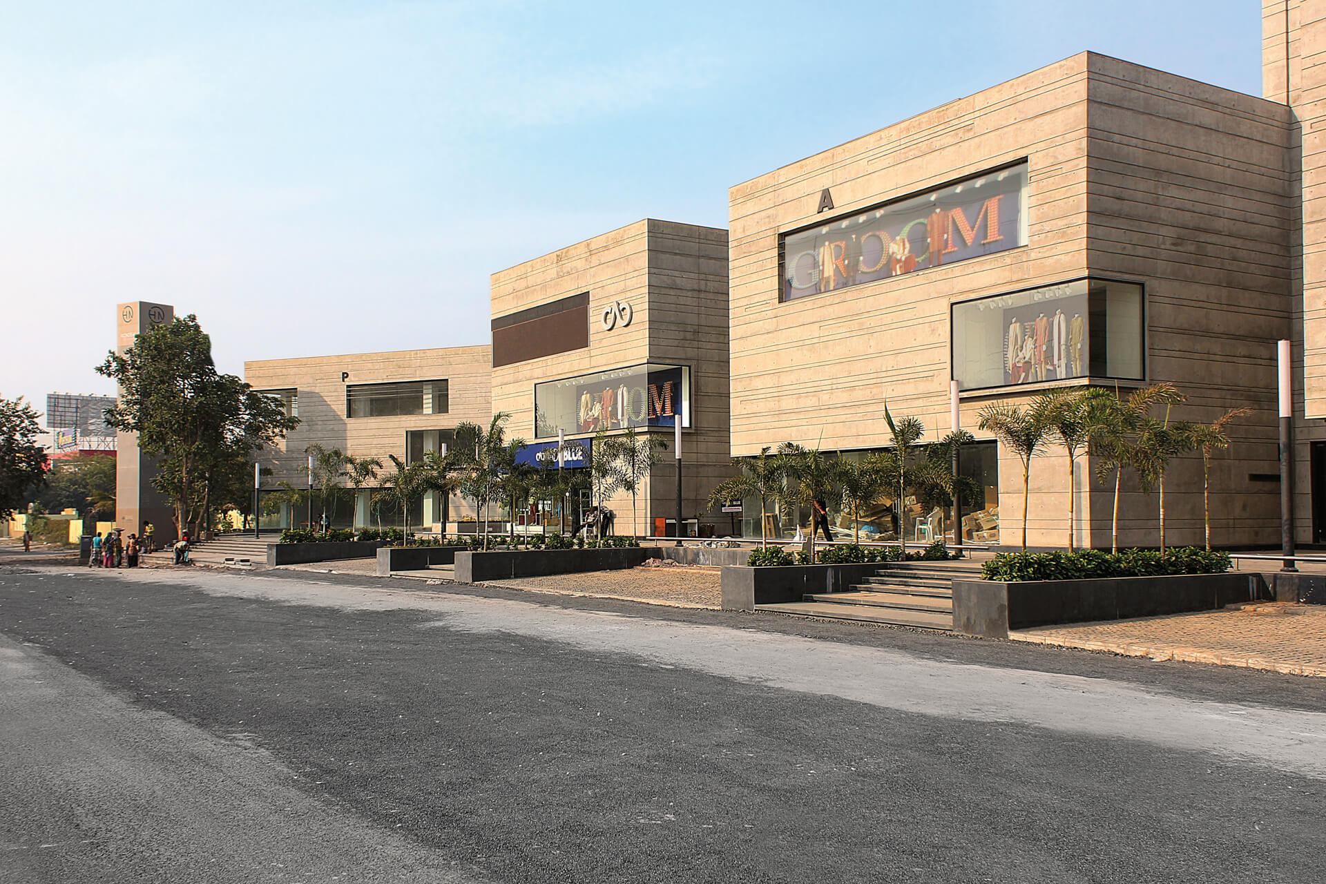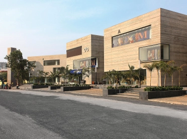 With the Mondeal Retail Park, blocher partners india realized an outstanding ensemble of landmark buildings in one of the most exclusive areas of Ahmedabad. Located at S. G. Highway, an exceptional shopping centre was built on three levels, housing retailers, services and restaurants. A green, shady plaza and ample parking space make the offer complete. The architects built an ensemble with four buildings with a unique appearance. In the Indian sun the façade made of exposed concrete shimmers in variations of beige. It is structured by narrow, horizontal gaps – so, the buildings appear filigree despite their monolithic cubature. This impression is enhanced by the longish window elements. Since 2007, blocher partners has been collaborating with the HN Safal Group, amongst others: Mondeal Heights Ahmedabad.