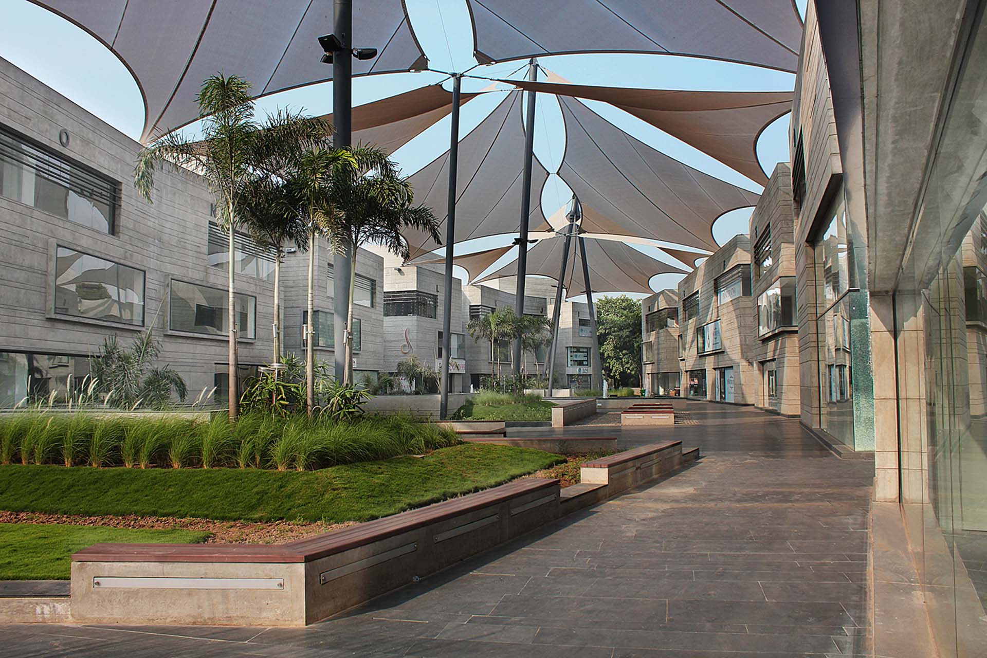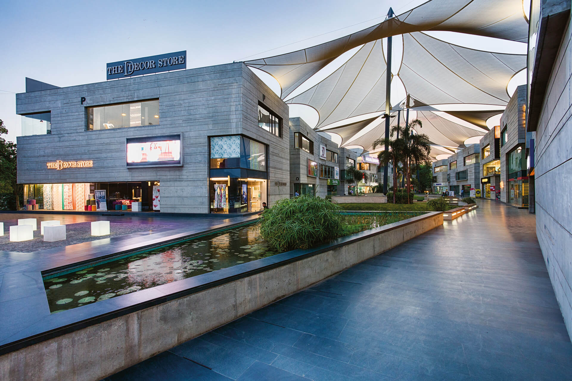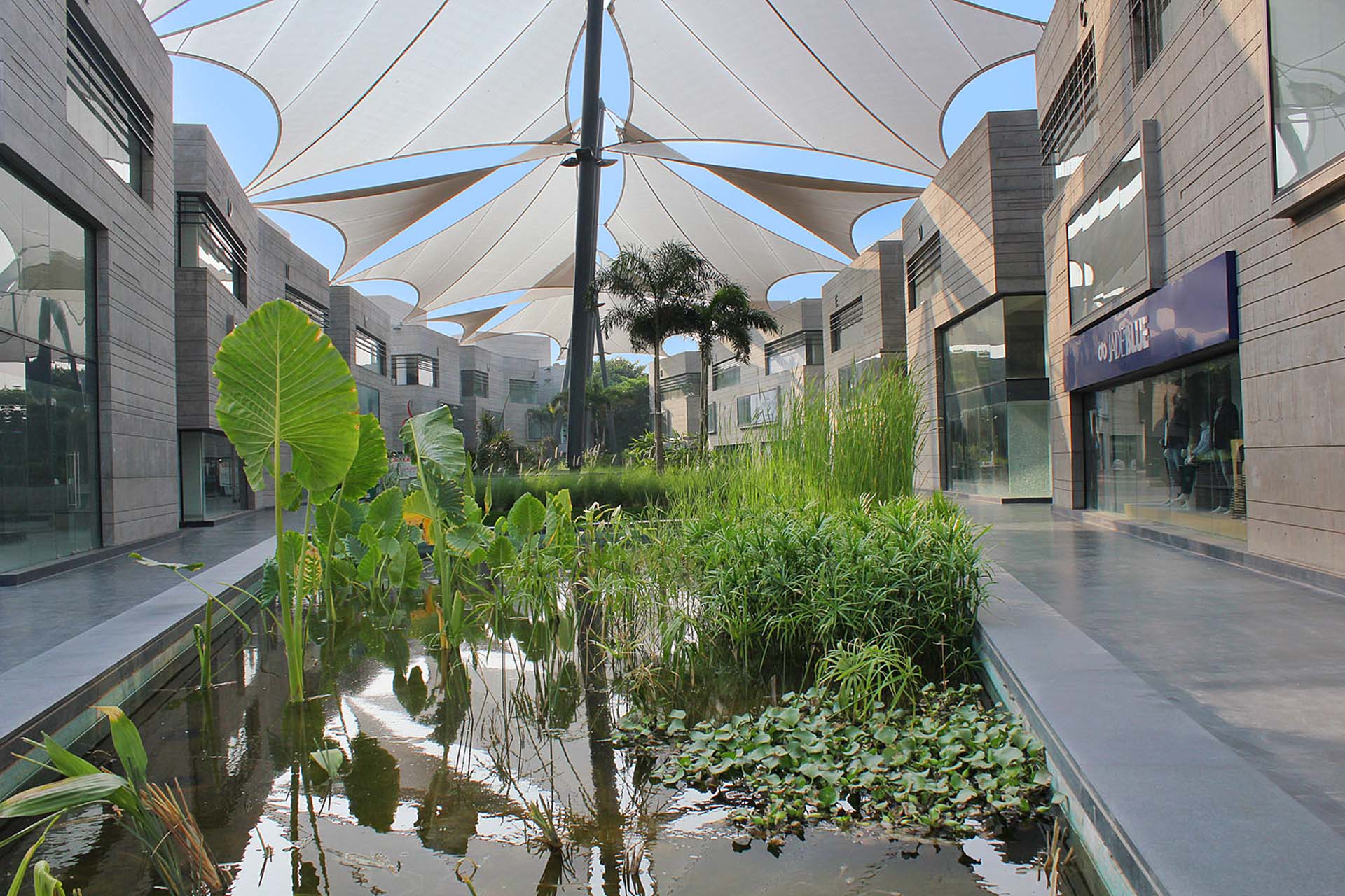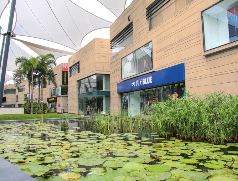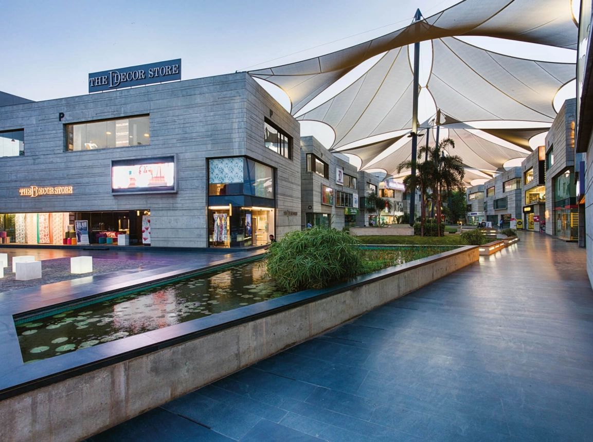 In addition to the hot spot location in an economically flourishing district, this attracts premium and luxury brands. Additionally, the retail park is a place of contemplation and relaxing. blocher partners India realised a grand central plaza and an embedded park landscape with water gardens and places to rest. Tenderly shaded by large-size sails, this place makes sure that family, leisure and shopping are successfully united within this unique complex.1.
