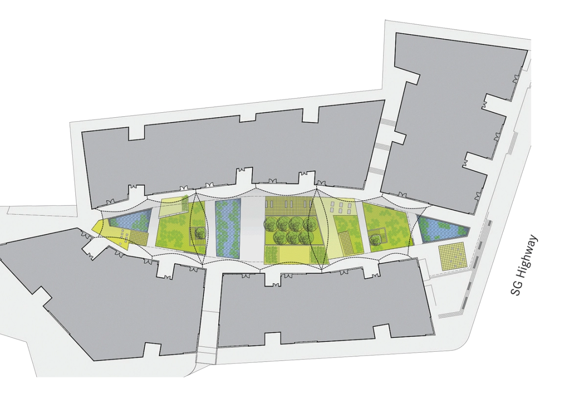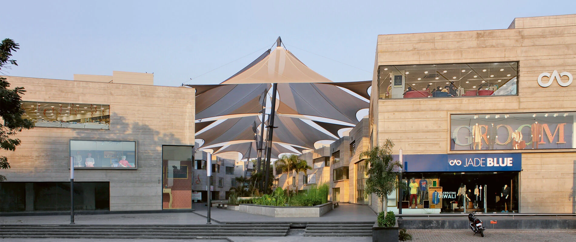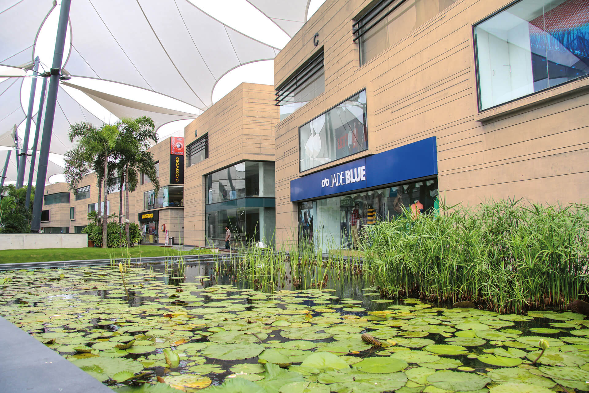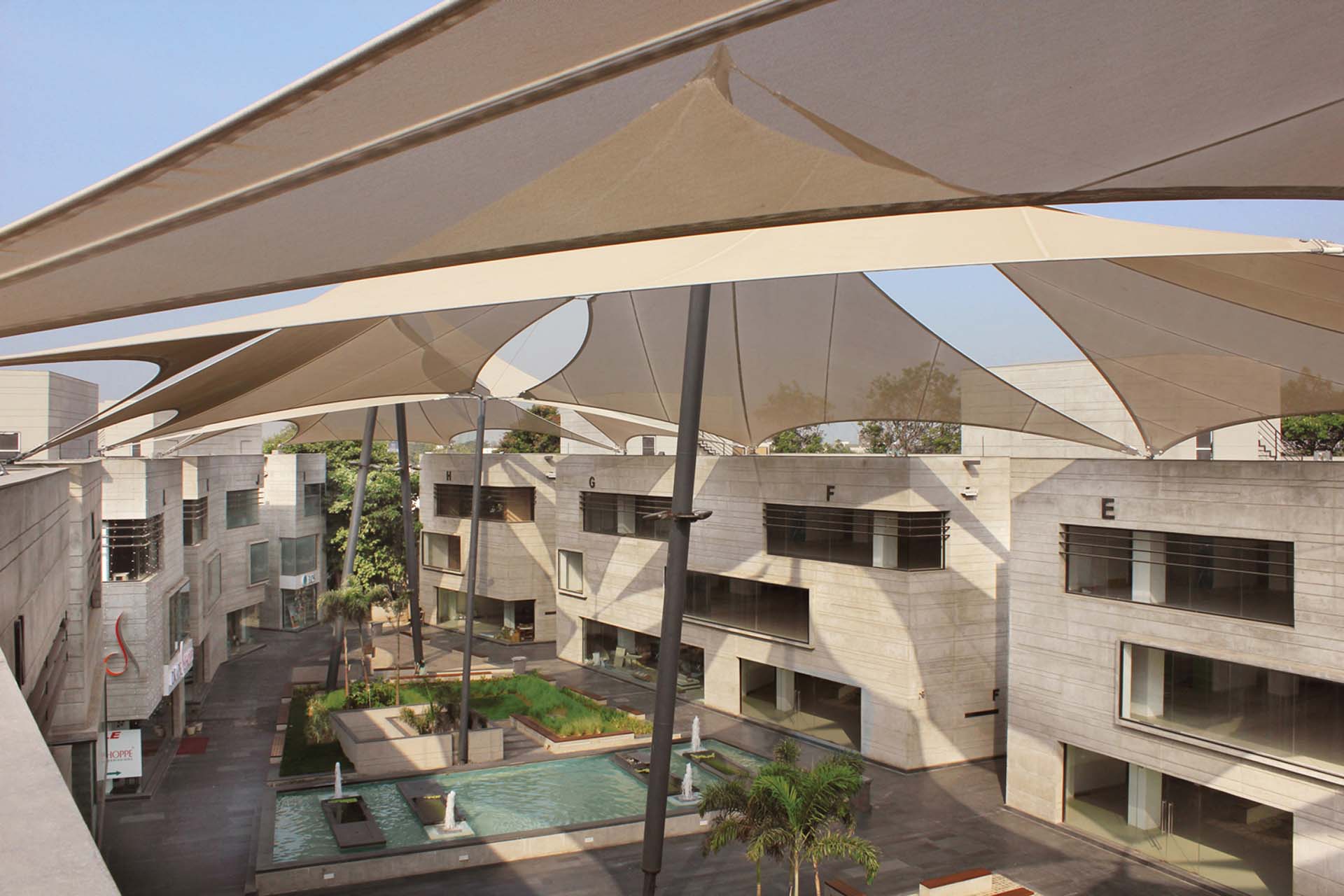 In addition to the hot spot location in an economically flourishing district, this attracts premium and luxury brands. Additionally, the retail park is a place of contemplation and relaxing. blocher partners India realised a grand central plaza and an embedded park landscape with water gardens and places to rest. Tenderly shaded by large-size sails, this place makes sure that family, leisure and shopping are successfully united within this unique complex.1.